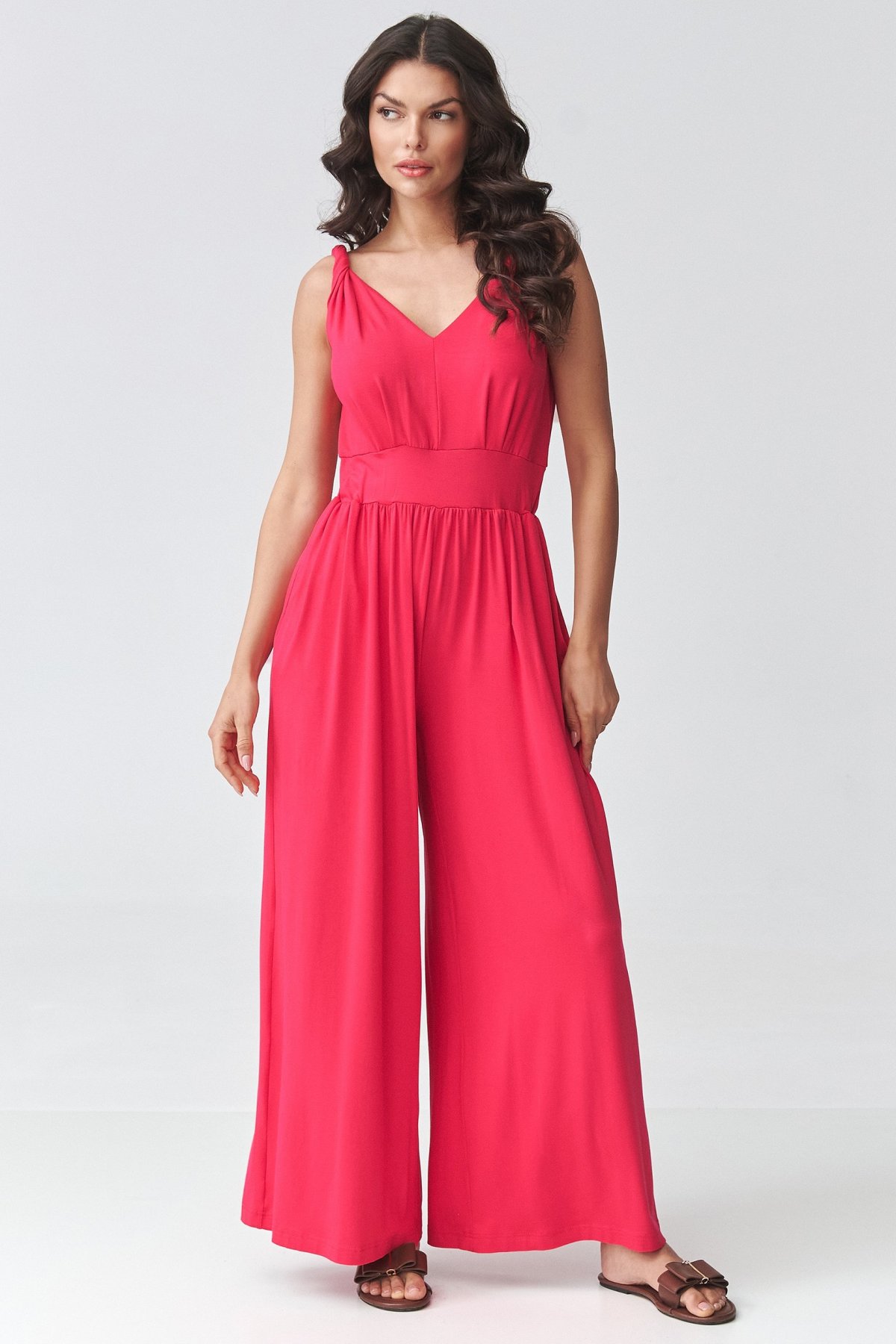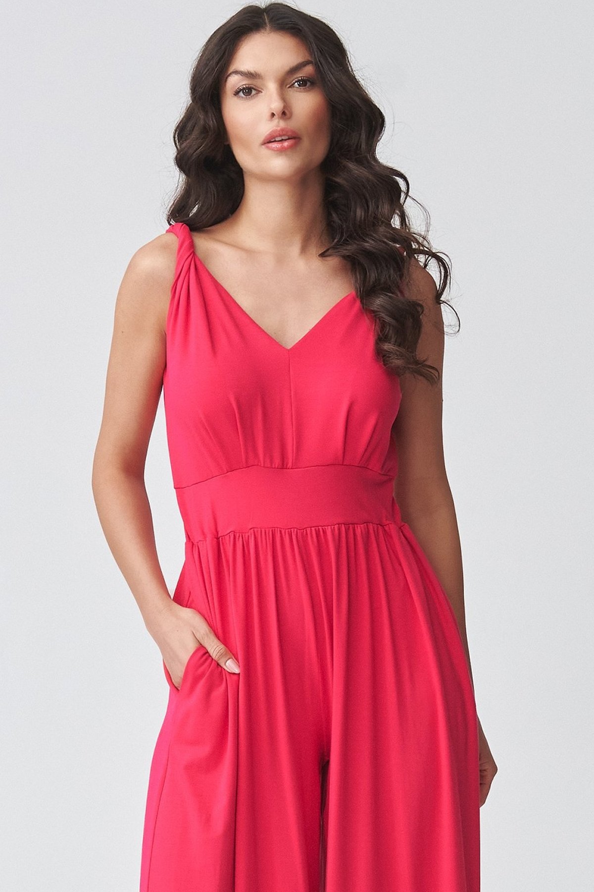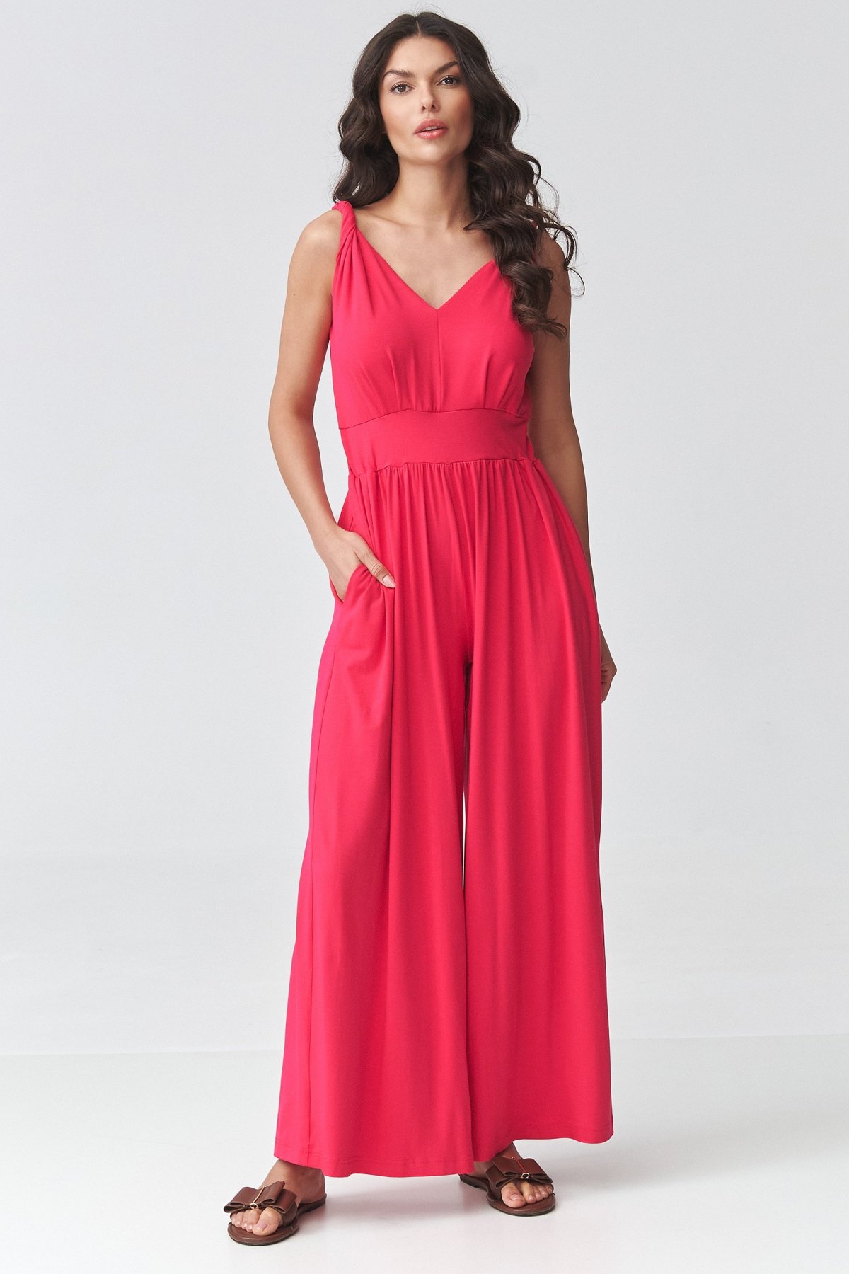 Kousek, který spojuje čistou linii s pohodlím při nošení. Výstřih do tvaru písmene V opticky prodlužuje horní část siluety a zvýrazněný pas pomáhá vytvořit vyvážené proporce bez zbytečné strojenosti. Lehký splývavý materiál se na postavě měkce ukládá a díky širokým nohavicím působí celek vzdušně a uvolněně. Právě proto se overal hodí jak na běžný den, tak na chvíle, kdy chcete zvolit upravenější outfit bez složitého kombinování. Stačí přidat sandály pro lehčí letní vzhled nebo podpatky pro výraznější, elegantnější dojem.