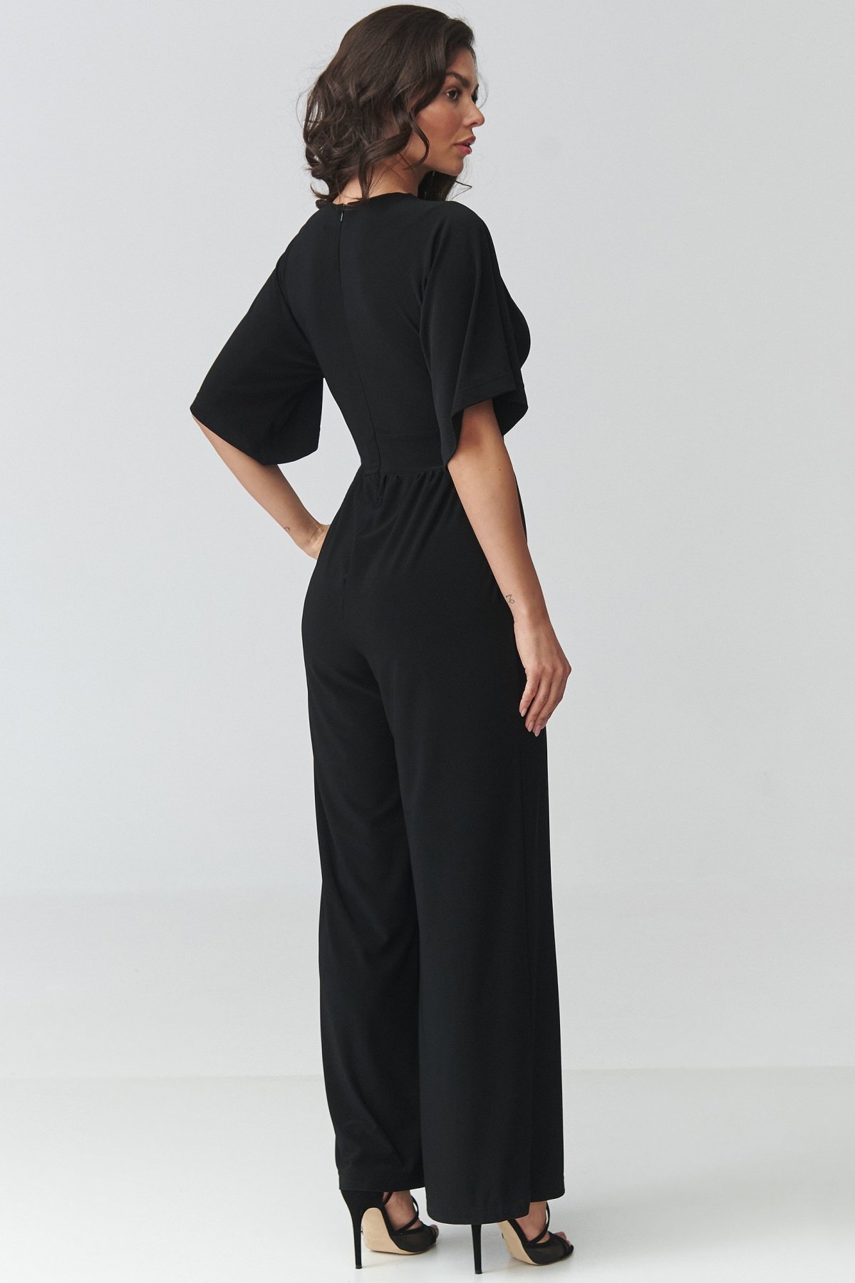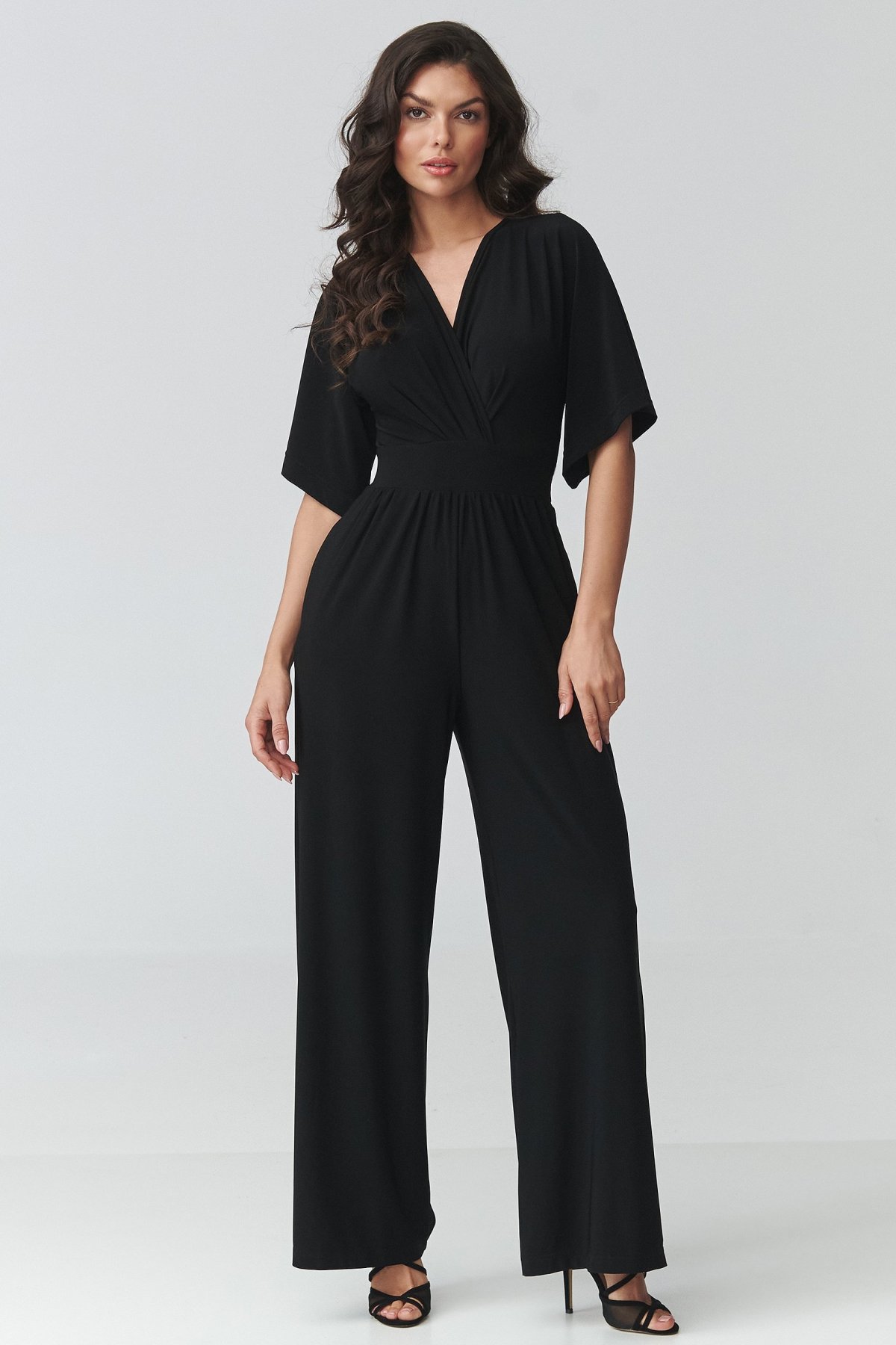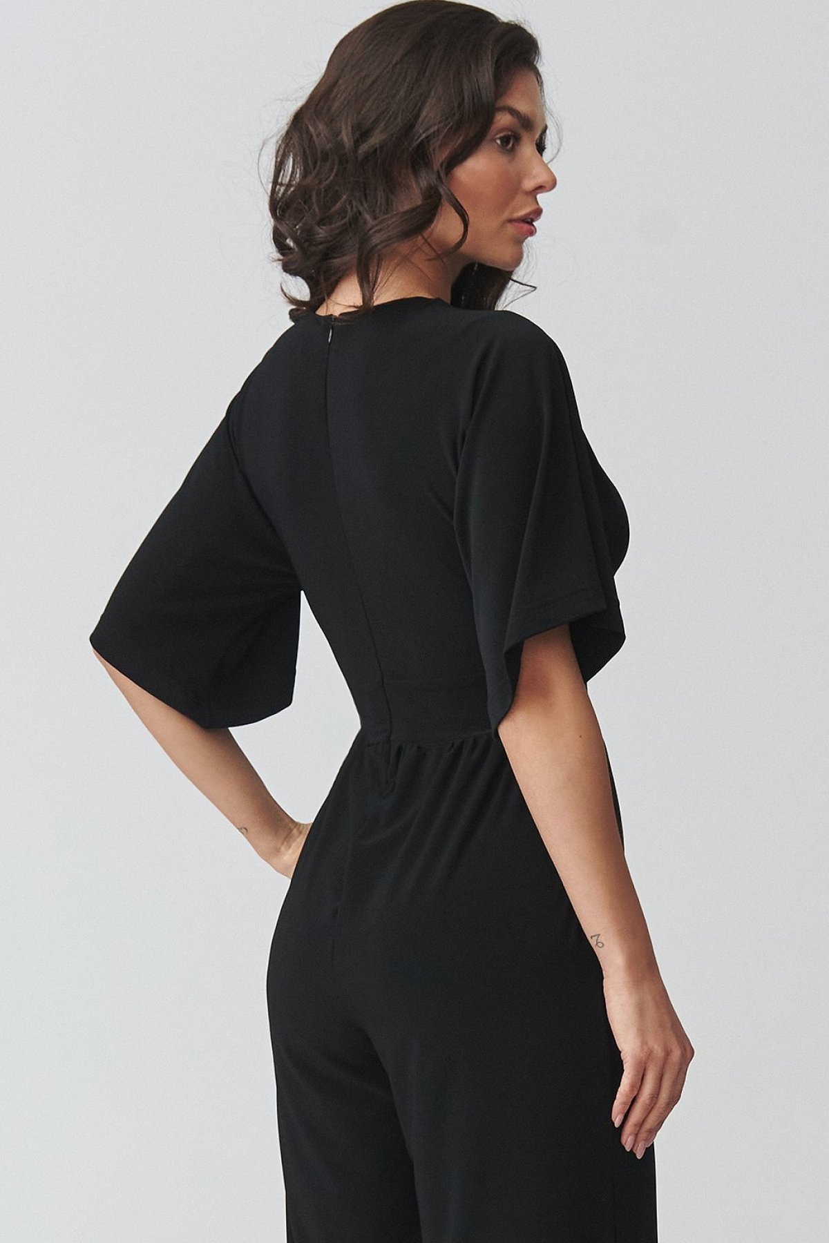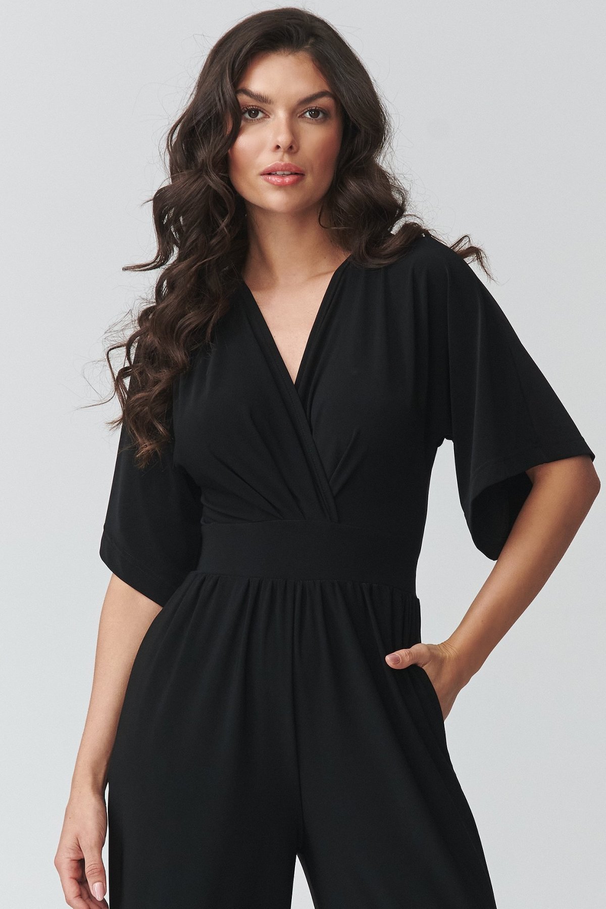 Dámský overal černé barvy v sobě spojuje elegantní vzhled a pohodlí při nošení. Obálkový výstřih jemně zvýrazňuje horní linii postavy, zatímco projmutí v pase pomáhá vytvarovat vyváženou siluetu. Široké nohavice dodávají modelu moderní výraz a zároveň přinášejí přirozenou volnost pohybu. Kratší rukávy zvyšují komfort při nošení a praktické kapsy podtrhují funkční stránku celého střihu. Tento kousek se hodí na rodinné oslavy, pracovní setkání i večerní příležitosti, kdy chcete působit upraveně, ale cítit se uvolněně. Je skvělou alternativou ke klasickým šatům.