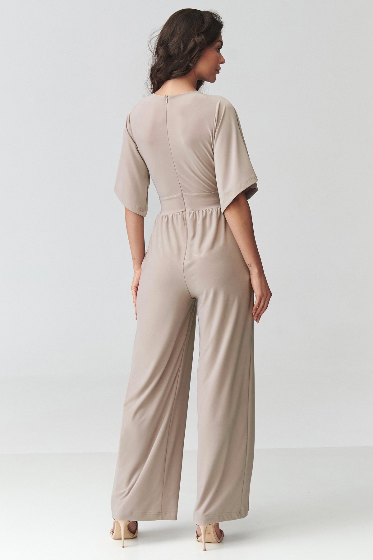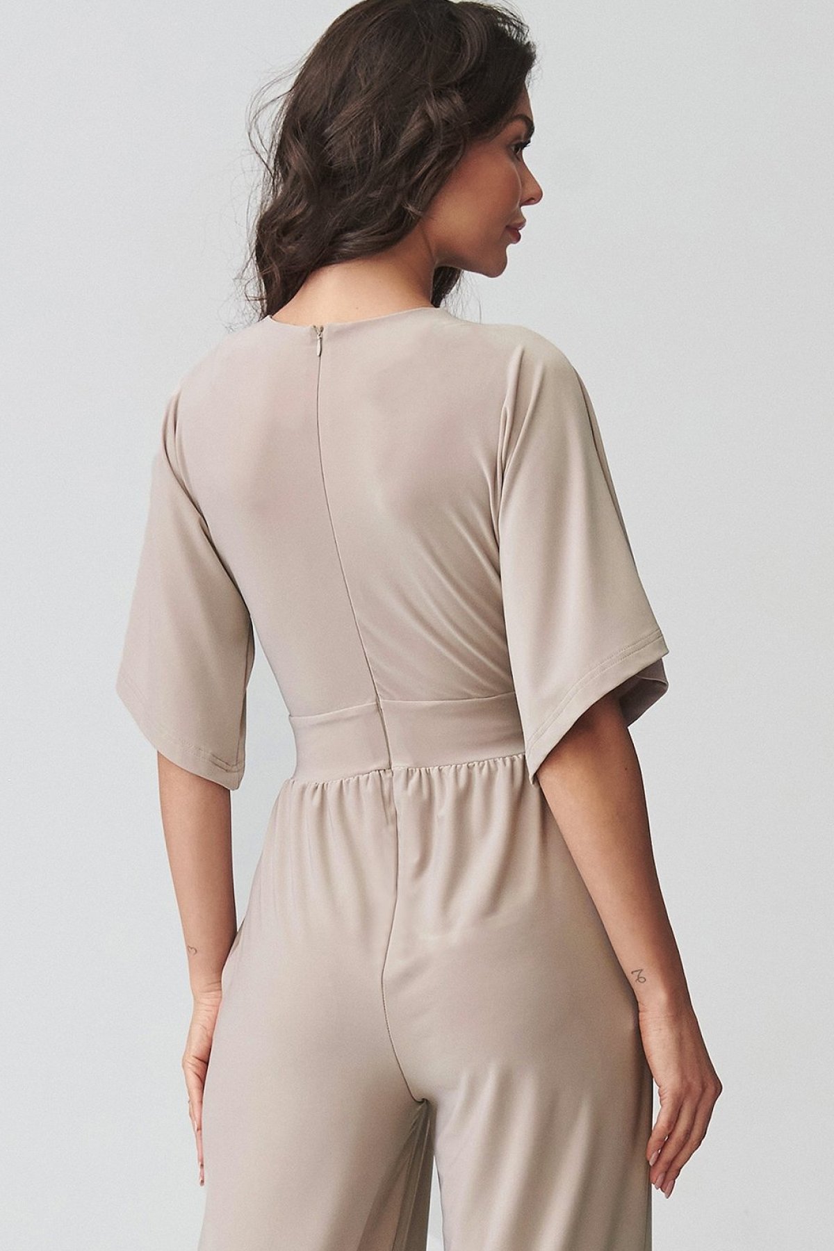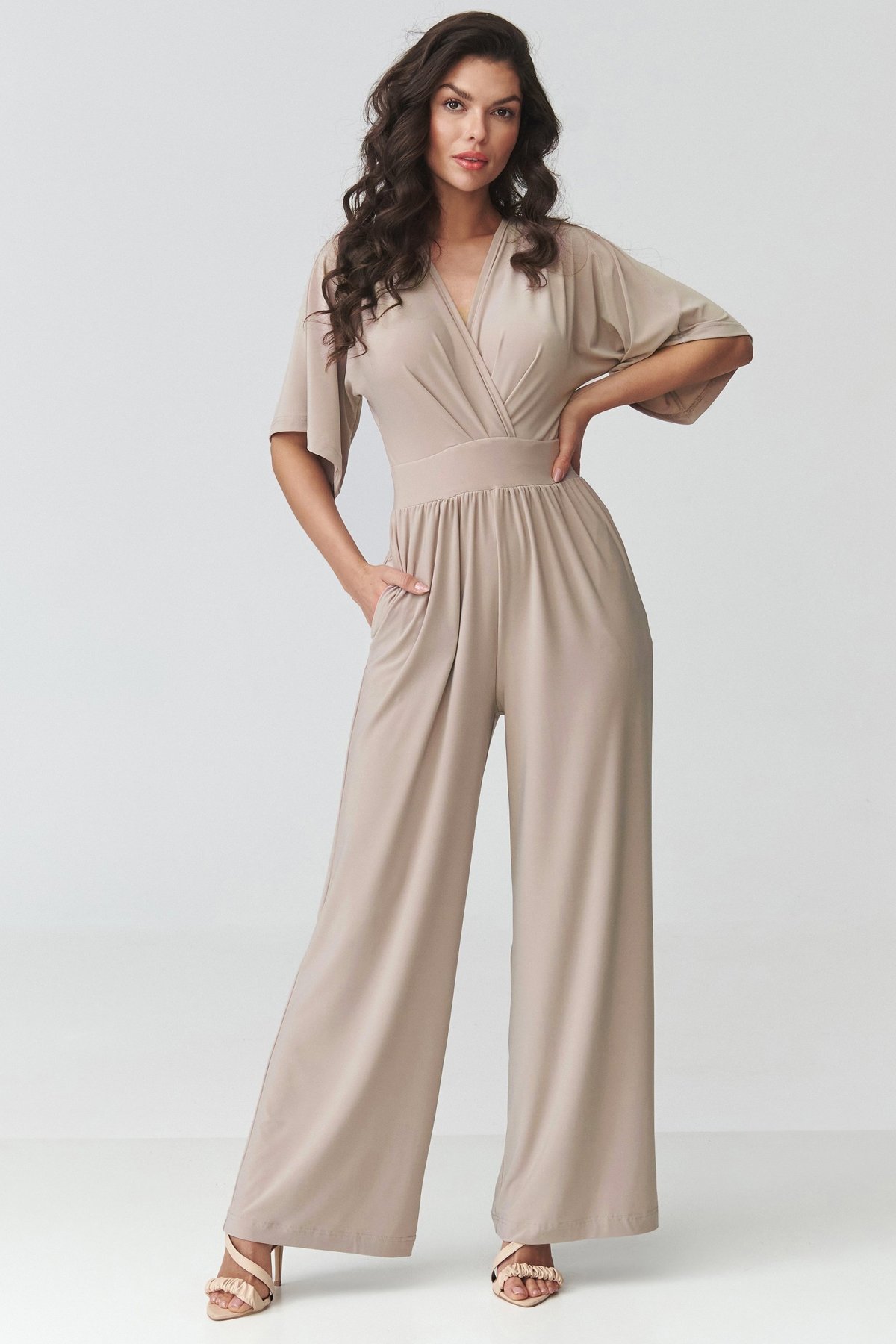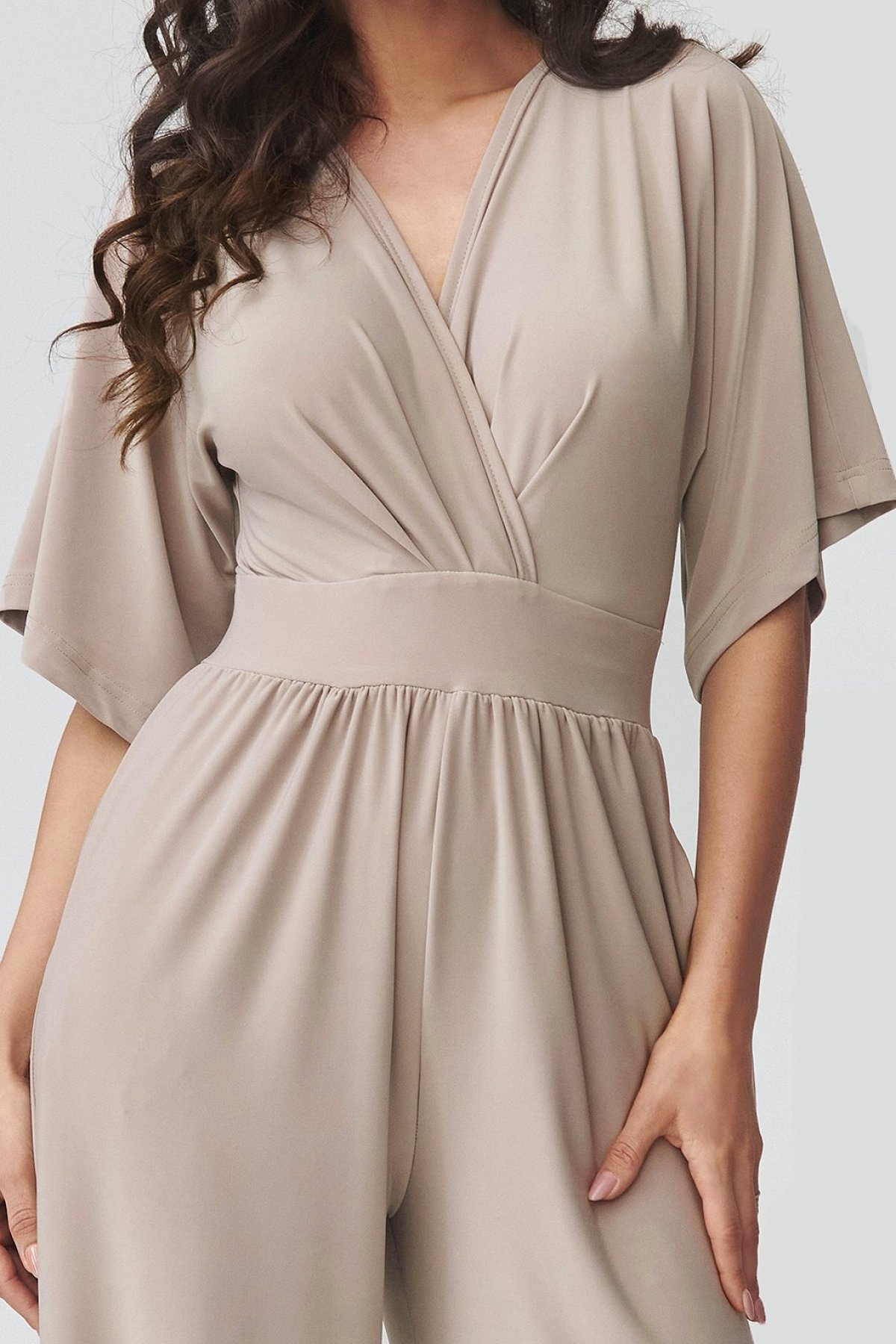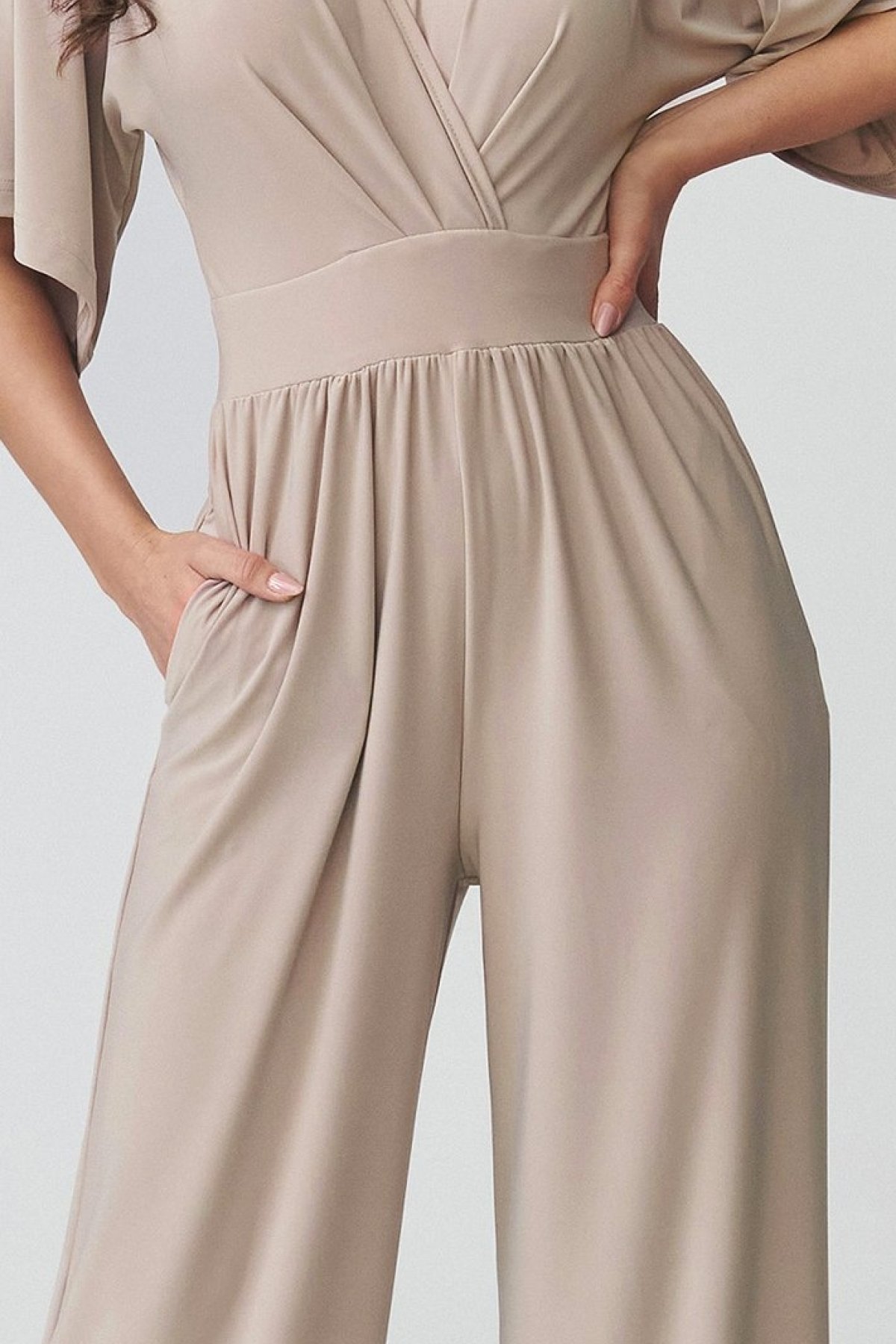 Dámský overal světle béžové barvy v sobě spojuje elegantní vzhled a pohodlí při nošení. Obálkový výstřih jemně zvýrazňuje horní linii postavy, zatímco projmutí v pase pomáhá vytvarovat vyváženou siluetu. Široké nohavice dodávají modelu moderní výraz a zároveň přinášejí přirozenou volnost pohybu. Kratší rukávy zvyšují komfort při nošení a praktické kapsy podtrhují funkční stránku celého střihu. Tento kousek se hodí na rodinné oslavy, pracovní setkání i večerní příležitosti, kdy chcete působit upraveně, ale cítit se uvolněně. Je skvělou alternativou ke klasickým šatům.