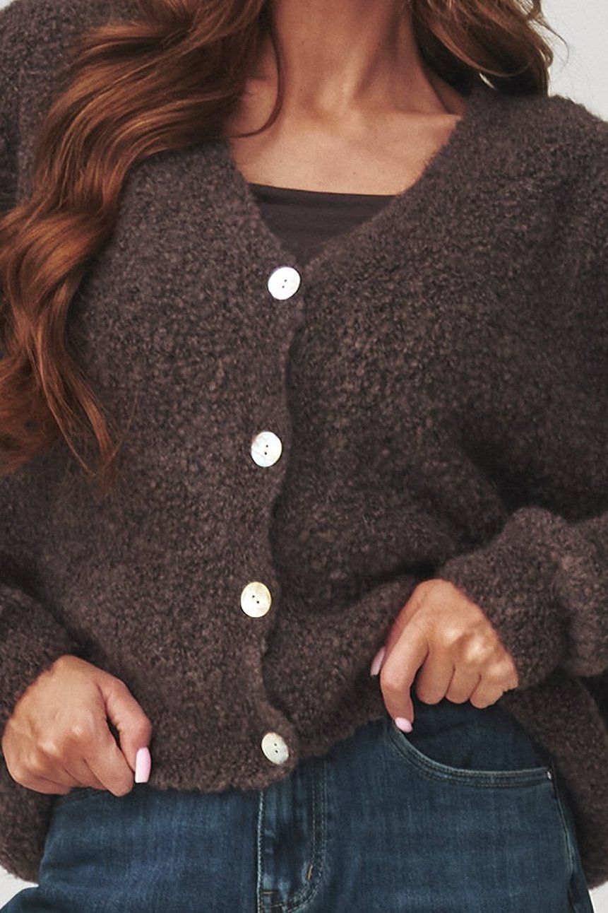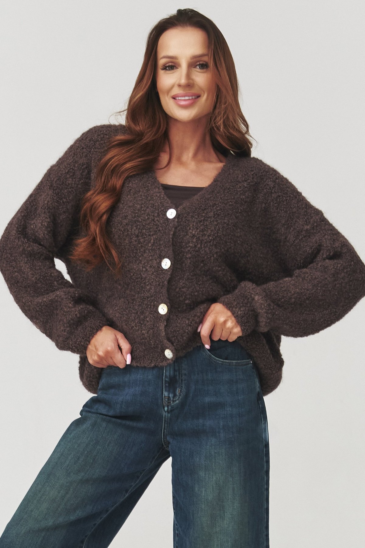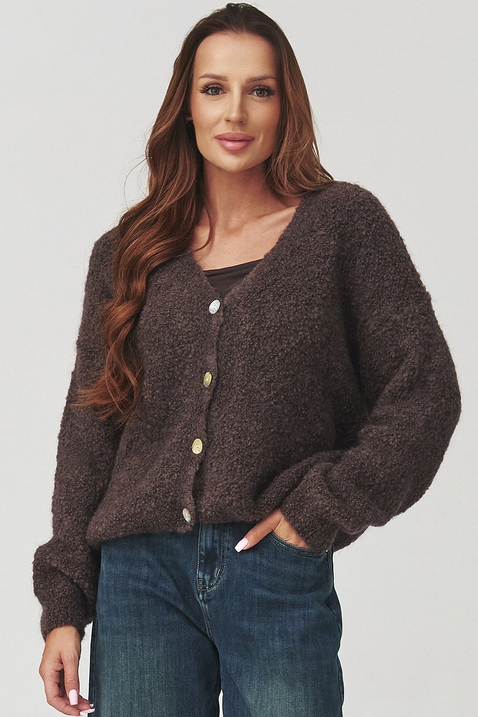 Vyrobený z měkké, nadýchané příze s podílem moheru a vlny. Spolehlivě vás zahřeje i v chladných dnech. Klasický střih se zapínáním na knoflíky doplňují volné rukávy a spadlá ramena, díky nimž svetr působí ležérně, ale zároveň velmi žensky. Jemná textura a tmavě hnědý odstín dodávají outfitu hřejivý, podzimní charakter. Skvěle se kombinuje s džíny, sukní i šaty — ideální do práce, na víkendový výlet nebo pohodlné vrstvení během zimy. Tento svetr je univerzálním základem šatníku, který se nikdy neomrzí.