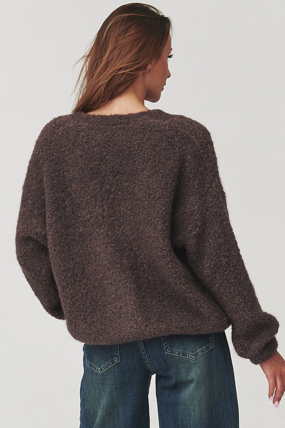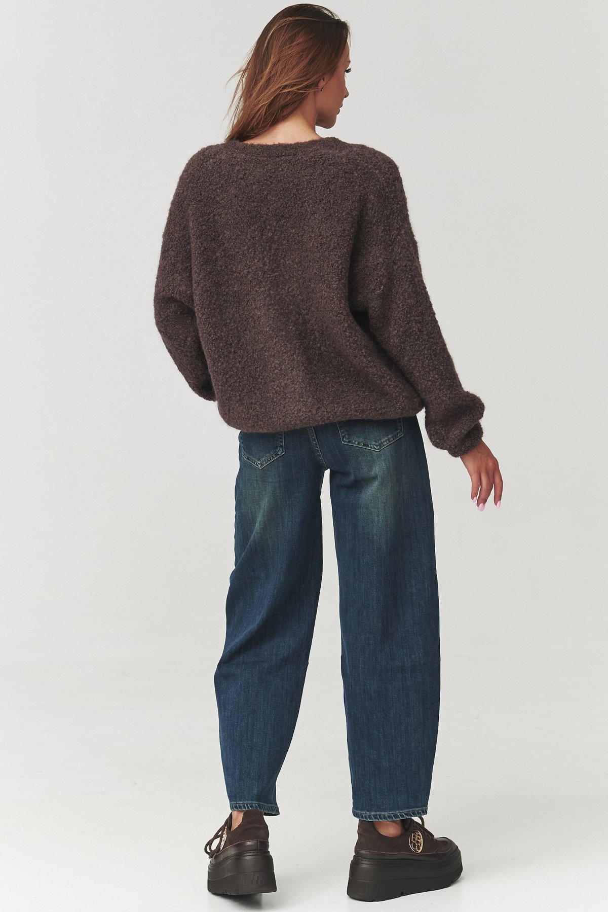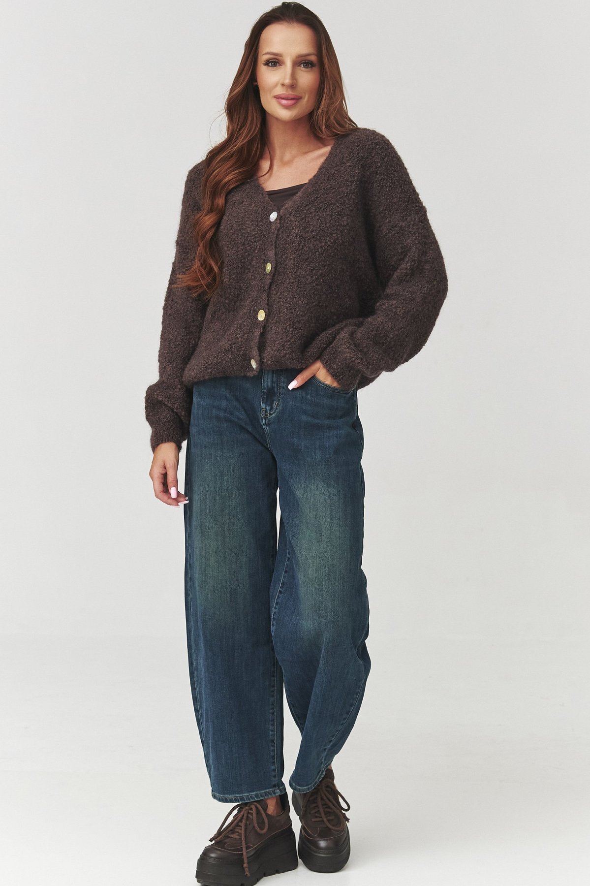 Vyrobený z měkké, nadýchané příze s podílem moheru a vlny. Spolehlivě vás zahřeje i v chladných dnech. Klasický střih se zapínáním na knoflíky doplňují volné rukávy a spadlá ramena, díky nimž svetr působí ležérně, ale zároveň velmi žensky. Jemná textura a tmavě hnědý odstín dodávají outfitu hřejivý, podzimní charakter. Skvěle se kombinuje s džíny, sukní i šaty — ideální do práce, na víkendový výlet nebo pohodlné vrstvení během zimy. Tento svetr je univerzálním základem šatníku, který se nikdy neomrzí.