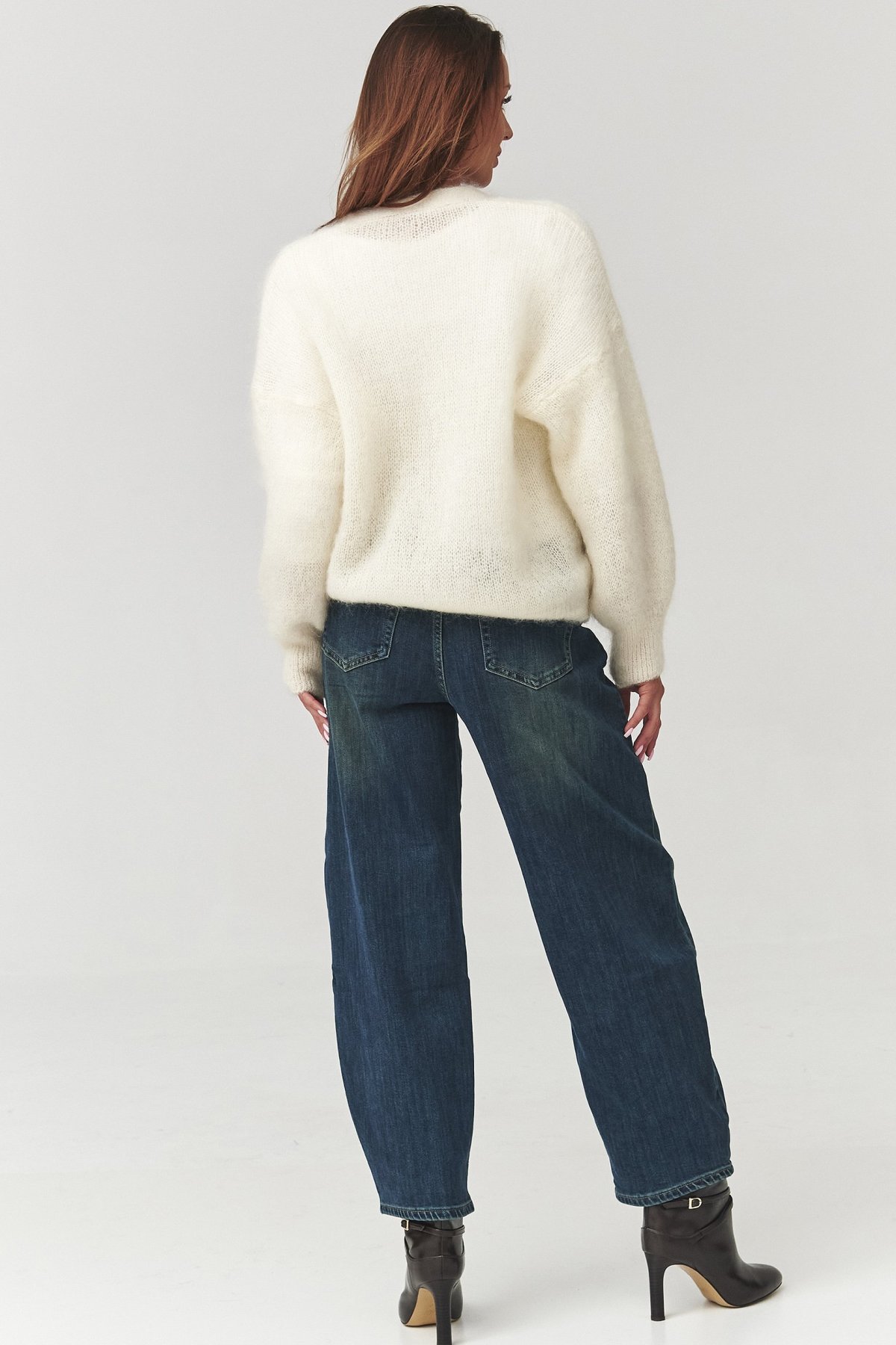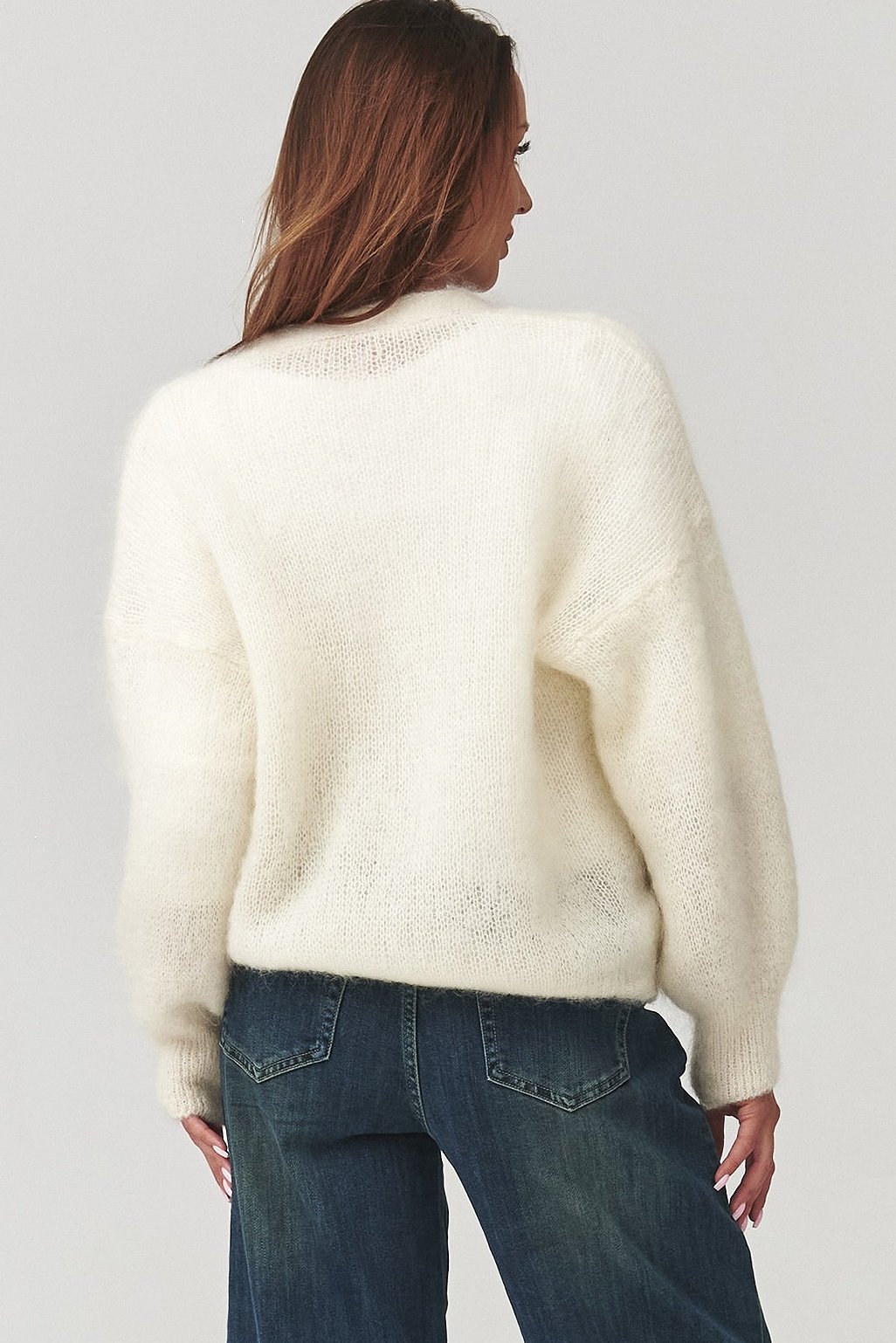 Dámský svetr v ecru odstínu na knoflíky. Hřejivý, nadýchaný a elegantní model, který nesmí chybět v žádném ženském šatníku.