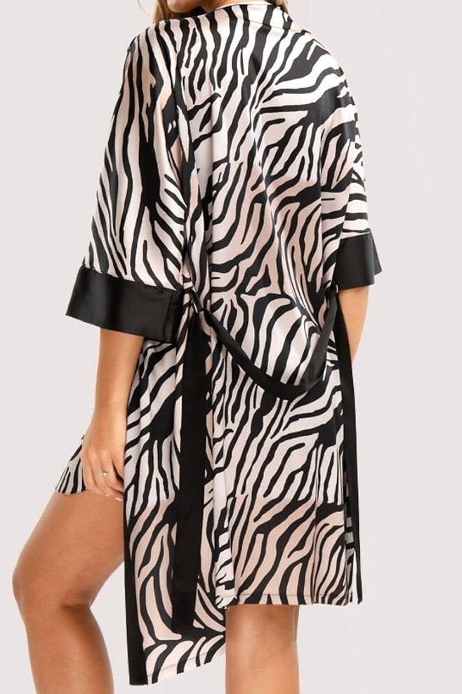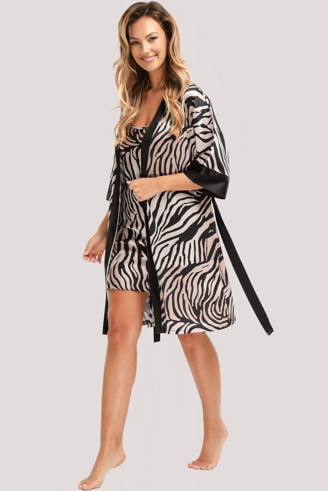 Je vyrobený z lehké saténové látky s jemným leskem, působí luxusně a příjemně chladí na pokožce. Krátký střih a volné 3/4 rukávy dodávají modelu vzdušnost, zatímco pásek v pase umožňuje zvýraznit siluetu. Celoživotně oblíbený zvířecí vzor v kombinaci s černým lemováním vytváří stylový kontrast a podtrhuje ženský charakter modelu. Tento župan je ideální pro večerní relax, přípravu na slavnostní událost nebo jako elegantní doplněk ke košilce ze stejné kolekce Braga. Lehký, pohodlný a nesmírně ženský.