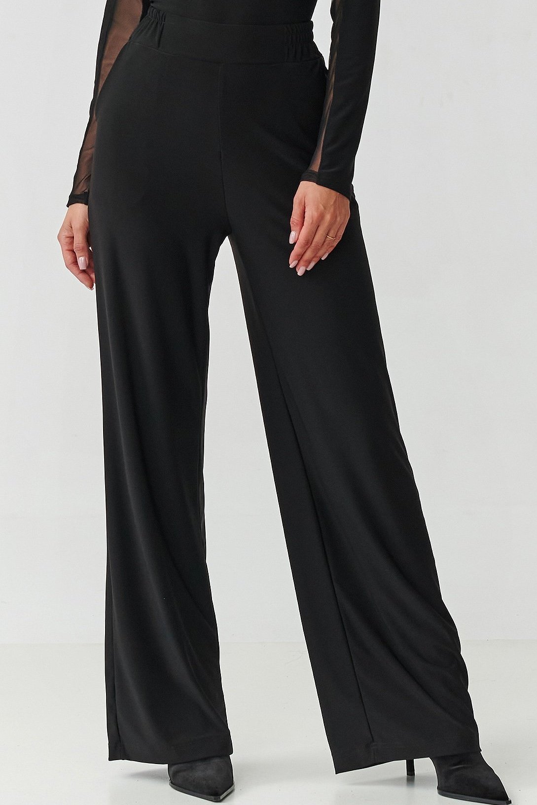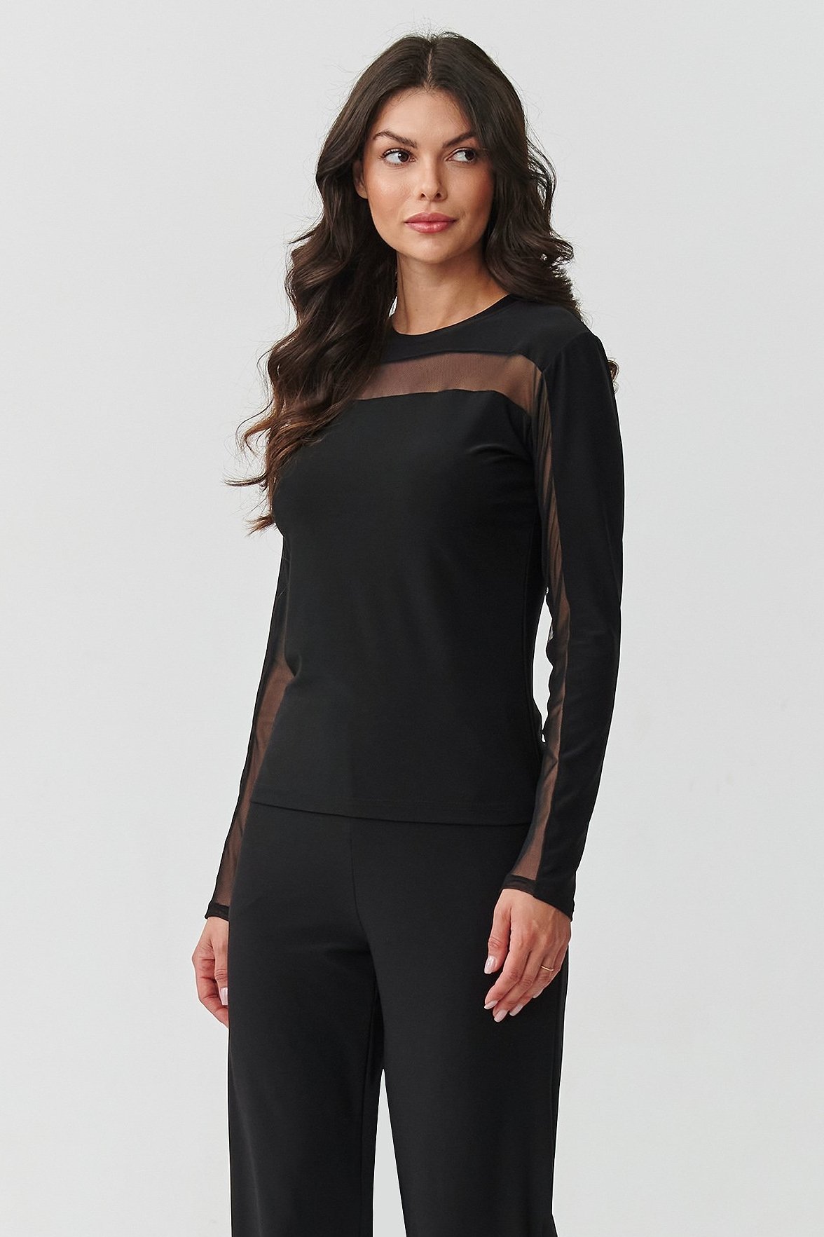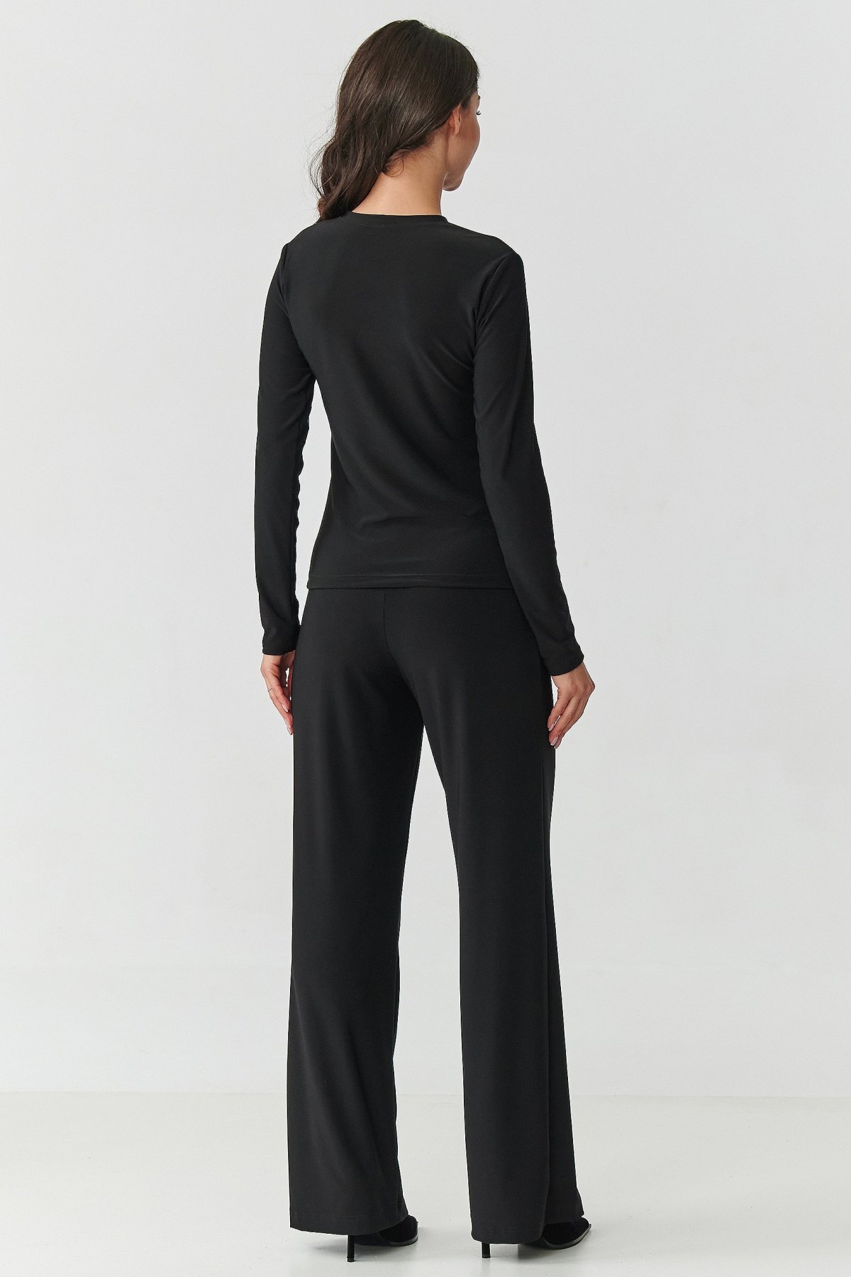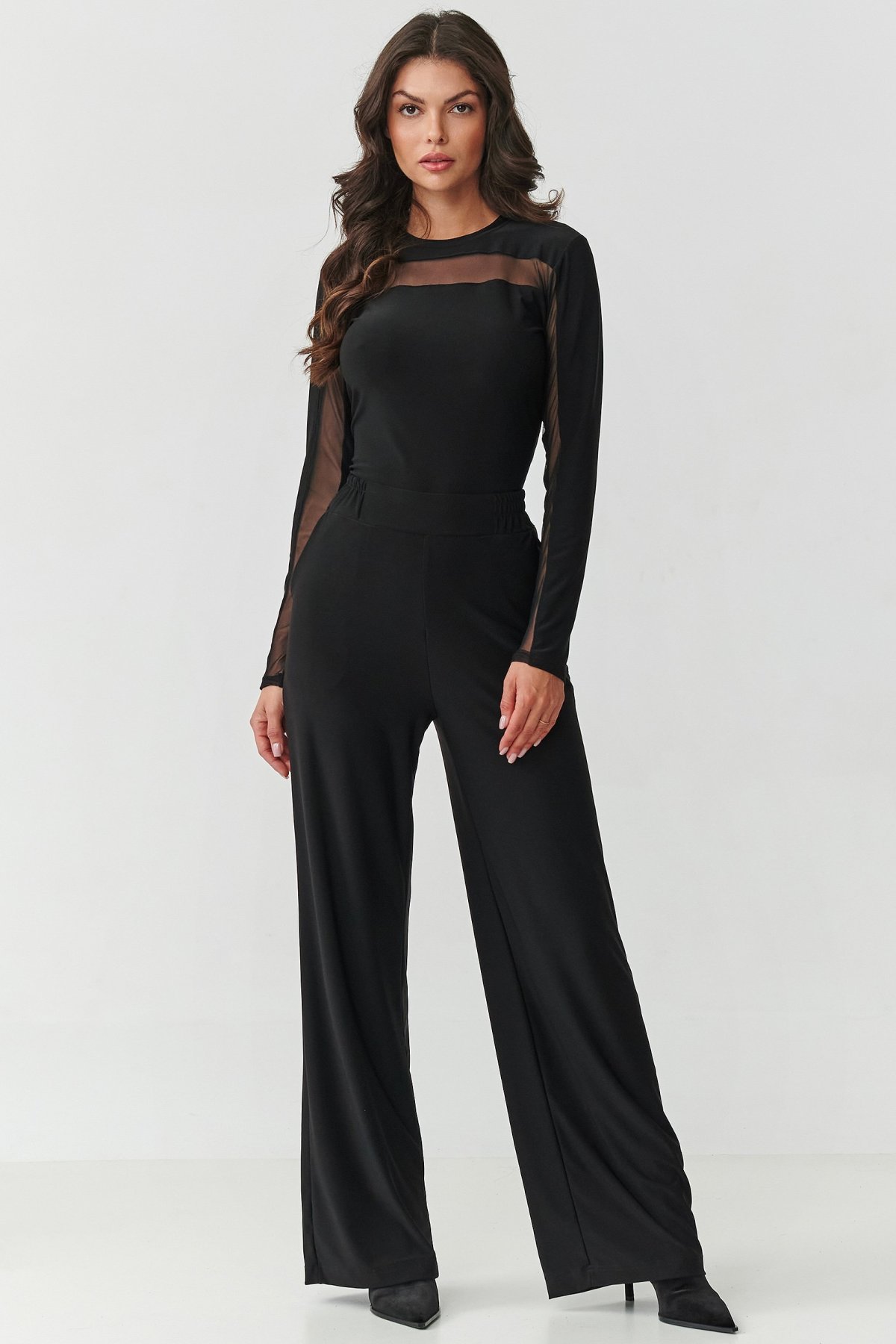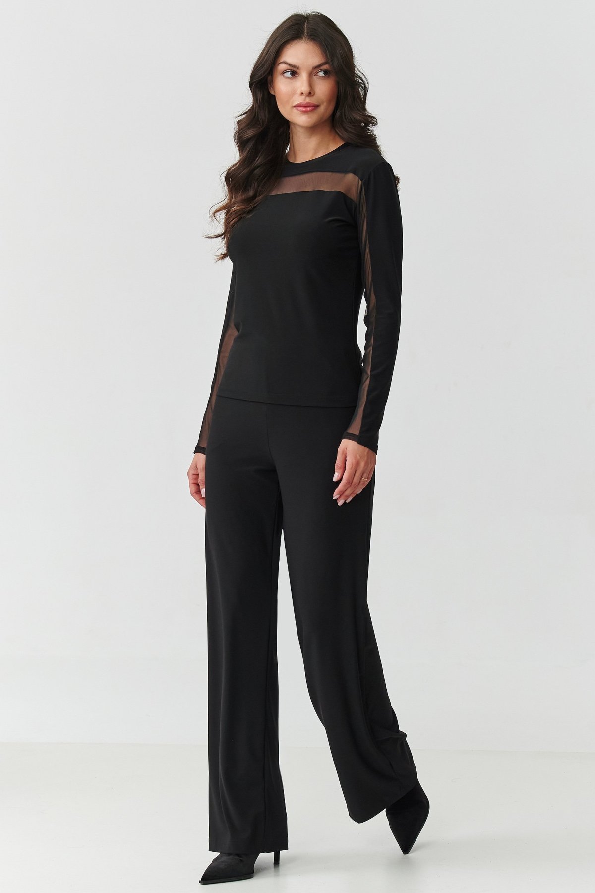 Vsaďte na eleganci v moderním provedení! Tento černý dámský komplet je kombinací pohodlí a nadčasového stylu. Skládá se z přiléhavé halenky s dlouhým rukávem a kalhot se širokými nohavicemi, které tvoří soudržný, elegantní celek. Halenka s jemnými průsvitnými vsadkami na výstřihu a rukávech dodává lehkost a smyslný charakter, zatímco kulatý výstřih jemně zdůrazňuje krk a ramena a zároveň zajišťuje pohodlí při každodenním nošení. Kalhoty mají vysoký pas, který krásně zdůrazňuje a prodlužuje postavu. Nohavice jsou široké a volně splývající, což dodává celku lehkost a dělá tak kalhoty mimořádně pohodlnými na nošení. Černá barva je klasika, která nikdy nevyjde z módy – opticky zeštíhluje postavu a dodává eleganci. Tento originální dámský komplet je nutností v šatníku každé ženy, která ráda vypadá moderně a zároveň se cítí pohodlně. Zkombinujte jej s oblíbenými lodičkami nebo kotníčkovými botami a vytvoříte look, který ohromí v každé situaci.