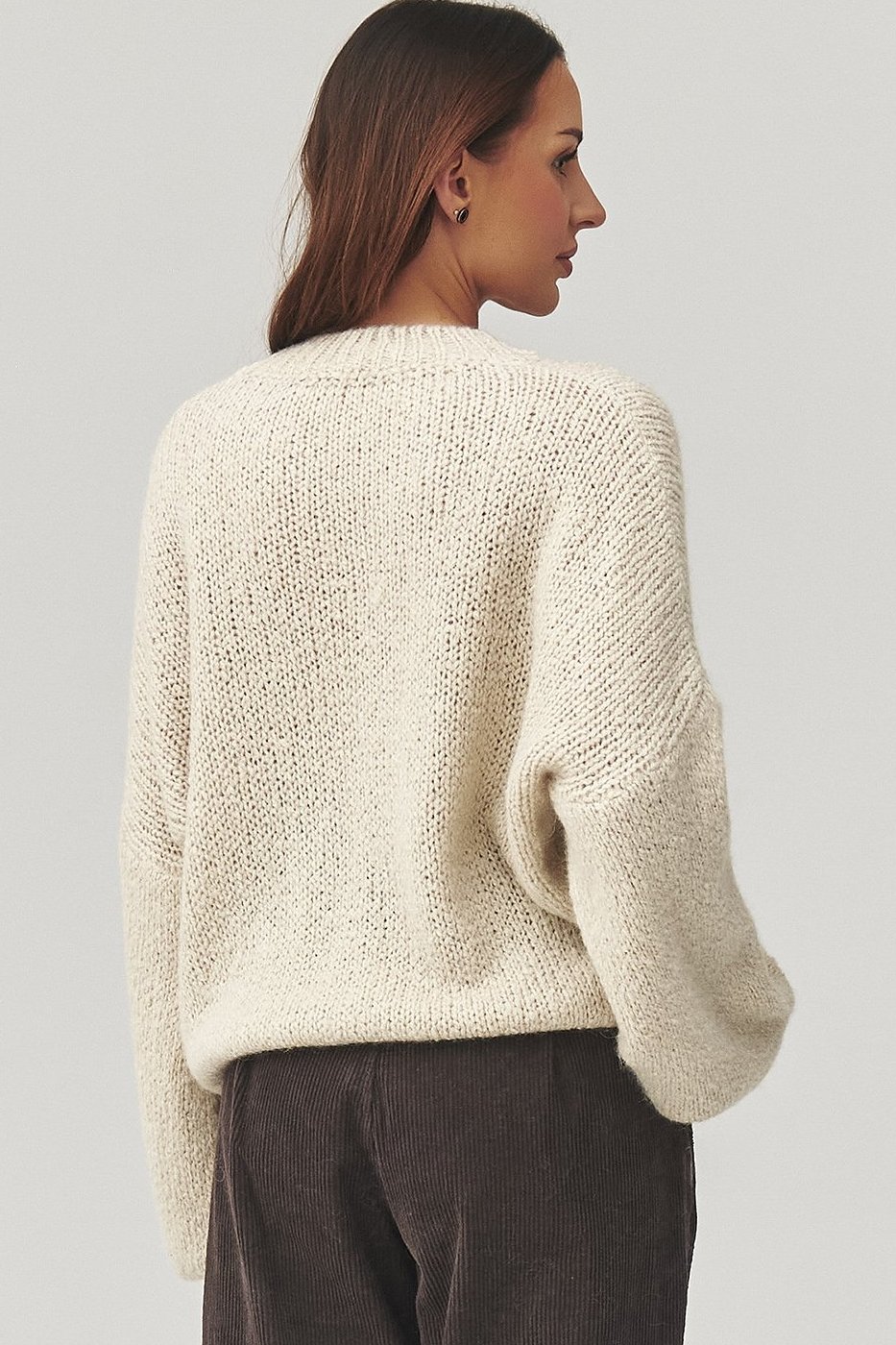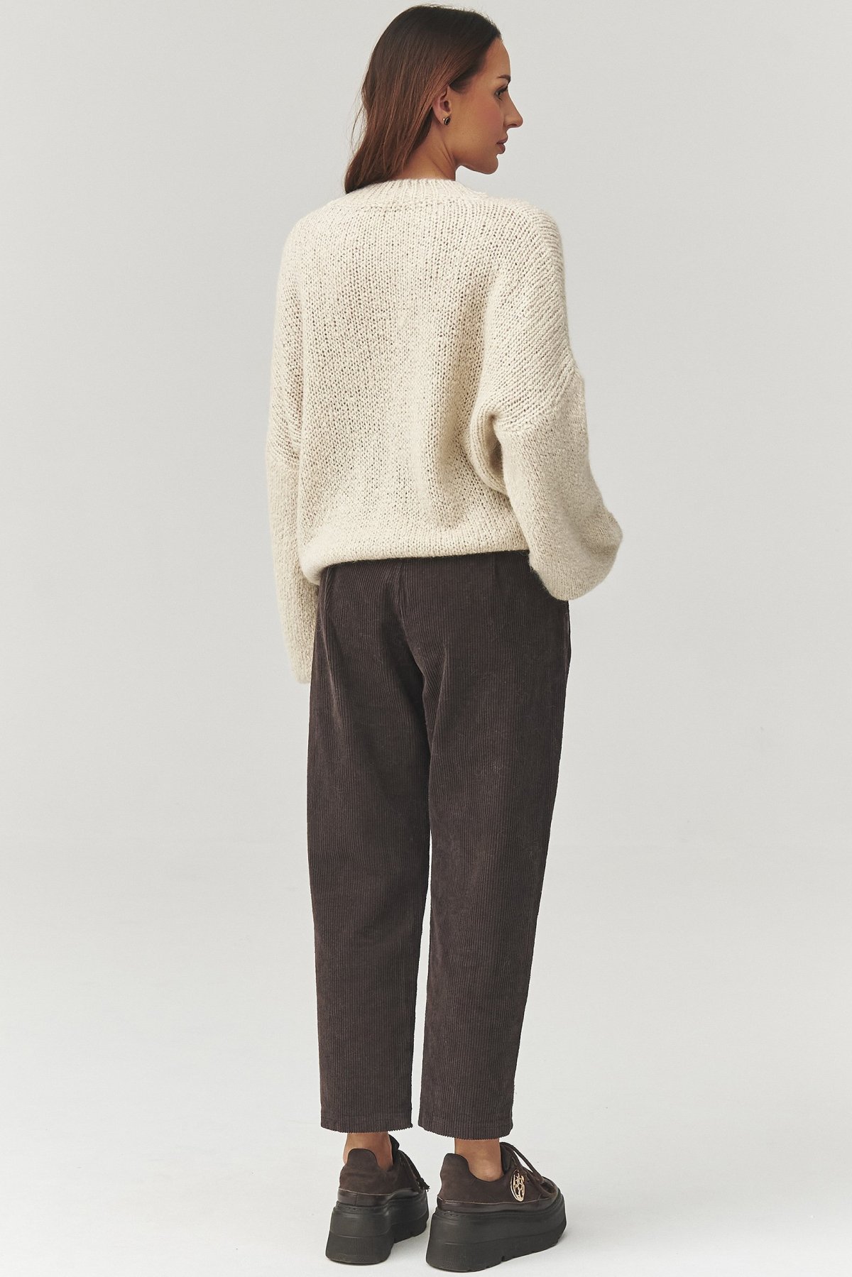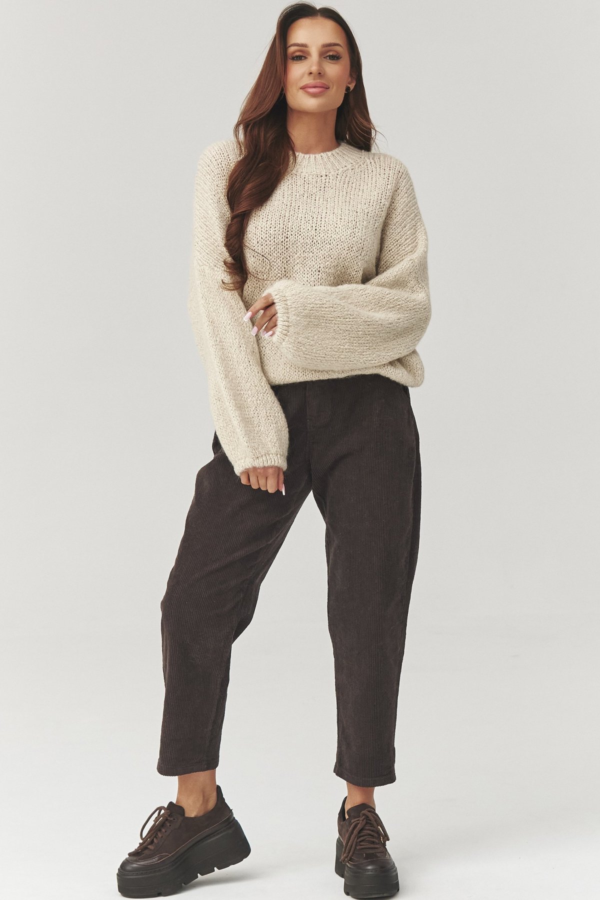 Dámský svetr ve světle béžovém odstínu je dokonalým spojením pohodlí a ženské elegance. Jeho volný oversize střih lichotí různým typům postavy a poskytuje naprostou volnost pohybu. Vyroben z měkkého, hřejivého materiálu, příjemně zahřeje v chladnějších dnech a zároveň je prodyšný. Klasický kulatý výstřih a minimalistický design umožňují snadné kombinování – svetr se skvěle hodí k džínům, legínám i sukním. Univerzální velikost se krásně přizpůsobí postavě a vytvoří moderní, ležérní siluetu. Tento model je ideální pro každodenní outfit i víkendový odpočinek – stylový, měkký a nesmírně komfortní.