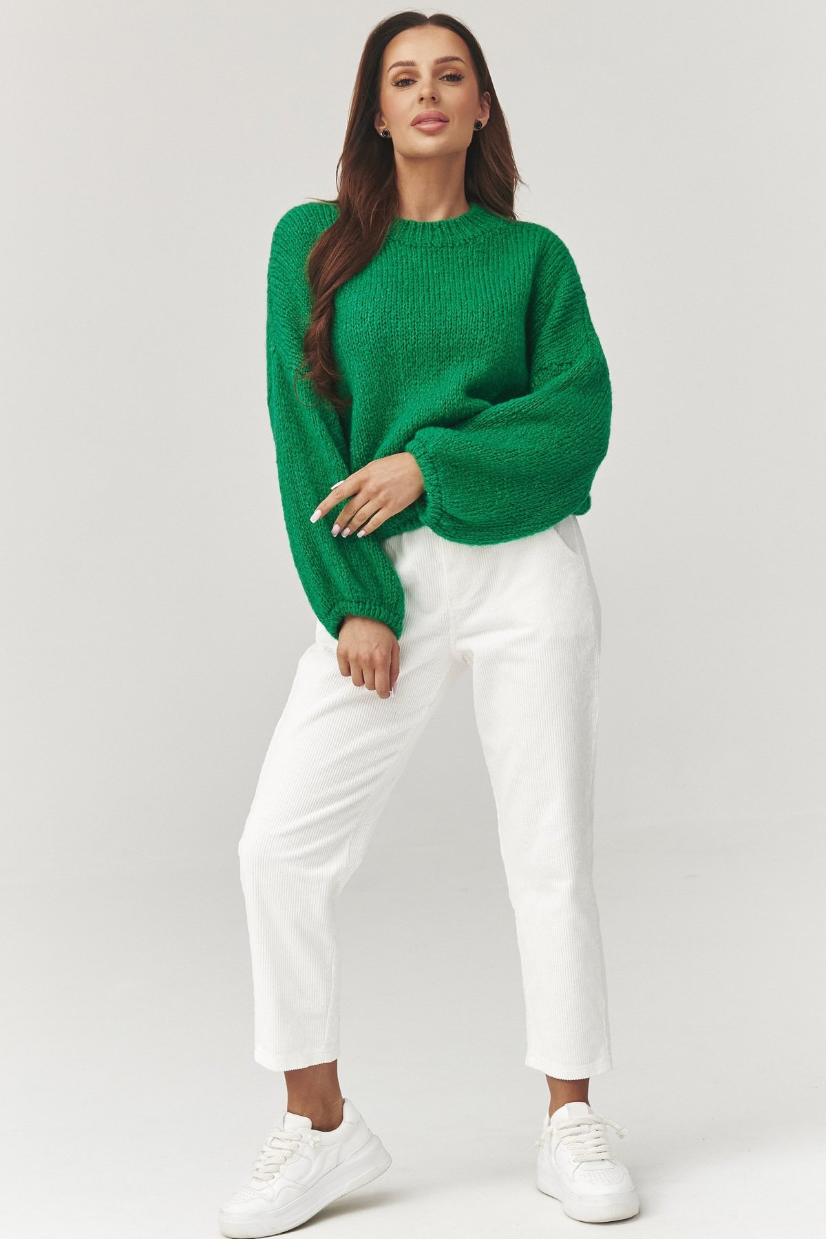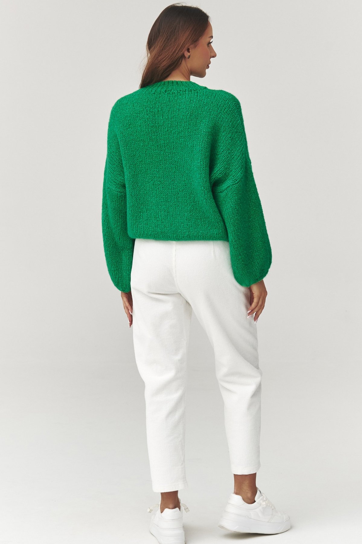 Dámský svetr v zeleném odstínu je dokonalým spojením pohodlí a ženské elegance. Jeho volný oversize střih lichotí různým typům postavy a poskytuje naprostou volnost pohybu. Vyroben z měkkého, hřejivého materiálu, příjemně zahřeje v chladnějších dnech a zároveň je prodyšný. Klasický kulatý výstřih a minimalistický design umožňují snadné kombinování – svetr se skvěle hodí k džínům, legínám i sukním. Univerzální velikost se krásně přizpůsobí postavě a vytvoří moderní, ležérní siluetu. Tento model je ideální pro každodenní outfit i víkendový odpočinek – stylový, měkký a nesmírně komfortní.