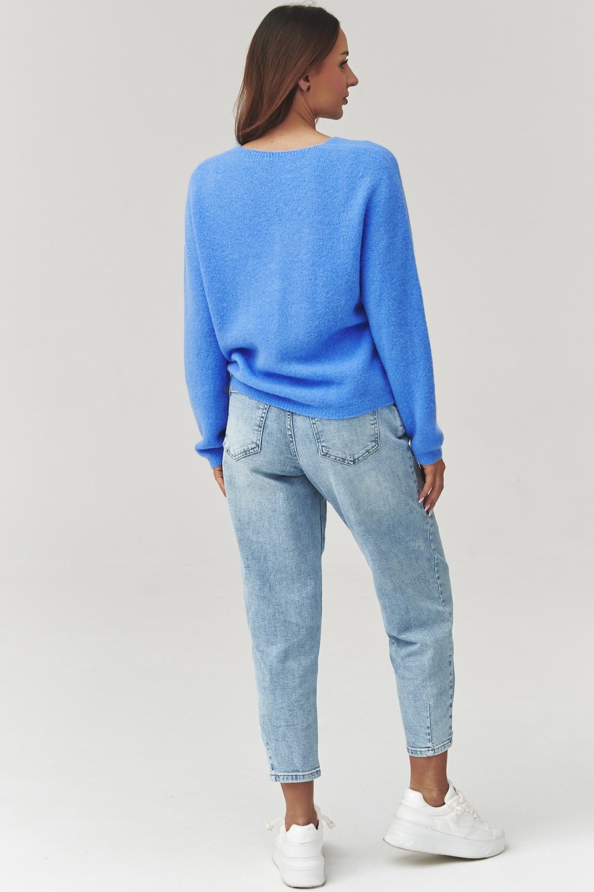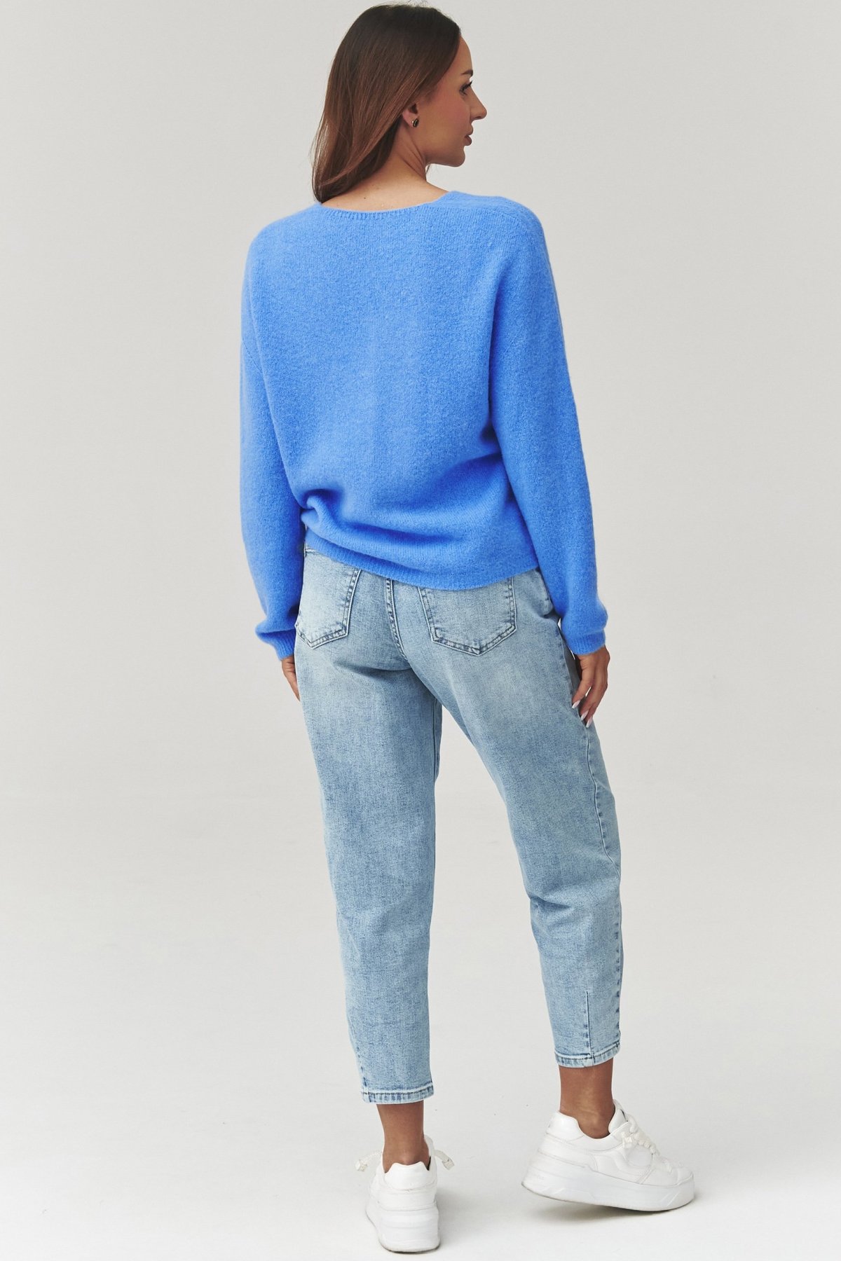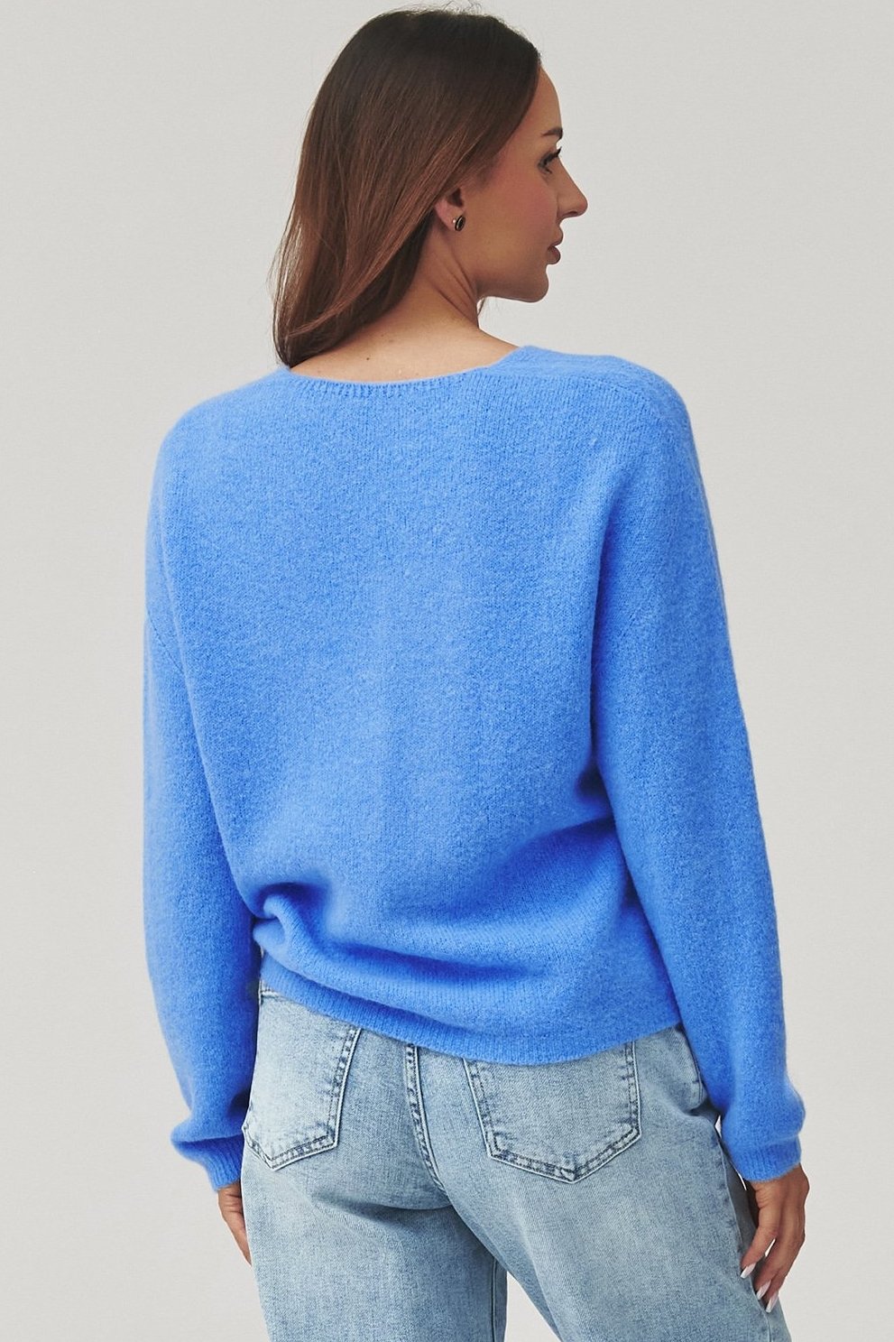 Stylový svetr v modrém odstínu spojuje nadčasovou eleganci a pohodlí. Jemná úpletová struktura je příjemná na dotek a dobře se přizpůsobuje tělu, zatímco výstřih do V a zapínání na knoflíky dodávají ženský, elegantní vzhled.