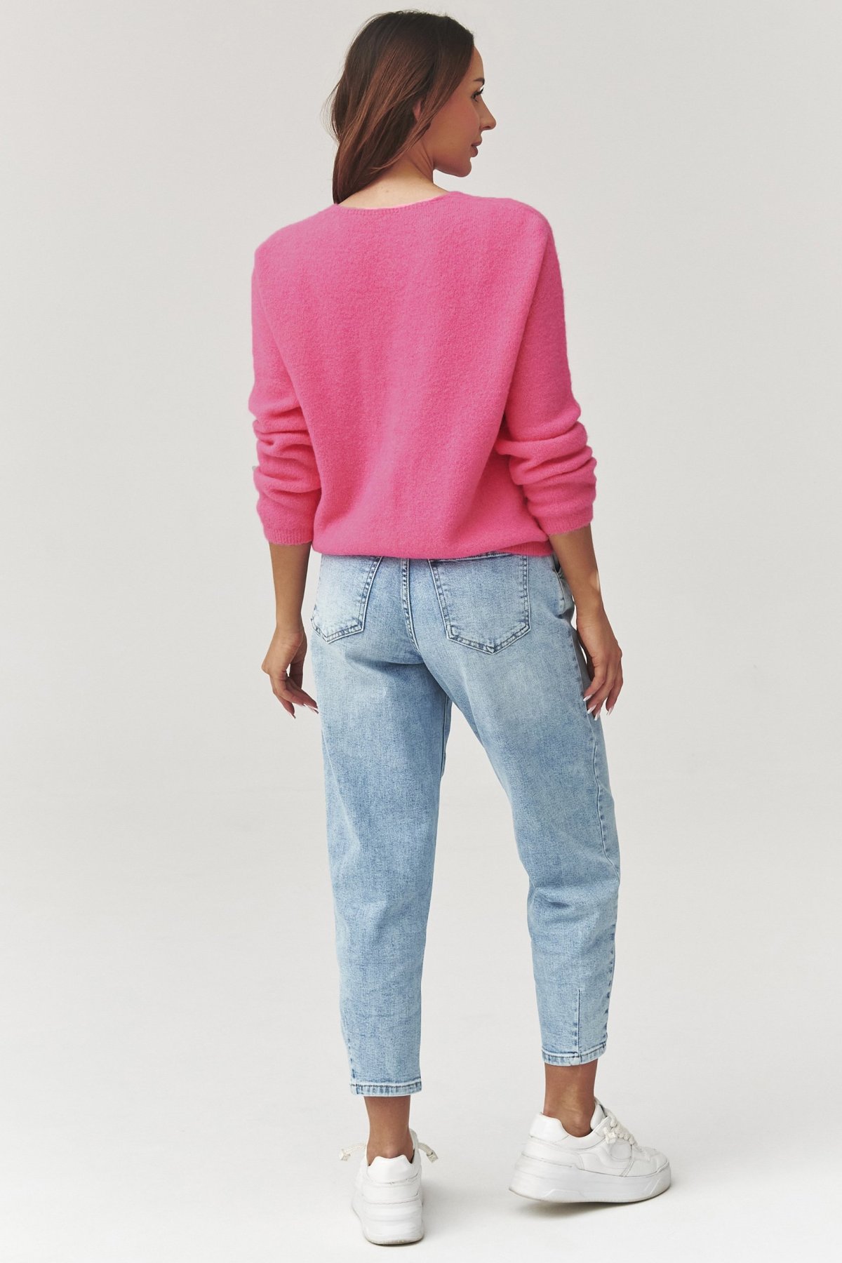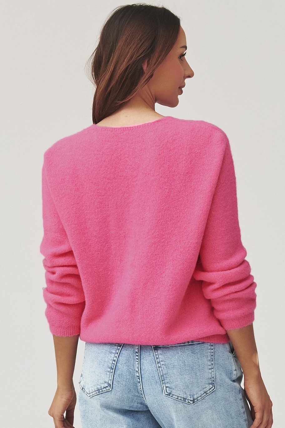 Stylový svetr v růžovém odstínu spojuje nadčasovou eleganci a pohodlí. Jemná úpletová struktura je příjemná na dotek a dobře se přizpůsobuje tělu, zatímco výstřih do V a zapínání na knoflíky dodávají ženský, elegantní vzhled.