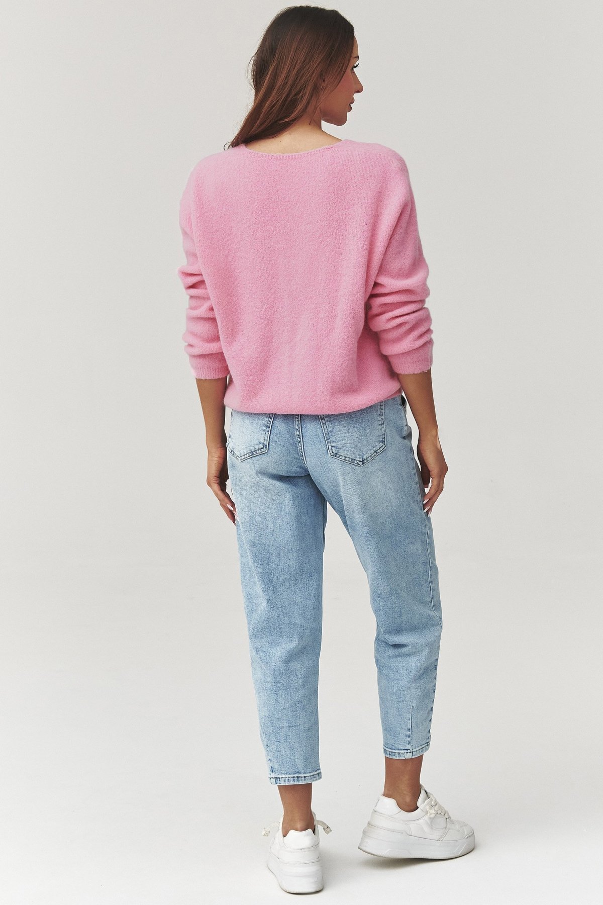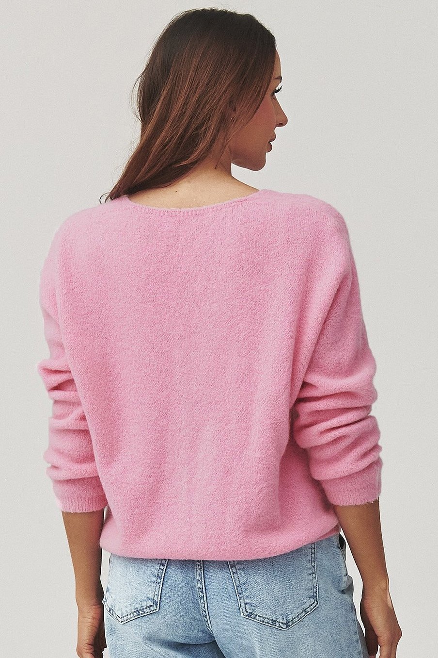 Stylový svetr ve světle růžovém odstínu spojuje nadčasovou eleganci a pohodlí. Jemná úpletová struktura je příjemná na dotek a dobře se přizpůsobuje tělu, zatímco výstřih do V a zapínání na knoflíky dodávají ženský, elegantní vzhled.