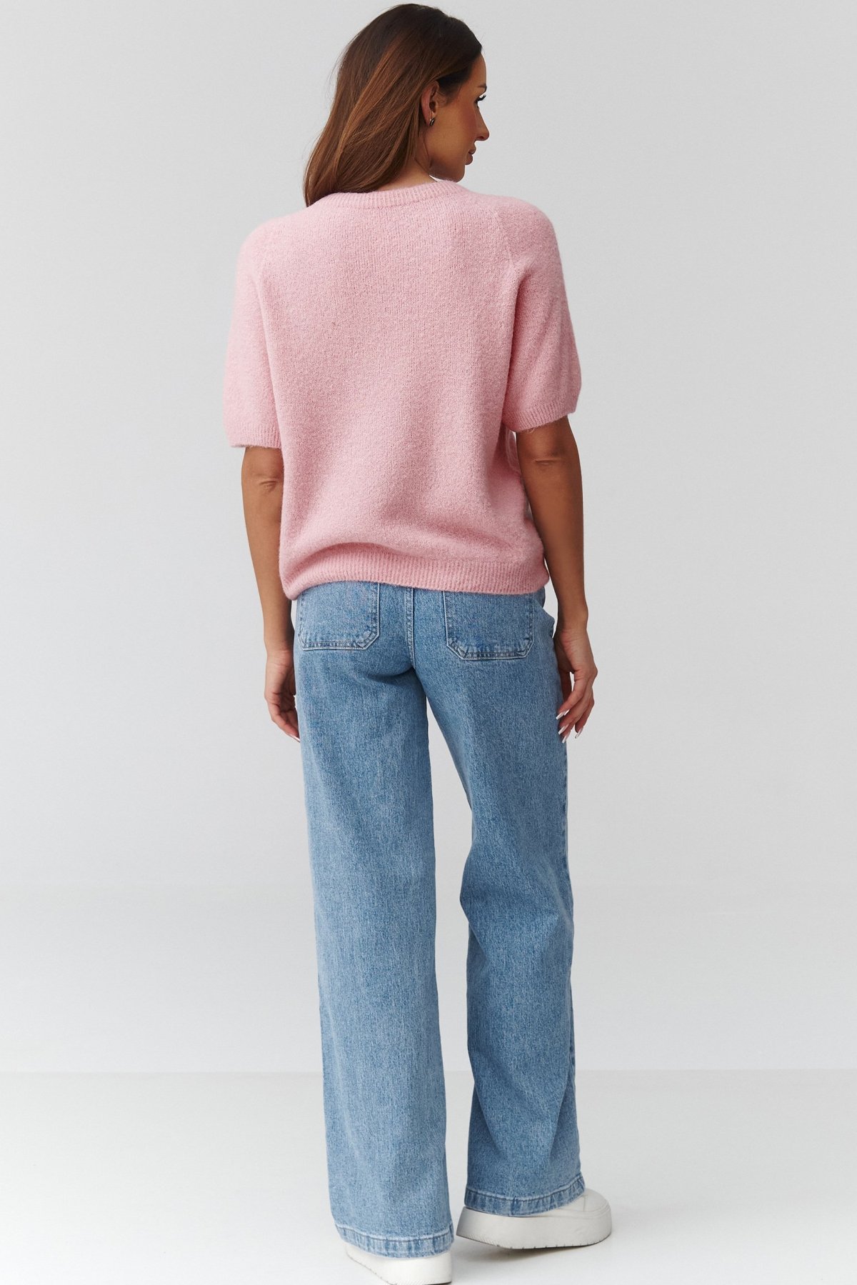 Krátký dámský svetr ve světle růžovém odstínu působí svěže a jemně, přitom si zachovává nadčasový charakter.