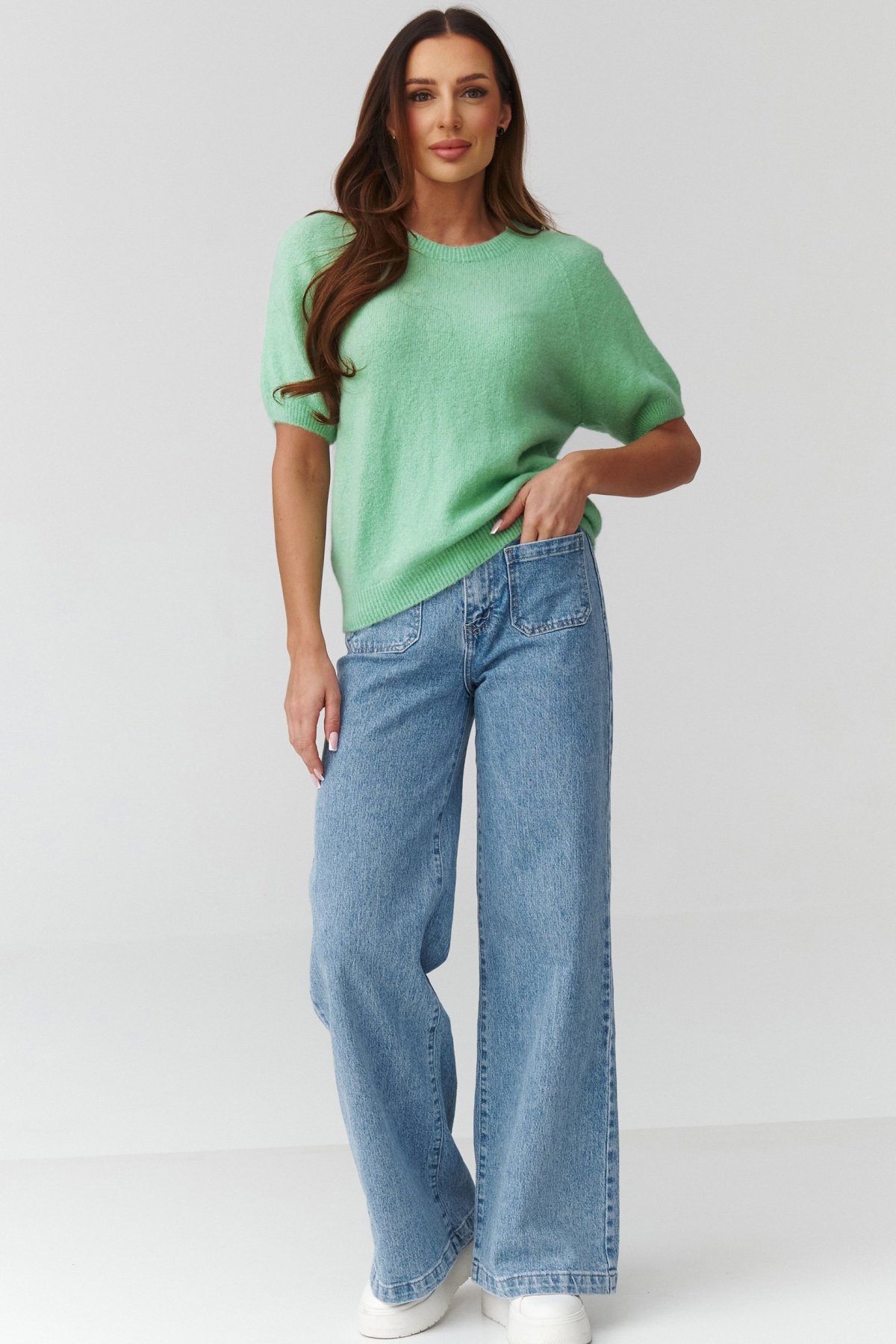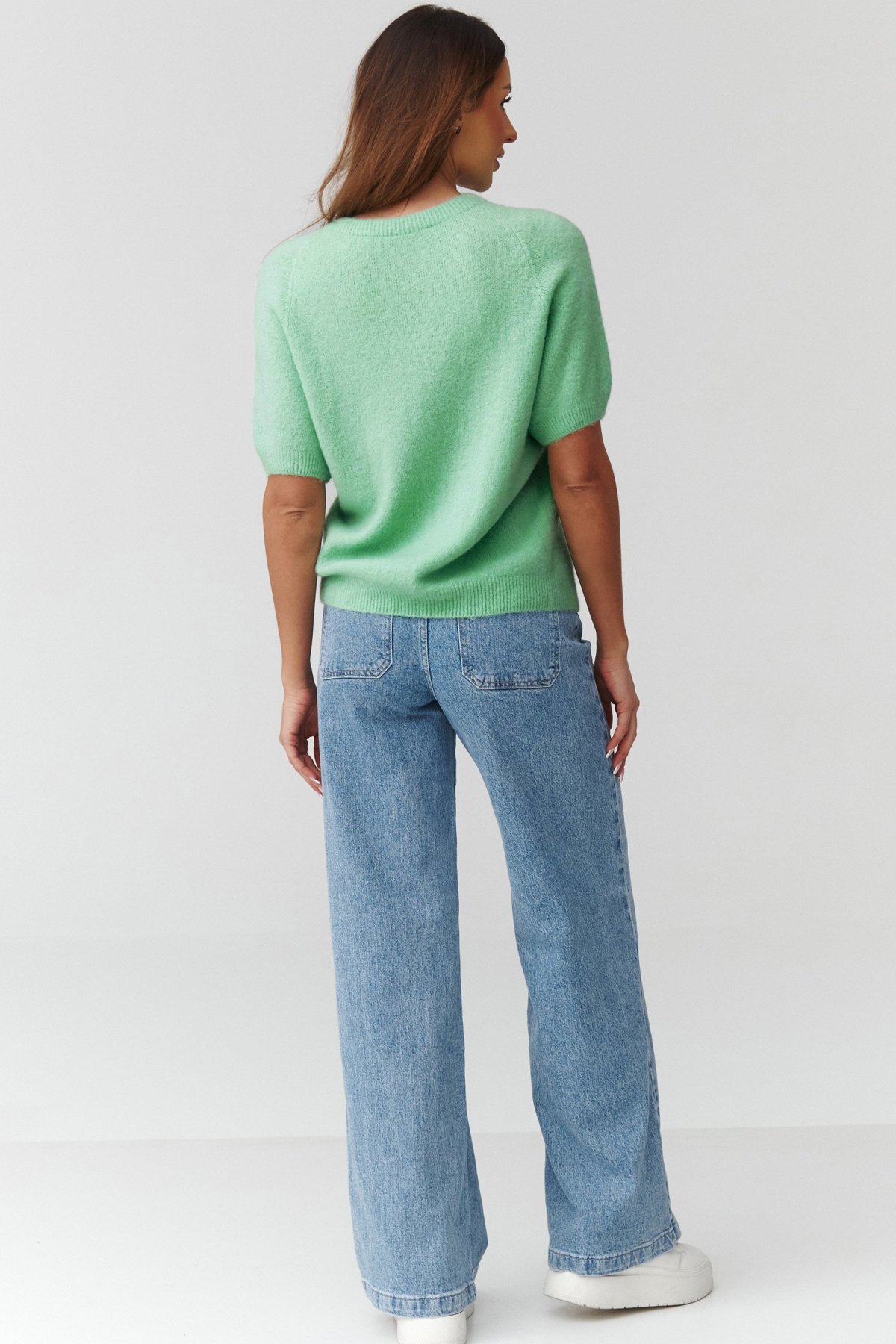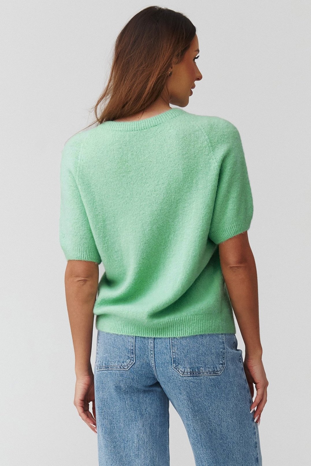 Krátký dámský svetr v zeleném odstínu působí svěže a jemně, přitom si zachovává nadčasový charakter.