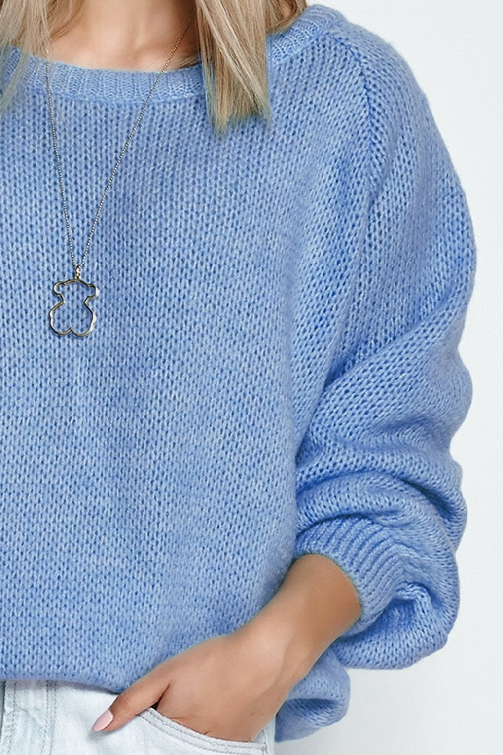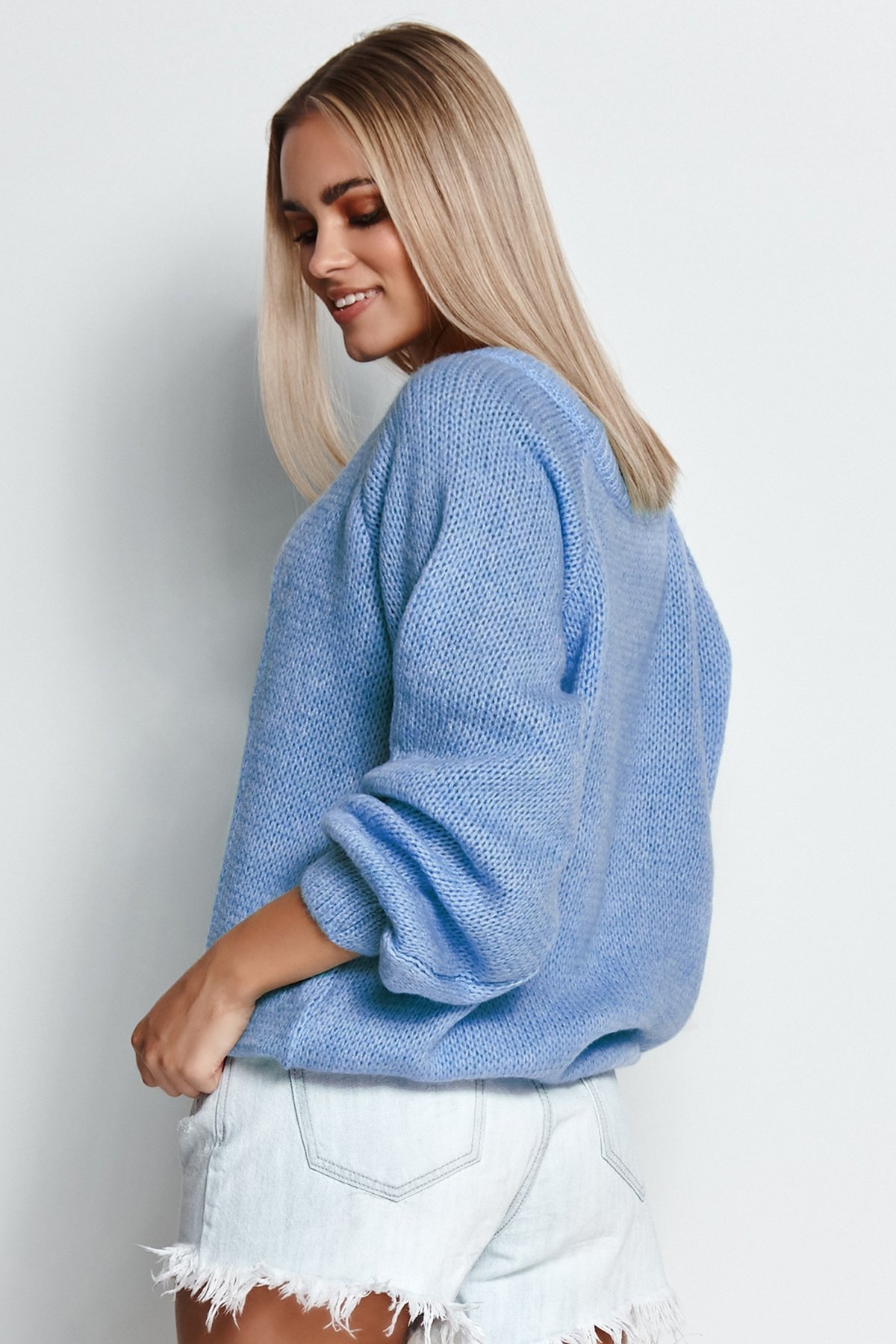 Svetr světle modré barvy má dlouhé rukávy a spodní lem zakončený speciálním žebrováním. Tento lem je tvořen tenkou gumovou páskou, která dodává svetru krásný tvar. Díky tomuto prvku si můžete sami zvolit, zda svetr umístíte do pasu, nebo ho necháte volně splývat.