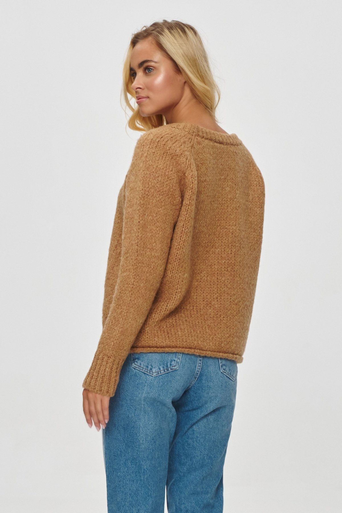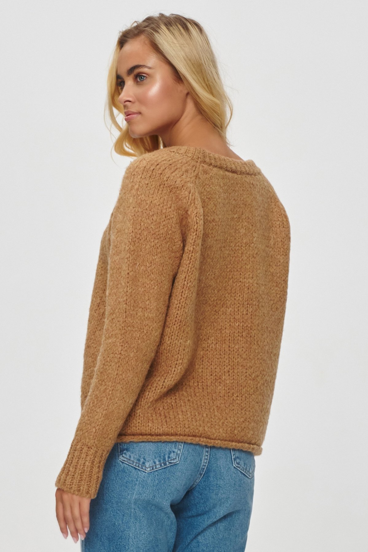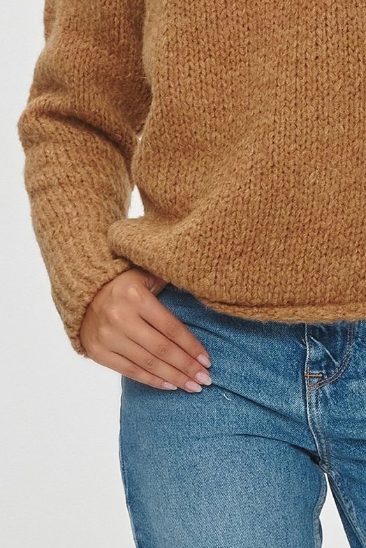 Dámský svetr volného střihu v elegantním světle hnědém provedení. Svetr bude perfektním doplňkem pro vaše outfity v chladnějších dnech.