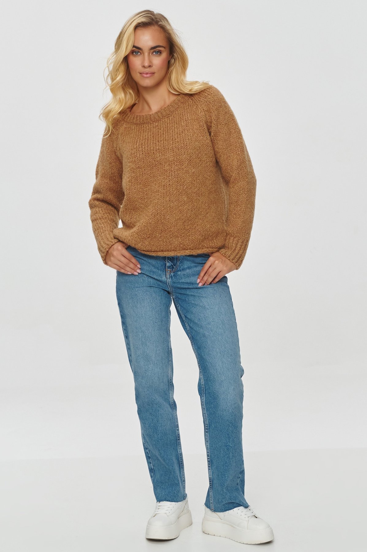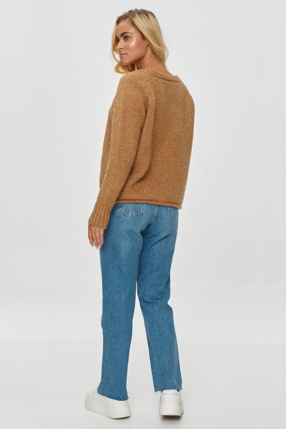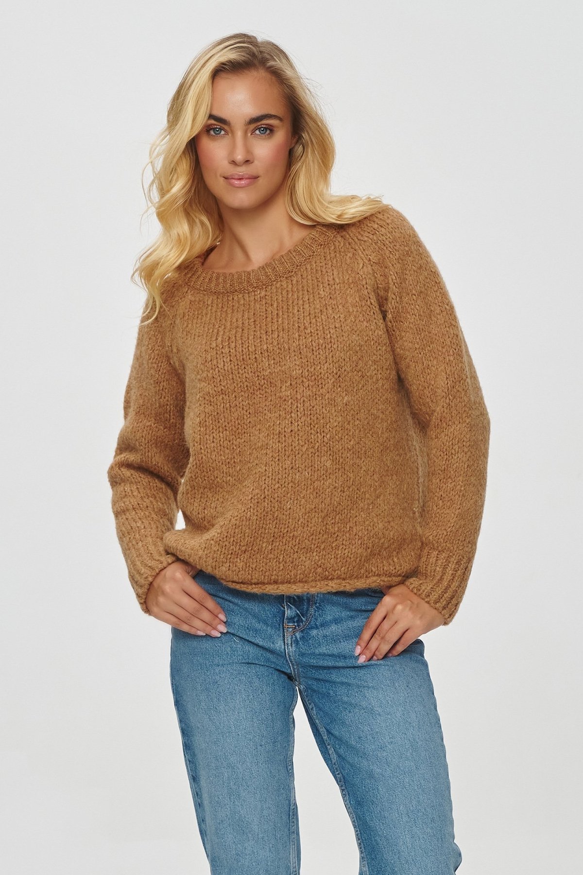 Dámský svetr volného střihu v elegantním světle hnědém provedení. Svetr bude perfektním doplňkem pro vaše outfity v chladnějších dnech.