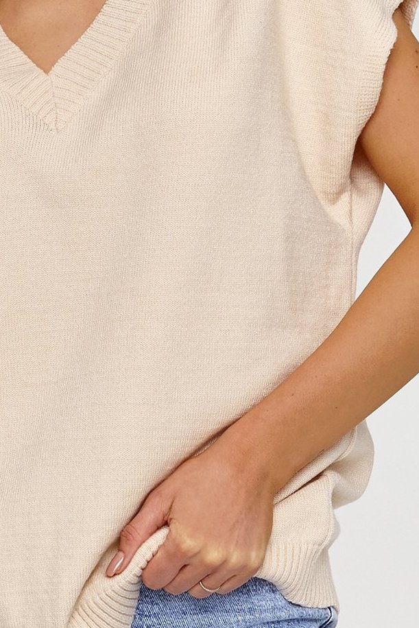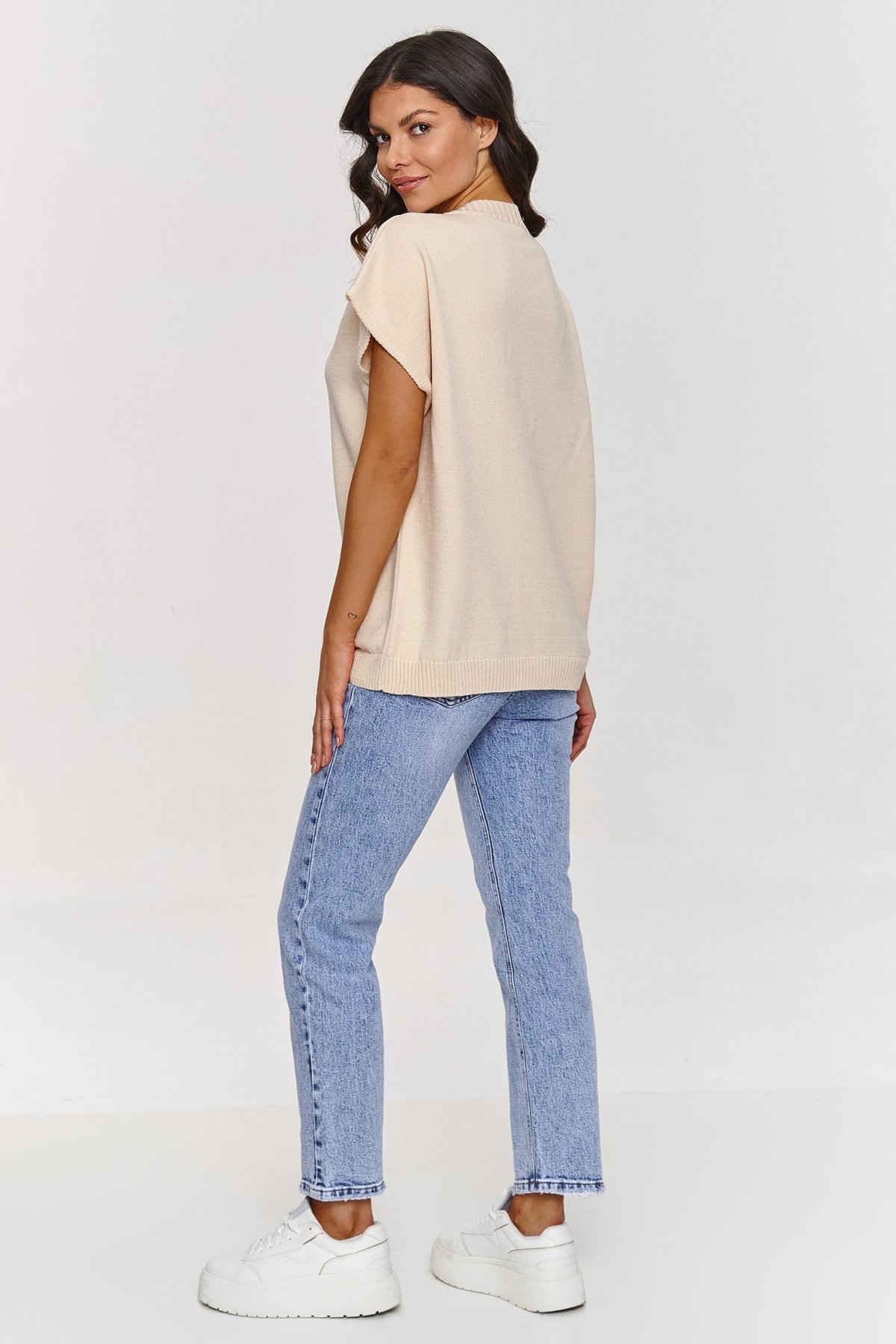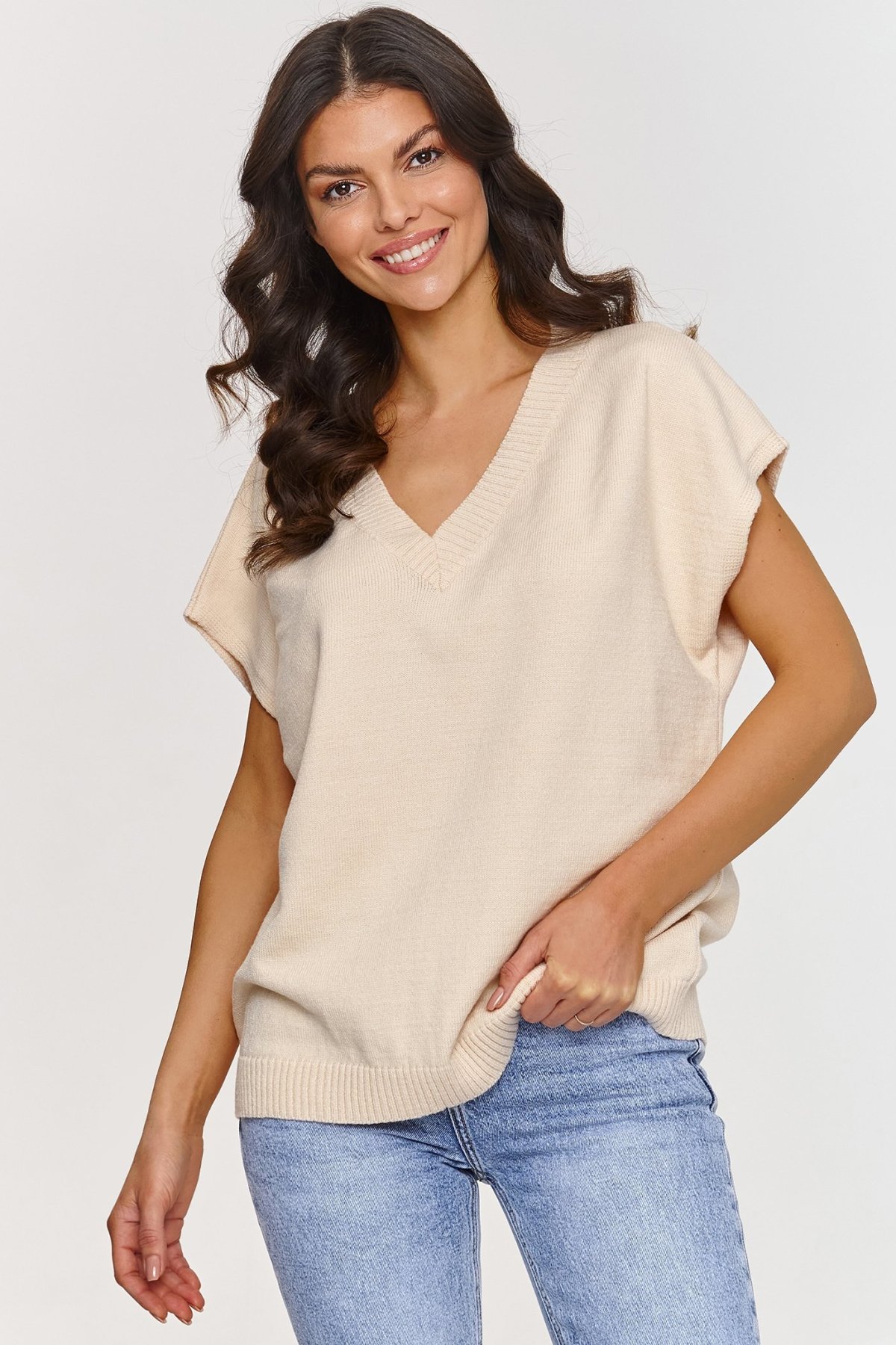 Stylový a pohodlný svetřík. To je povinný prvek každého šatníku! Tento model dodá svěžest každému outfitu, který s ním vytvoříte. Svetřík je z měkkého materiálu, zajišťuje plný komfort během celodenního nošení. Dekolt je véčkový - jeden z nejvíce elegantních a univerzálních střihů, který decentně prodlouží šíji a celou stylizaci tím jemně odlehčí. Střih je volnější, tzv. oversize, který se skvěle hodí k různým typům postav. Krátké, široké rukávy tvoří módní detail, který je stvořený pro teplejší dny, ale zároveň se skvěle hodí pro vrstvení během chladnějšího období. Svetr je vyroben ze směsi vláken. Jednou složkou je i PBT - vlákno, které si uchovává svůj tvar a strukturu po dlouhou dobu. Takže neztrácí svou estetiku a je trvanlivé. Díky elasticitě se vlákno perfektně přizpůsobí. Svetřík má více barevných variant - můžete jej snadno kombinovat a vytvořit perfektní outfit pro svůj den. Doplňte jej jeansy, elegantní sukní nebo i klasickými kalhotami. Fantazii se meze nekladou. Vychutnejte si univerzálnost tohoto stylového kousku.