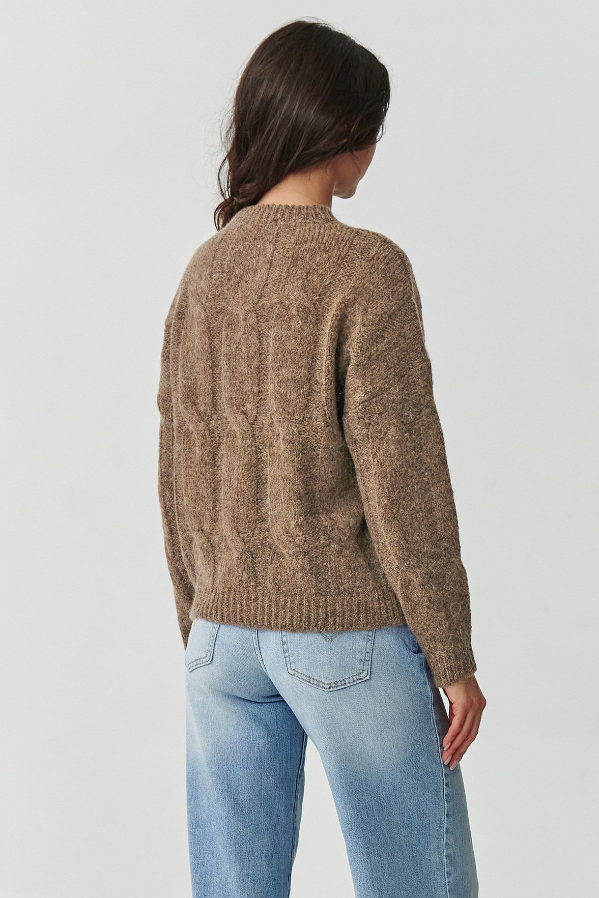 Dámský svetr s copánkovým úpletem, který je vyroben ze směsi kid mohéru, vlny, polyamidu a akrylu. To je kombinace,…