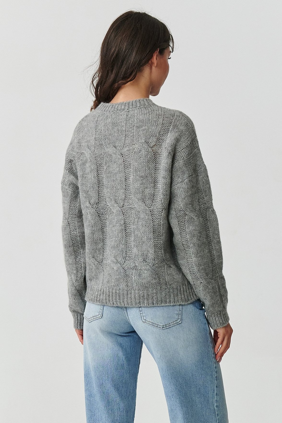 Dámský svetr s copánkovým úpletem, který je vyroben ze směsi kid mohéru, vlny, polyamidu a akrylu. To je kombinace,…