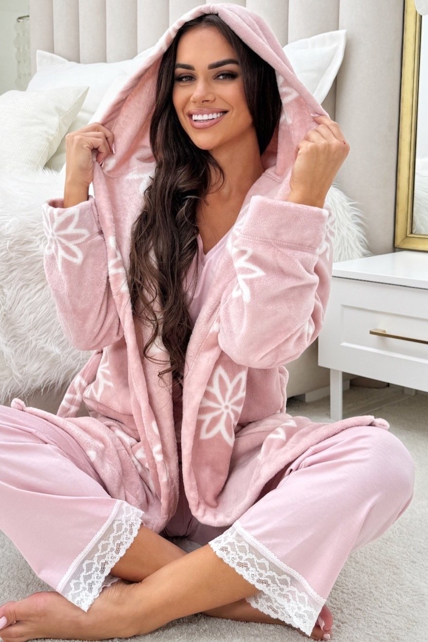 Mimořádně hebký dámský župan, který promění chladná rána i večery v okamžiky naprostého pohodlí. Vyrobený z měkkého soft materiálu, který jemně obejme tělo a poskytne dokonalý komfort i po koupeli. Praktický pásek v pase umožní snadné přizpůsobení postavě, zatímco dvě postranní kapsy nabídnou prostor pro drobnosti nebo zmrzlé ruce. Nechybí ani prostorná kapuce, která zahřeje a ochrání vlasy před chladem. Stylový, měkoučký a příjemně teplý – župan, ve kterém se zima mění v hřejivý zážitek.