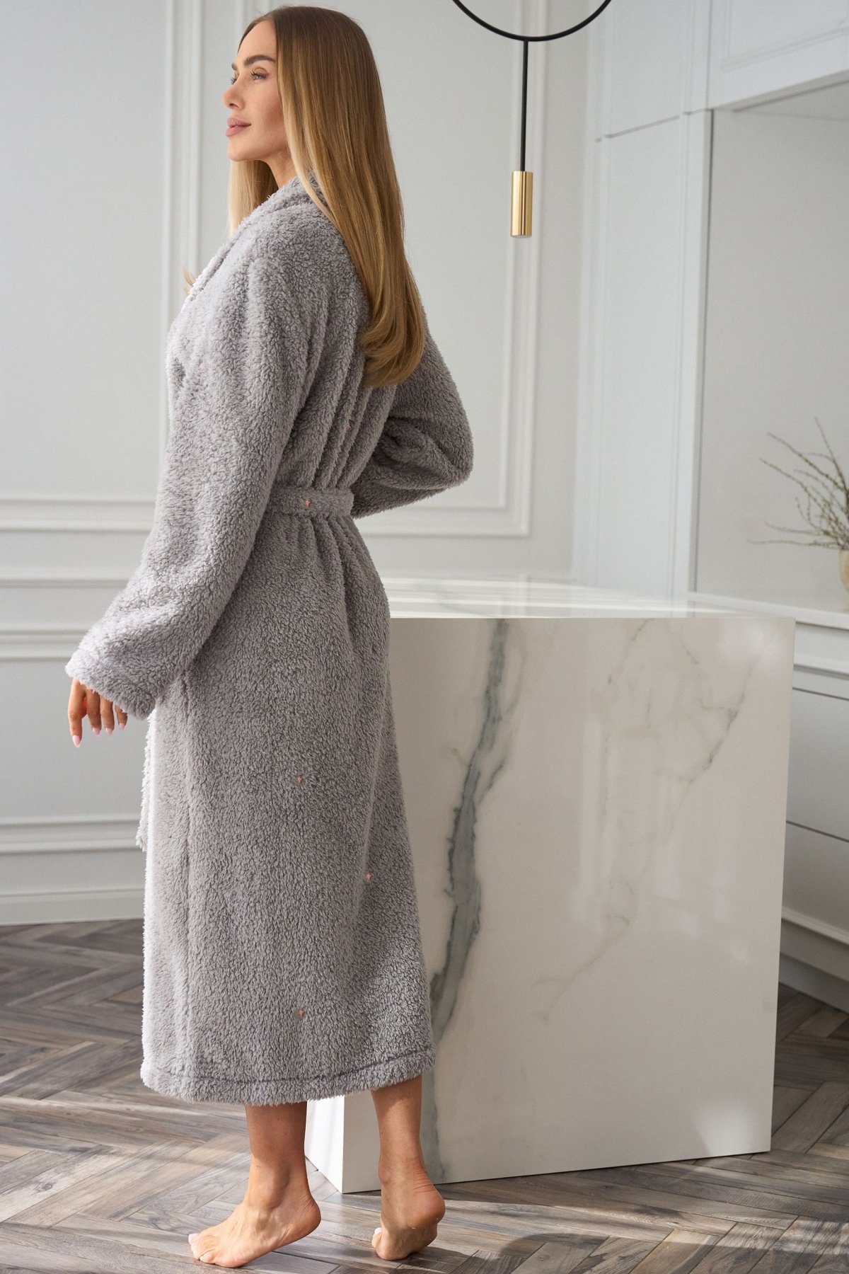 Stylový šálový límec dodává županu klasický vzhled, vyšívané hvězdičky přinášejí nádech romantiky a originality. Pásek v pase umožňuje přizpůsobit župan podle postavy a praktické kapsy zvyšují komfort nošení. Model sahající až k lýtkům poskytuje pocit tepla a pohodlí. Dostupný v jemně růžovém nebo šedém odstínu – ideální pro ženy, které milují měkké materiály a elegantní domácí styl.