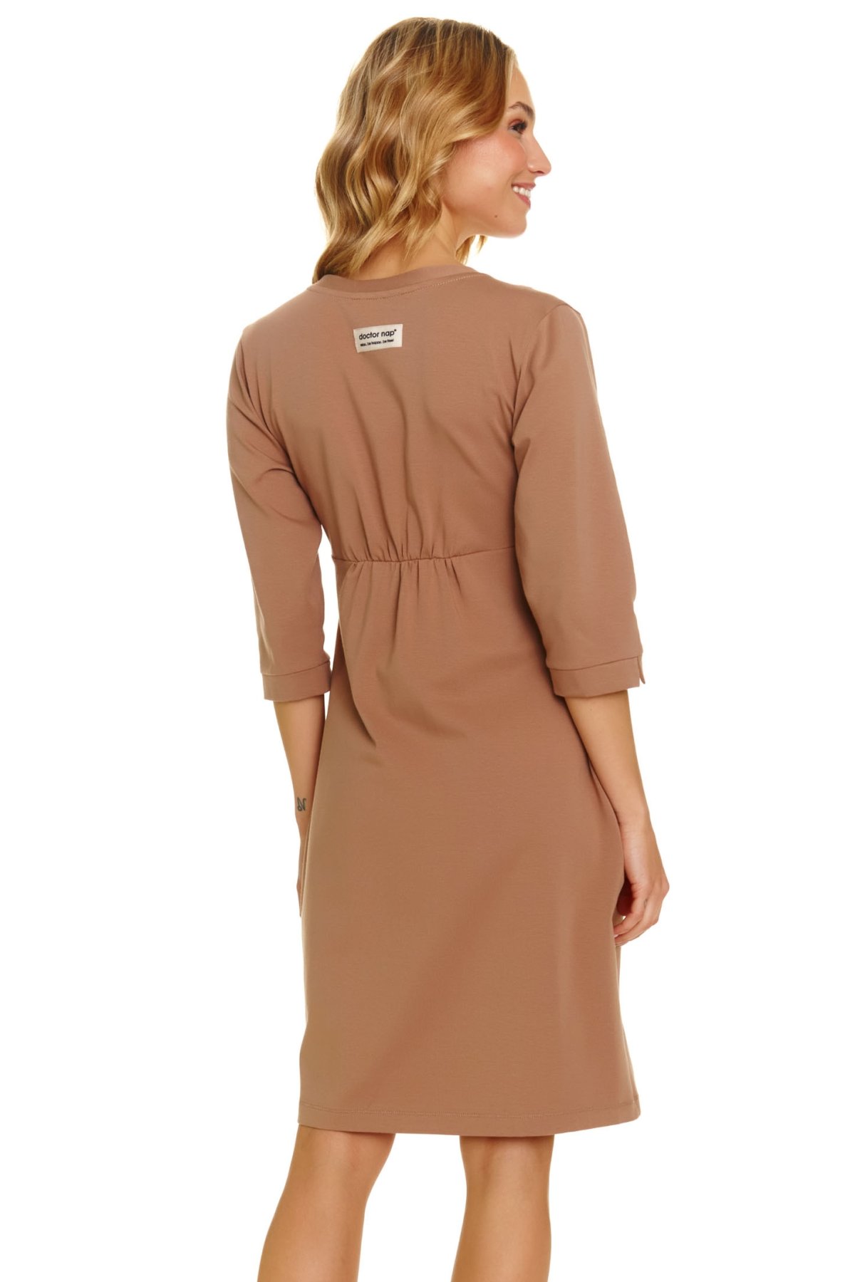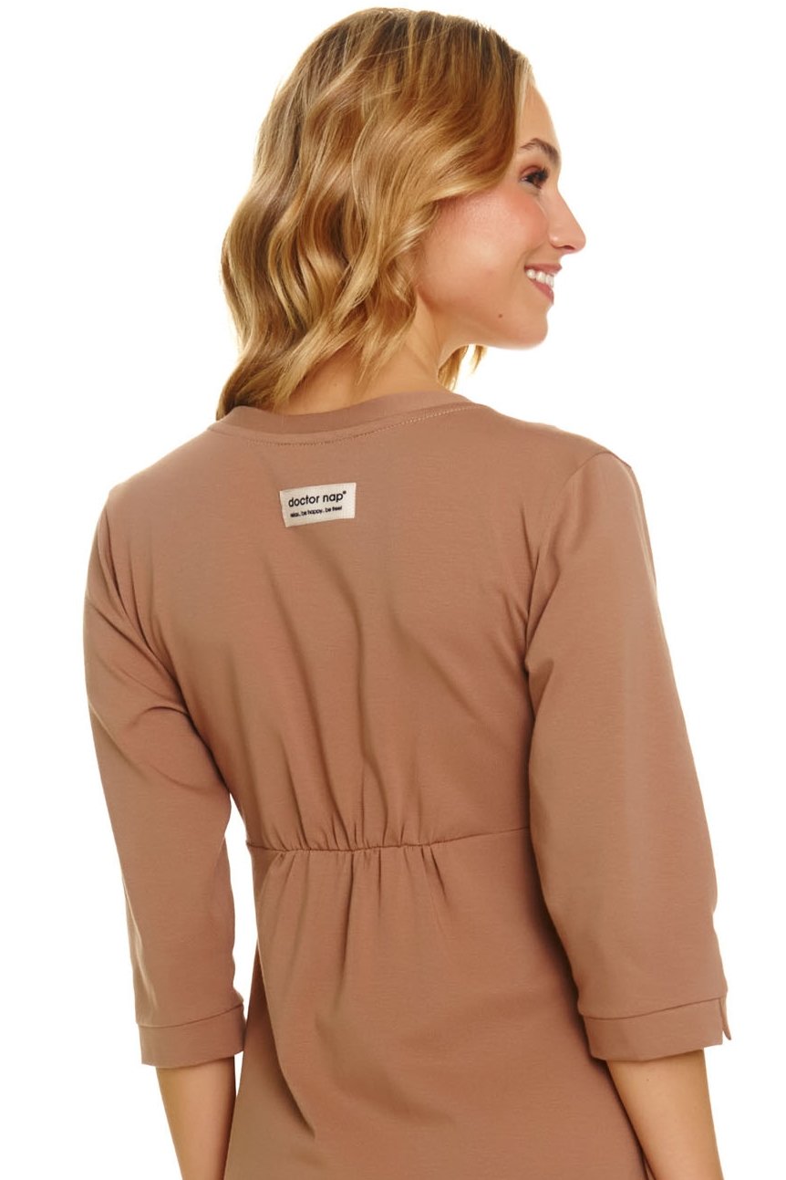 Dámský župan béžové barvy je navržený tak, aby poskytoval maximální pohodlí ženám i v období těhotenství a při kojení. Zavinovací střih s páskem umožňuje snadné nastavení a zajišťuje diskrétní přístup při krmení miminka. Měkký a prodyšný materiál je šetrný k pokožce, což ocení jak maminka, tak dítě. Župan má rukávy v praktické 3/4 délce a boční kapsy na drobnosti. Díky elegantnímu střihu působí žensky a lze ho nosit i mimo období těhotenství. Skvělá volba pro domácí pohodu i do porodnice – pohodlný, všestranný a s nádechem elegance.