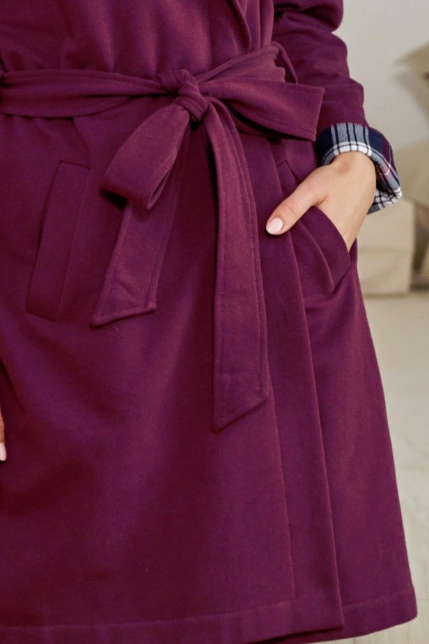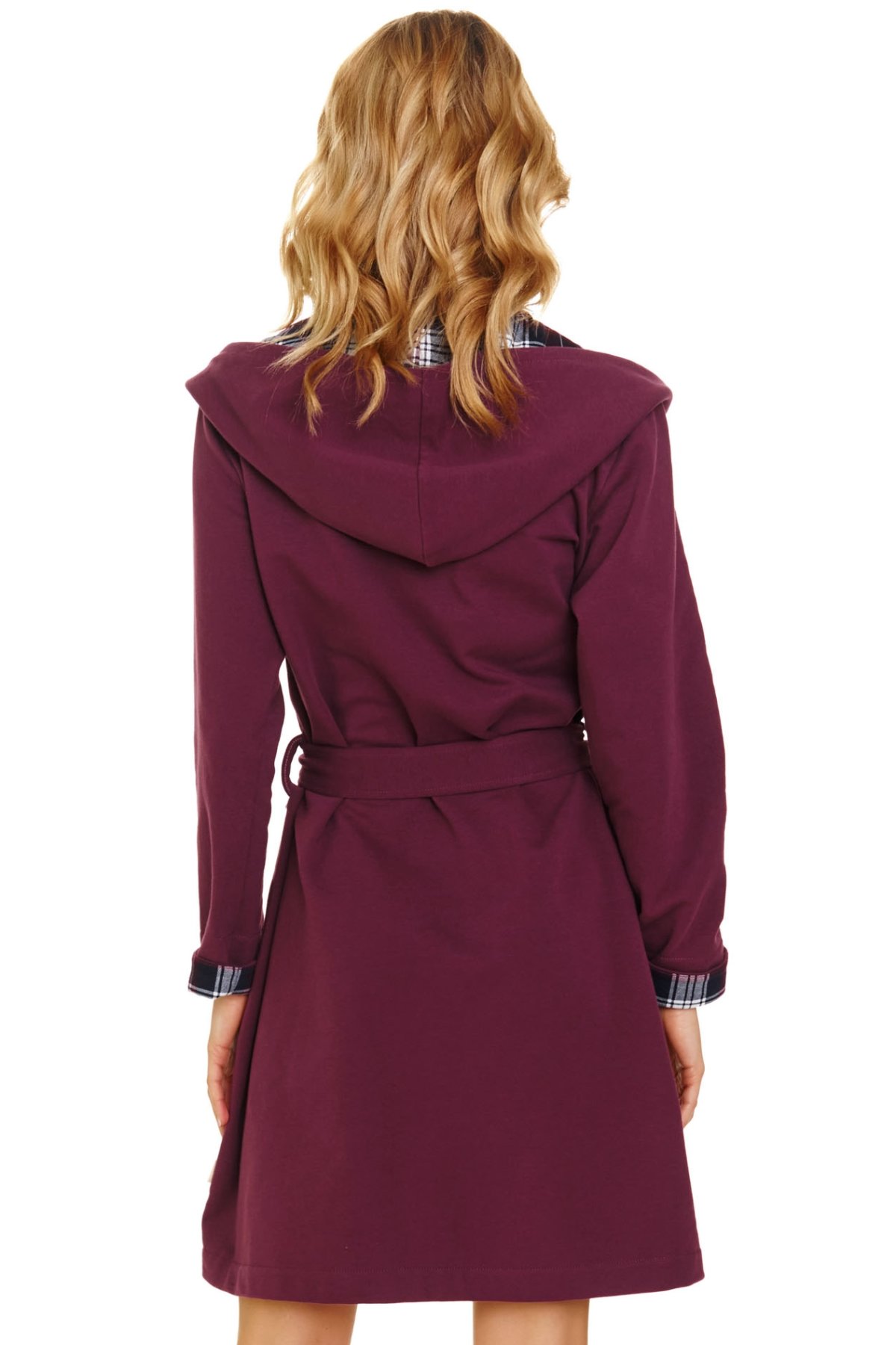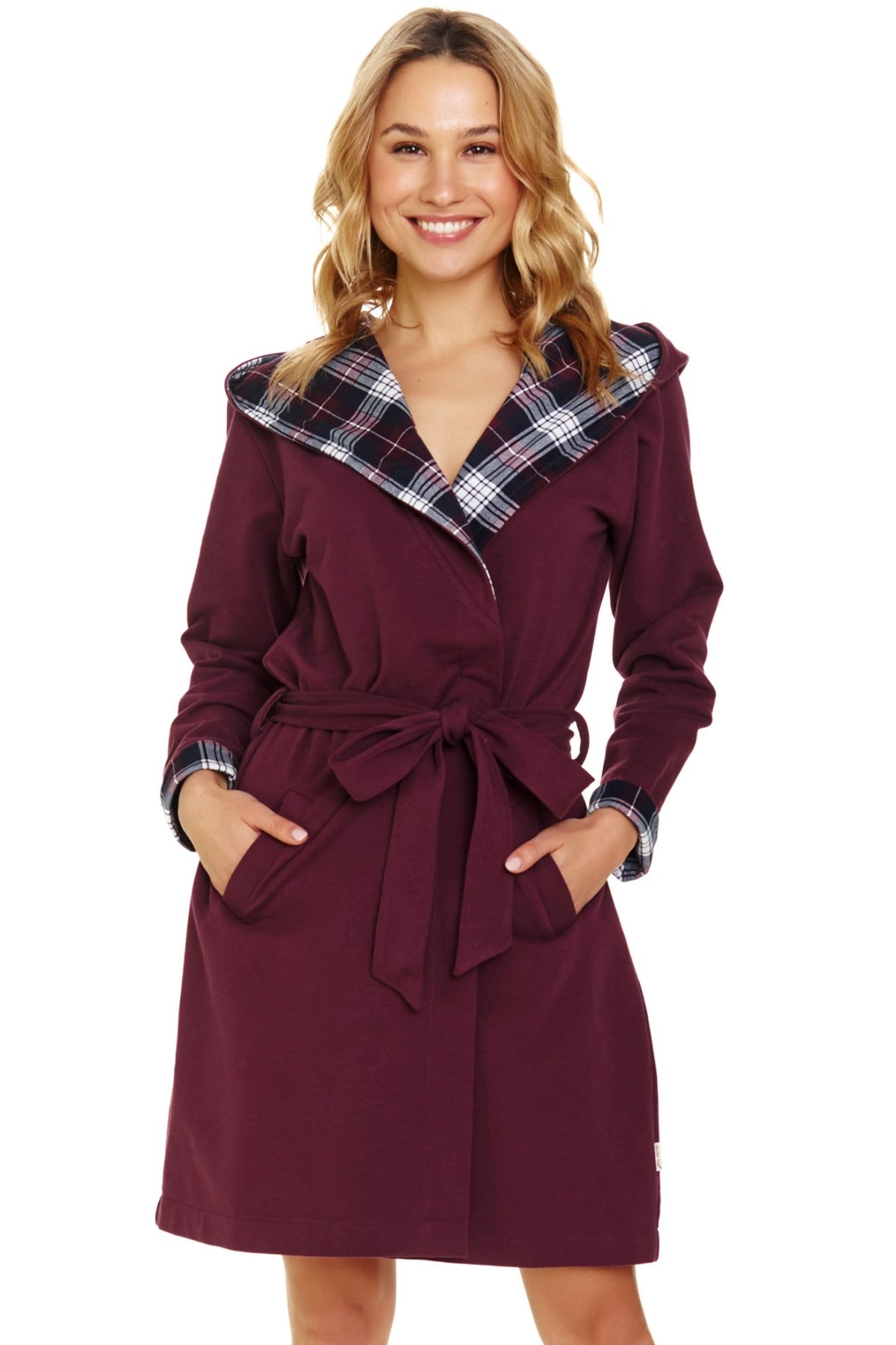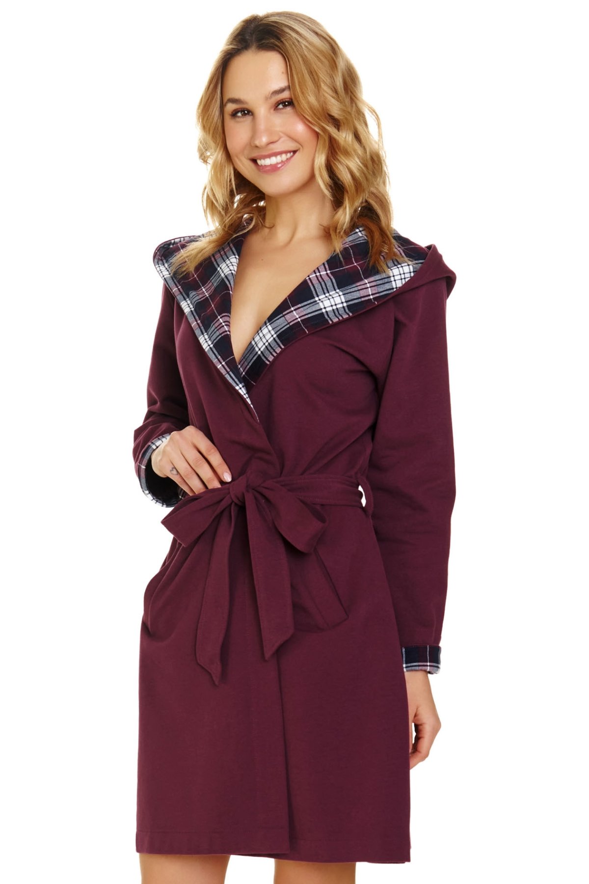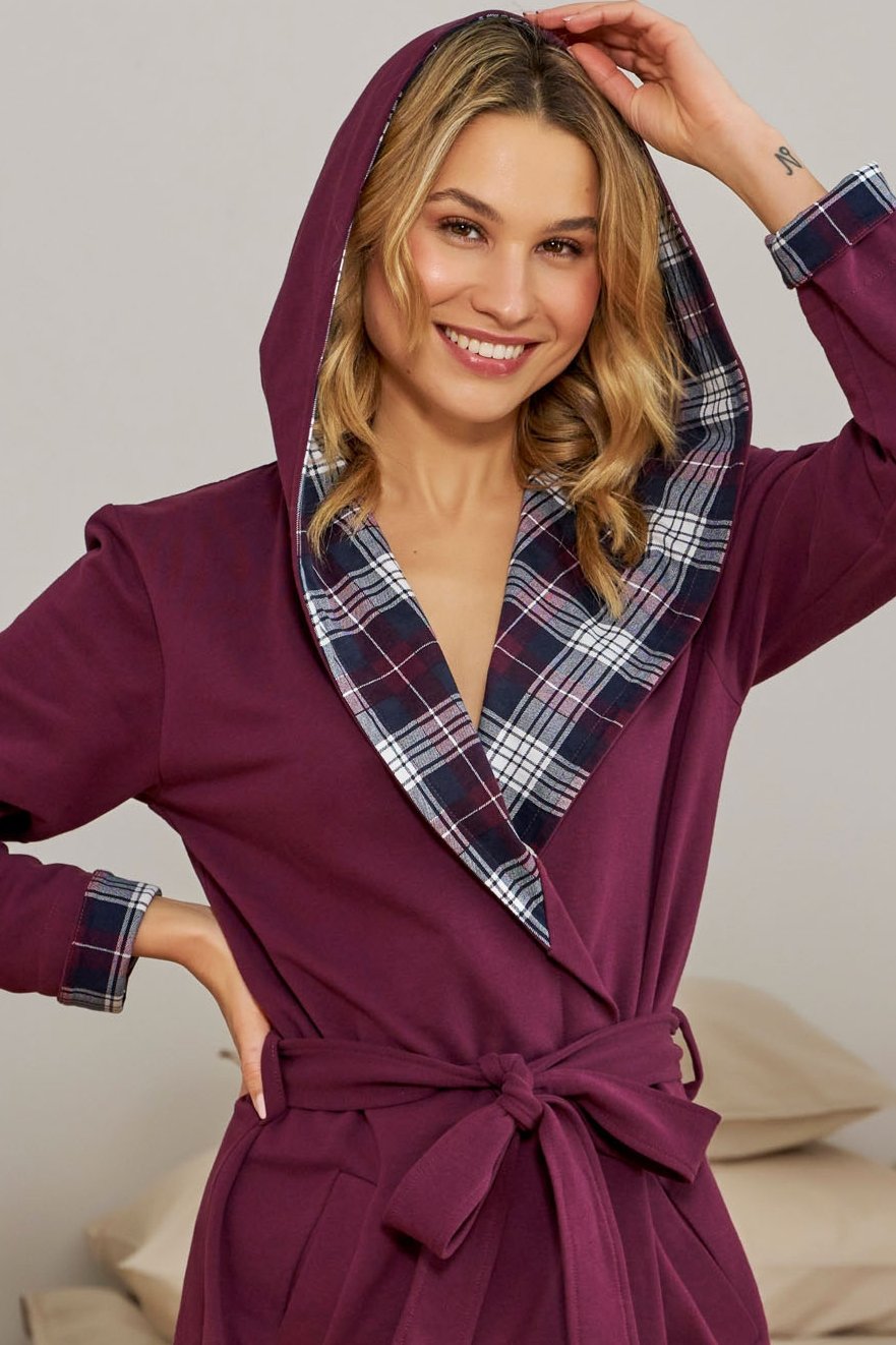 Stylový dámský župan s kapucí. Měkká bavlněná tkanina poskytuje teplo a komfort, ať už si župan obléknete po koupeli, při ranní kávě nebo večerním odpočinku. Kapuce ozdobená kostkovaným lemem dodává županu moderní a útulný vzhled, praktické kapsy zvyšují jeho funkčnost. Do pasu je pásek, díky kterému snadno zvýrazníte smyslnou ženskou siluetu.