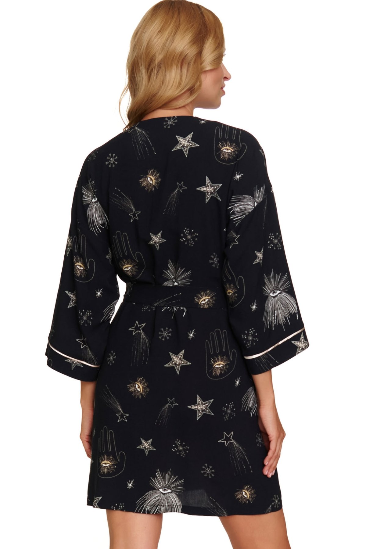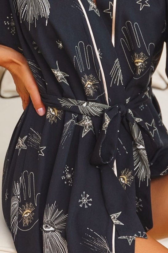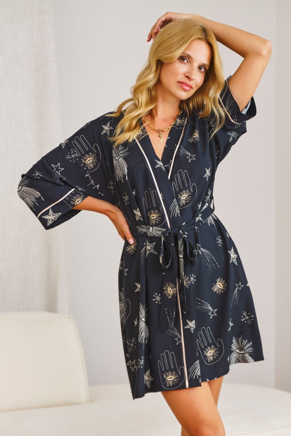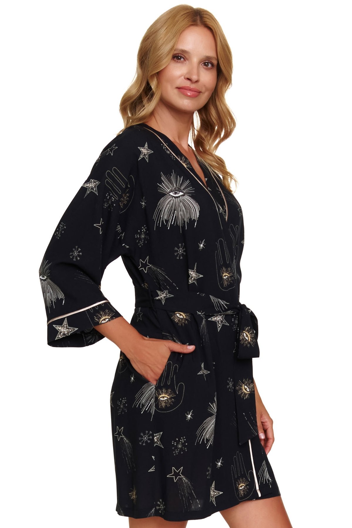 Černý dámský župan je ztělesněním ženské elegance a pohodlí. Lehká viskóza jemně splývá po těle, krásně se přizpůsobí postavě a působí luxusním dojmem. Díky střihu kimona se župan pohodlně nosí, neomezuje v pohybu a zvýrazňuje ženskou siluetu. Kontrastní lemování a precizní šití dodávají modelu jedinečný charakter, kapsy na drobnosti a pásek v pase zajišťují funkčnost a praktické využití.