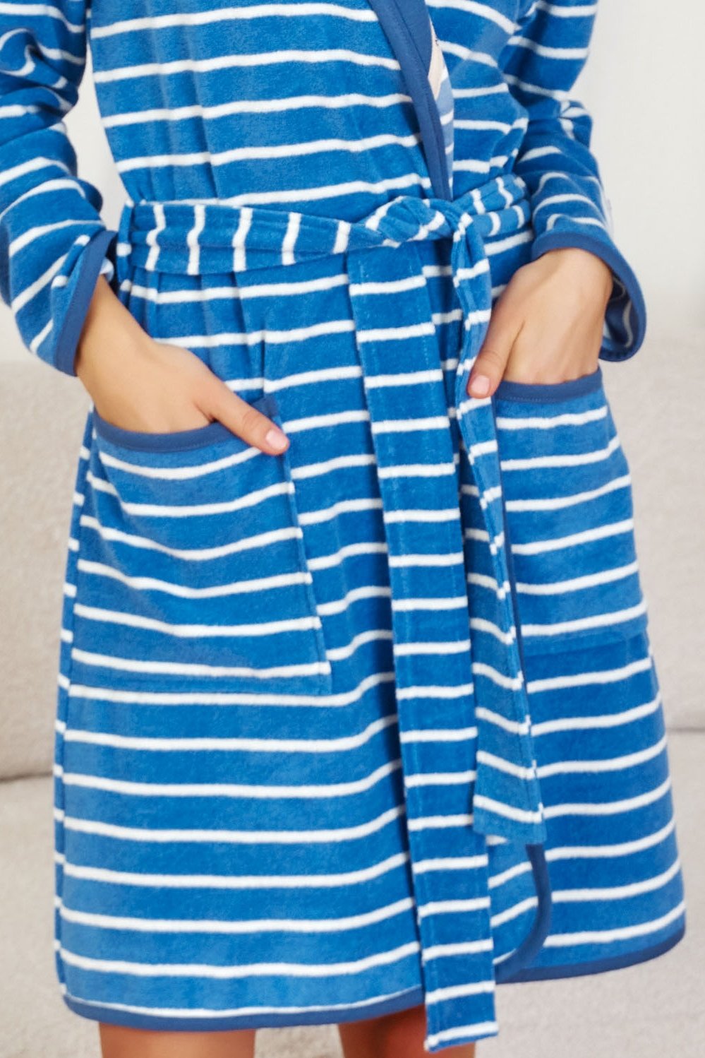 Dámský pruhovaný župan, ideální na ranní kávu i večerní relax. Hebká froté bavlna příjemně hřeje po koupeli, přitom zůstává lehká a komfortní na celodenní nošení. Kapuce poskytne extra teplo a ochranu před chladem, zatímco zavazování v pase umožní snadno zvýraznit siluetu. Praktické kapsy pojmou telefon či drobnosti, ozdobná lemovka dodává celku upravený, elegantní vzhled. Díky délce nad kolena nepřekáží v pohybu a skvěle padne k domácímu loungewearu i pyžamu. Pokud hledáte spojení funkčnosti, hebkosti a nadčasového designu, tento župan si vás získá na první dotek.
