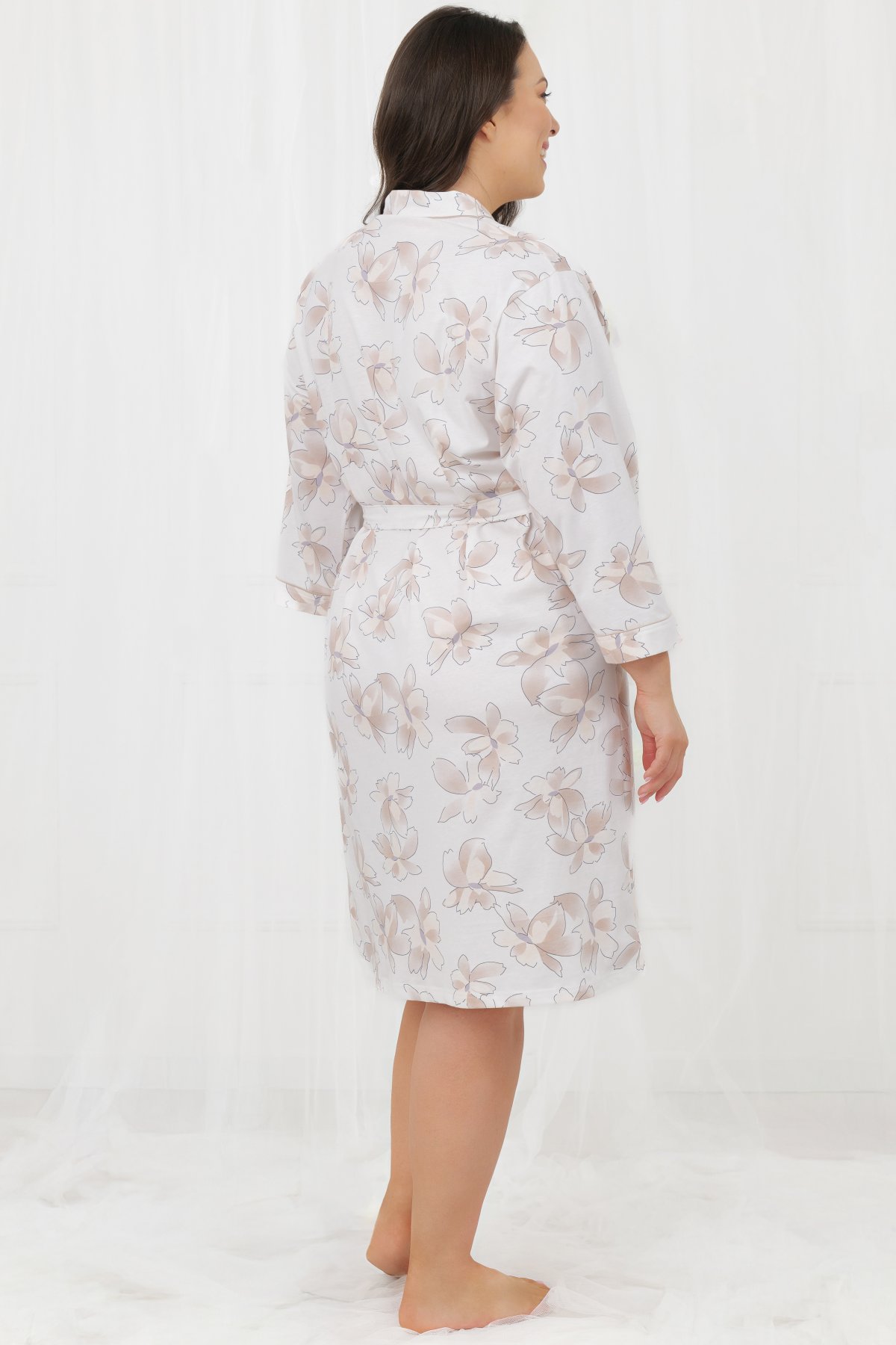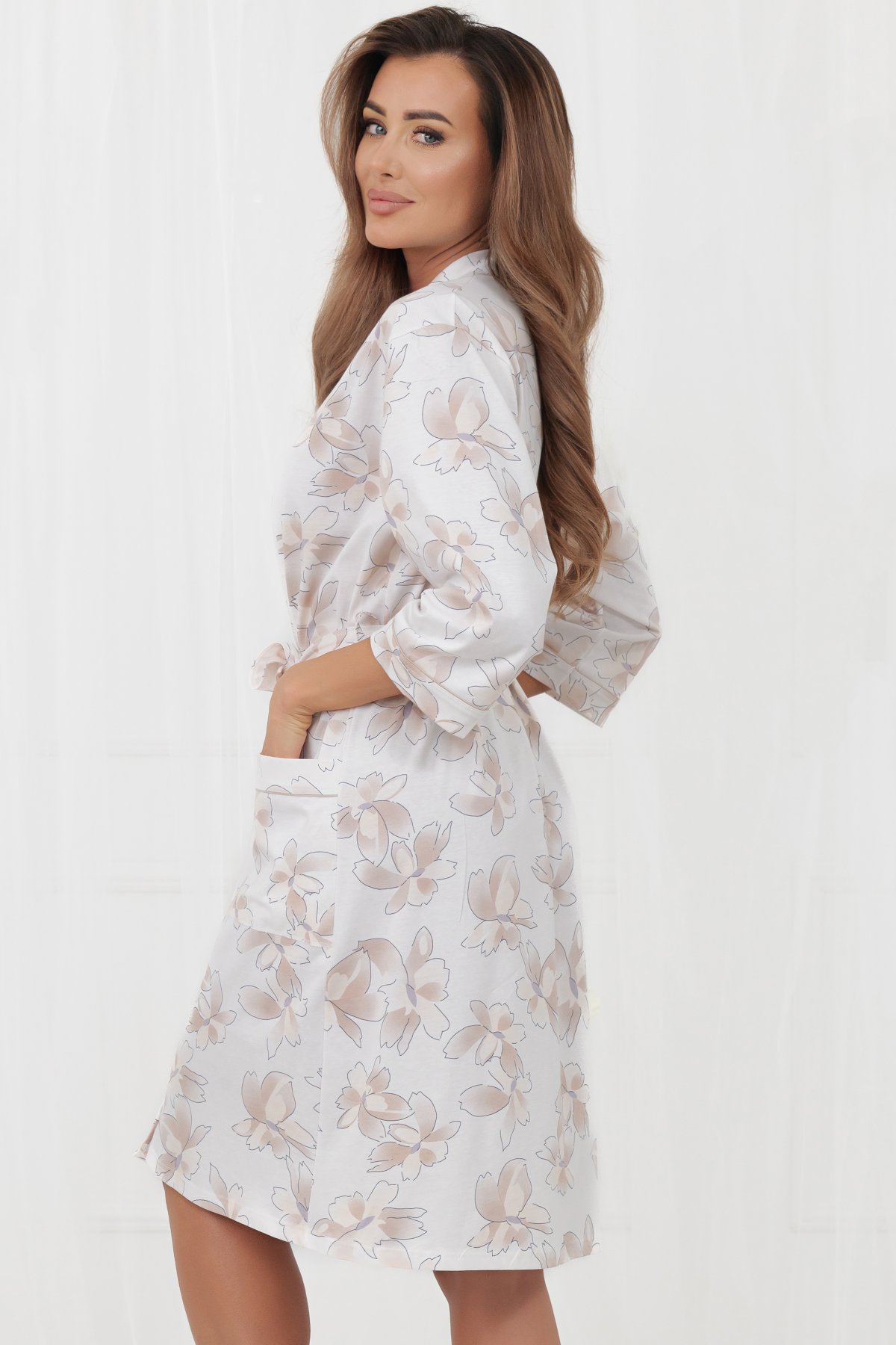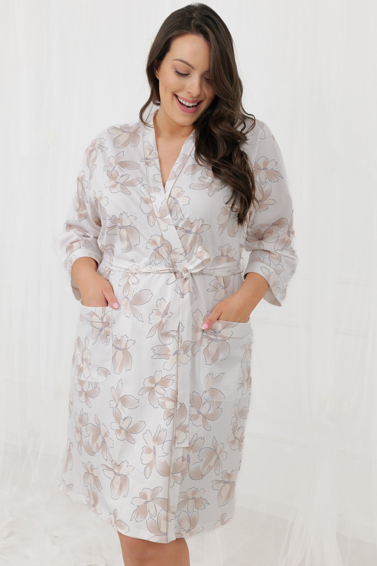 Dámský župan Arola je ideální pro pohodové ráno i večerní relax. Vyroben ze 100% bavlny, je měkký, prodyšný a příjemný na dotek. Zavinovací střih s páskem umožňuje upravit obvod podle potřeby a zvýraznit siluetu. Rukávy ve 3/4 délce jsou praktické a pohodlné při běžných činnostech. Župan doplňují dvě přední kapsy a jemný květinový potisk na světlém podkladu, který působí elegantně a nadčasově. Délka ke kolenům poskytuje dostatečné zahalení i komfort. Skvěle doplní noční košili ze stejné kolekce a vytvoří sladěný domácí set.
