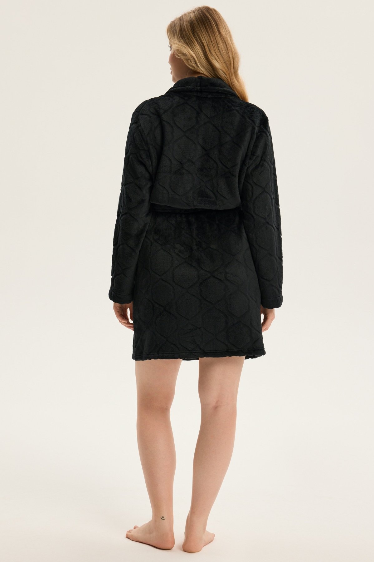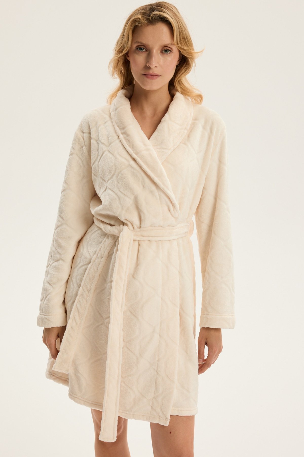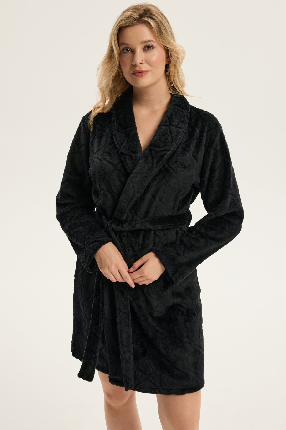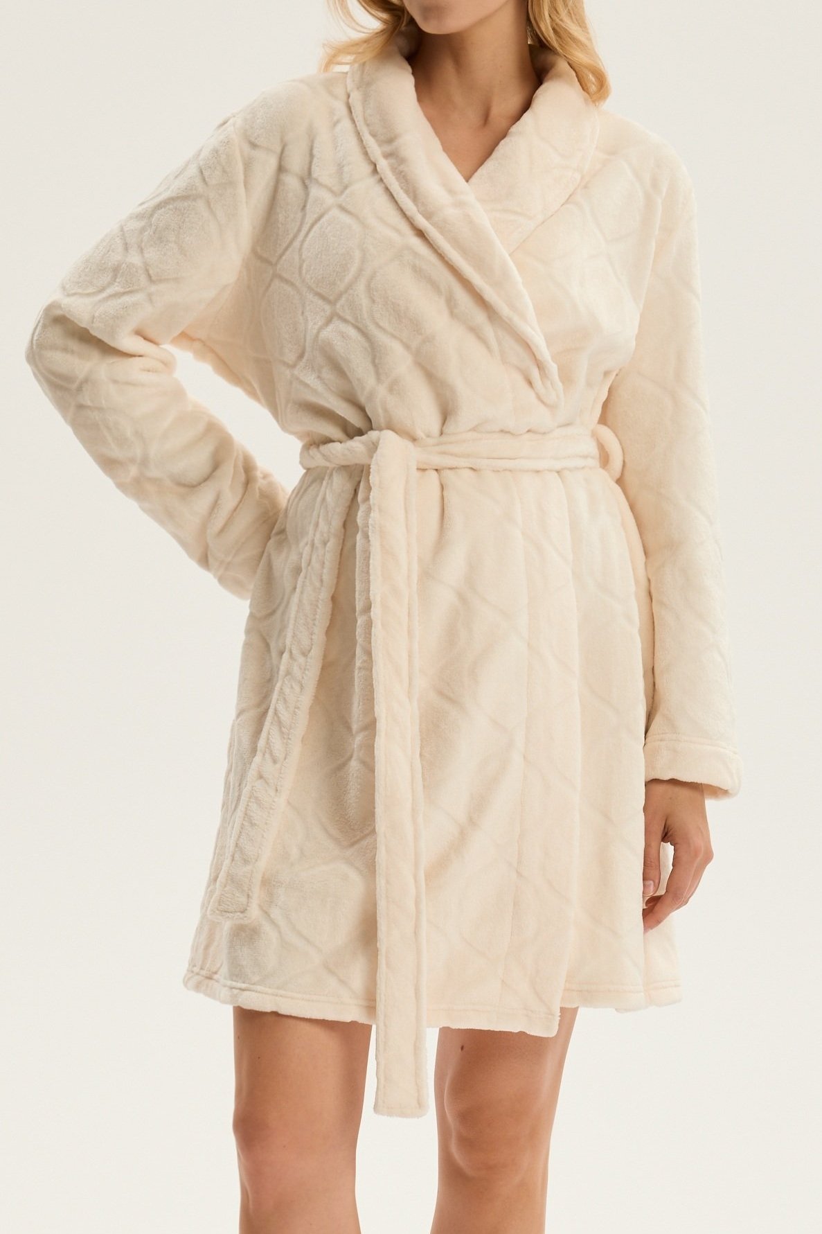 Dámský župan Coco je ztělesněním jemnosti, pohodlí a ženské elegance. Jeho krátký střih nad kolena krásně zvýrazňuje siluetu, šálový límec dodává modelu nádech luxusu. Vyrobený z hebkého materiálu, příjemně hřeje a hladí pokožku, díky čemuž je ideální pro chvíle odpočinku po koupeli i klidné večery doma. Pásek v pase umožňuje upravit obvod podle potřeby a podtrhnout ženské křivky. Coco je dokonalou kombinací stylu, pohodlí a kvality – župan, který promění běžný večer v okamžik domácího luxusu.
