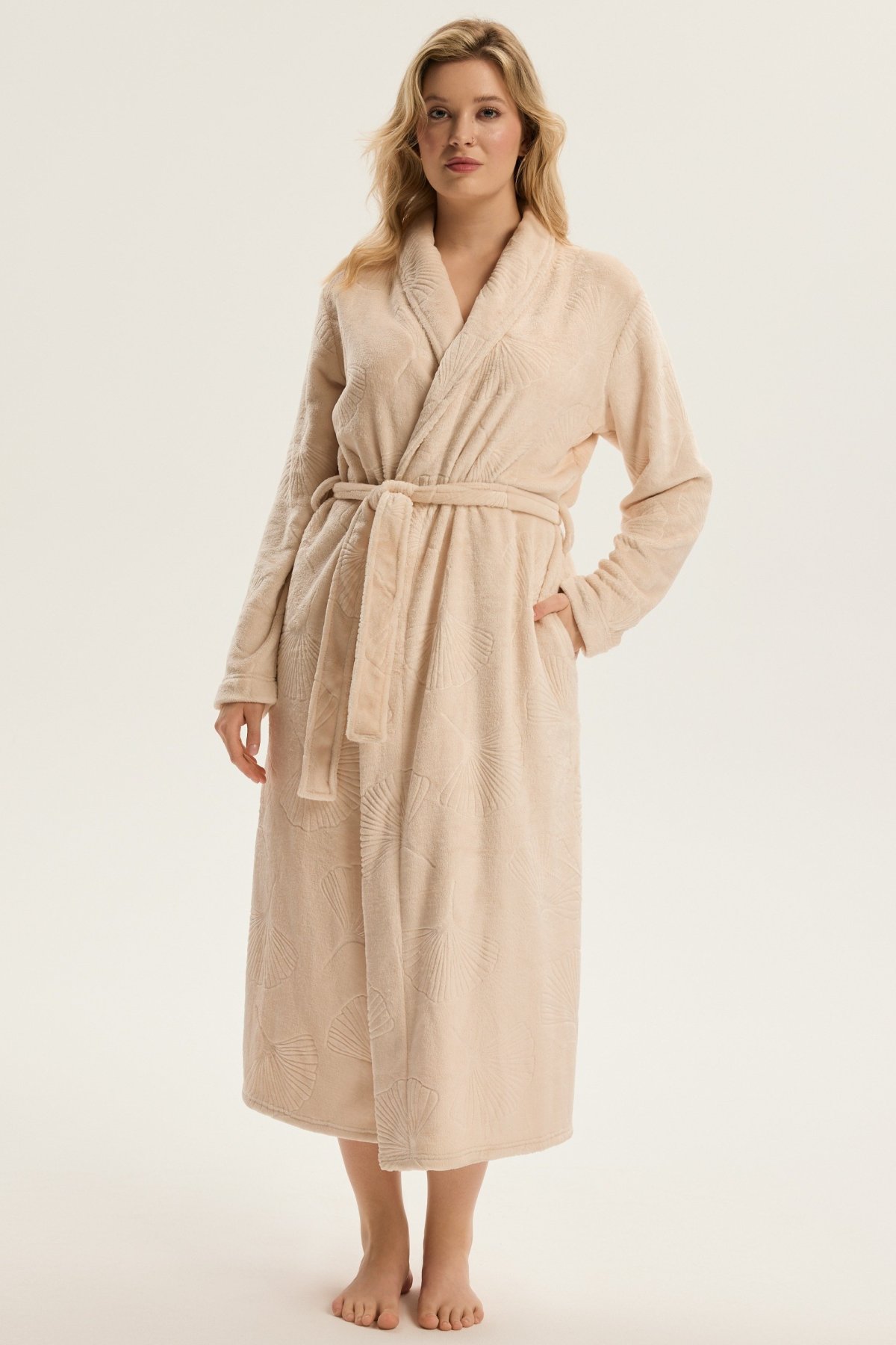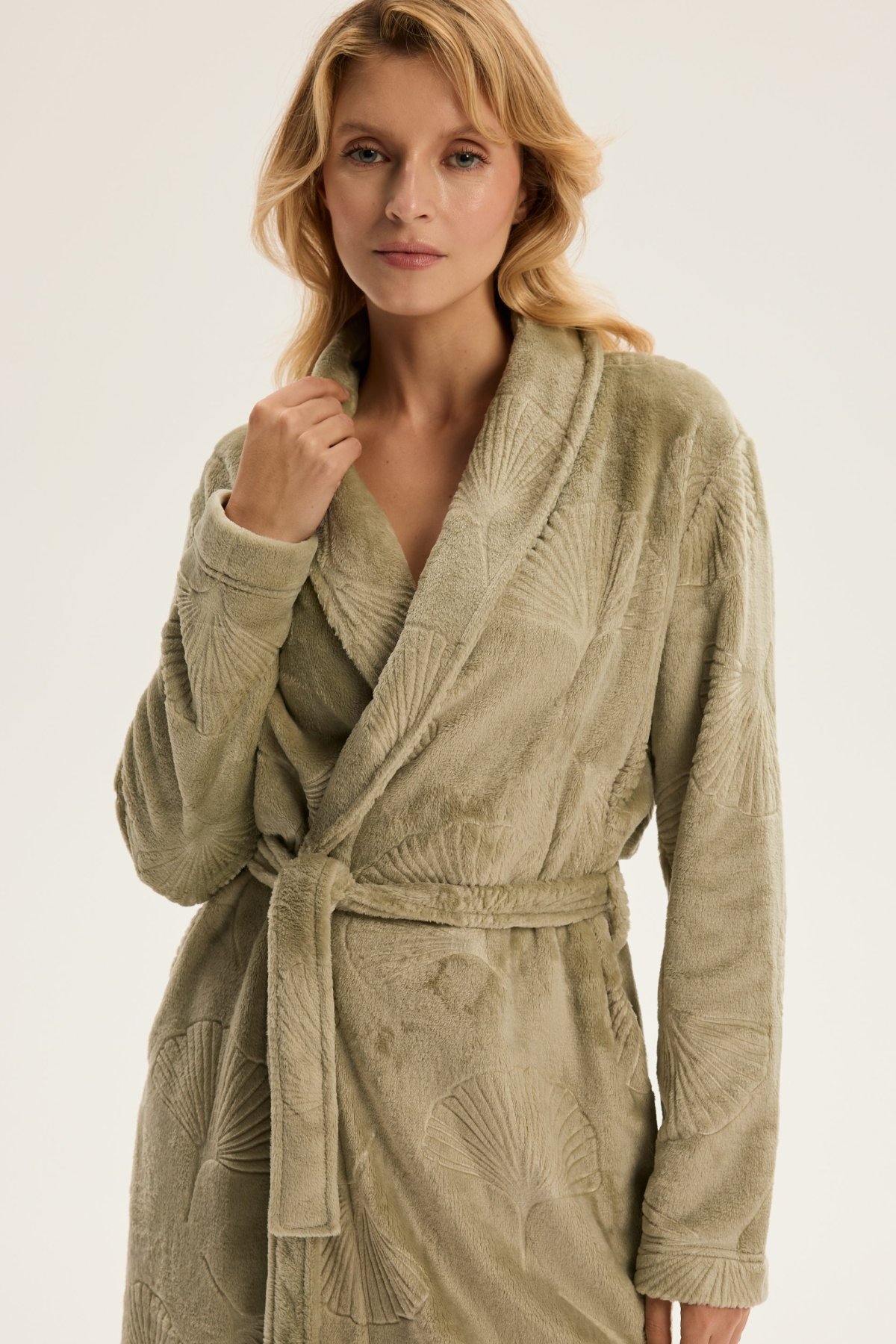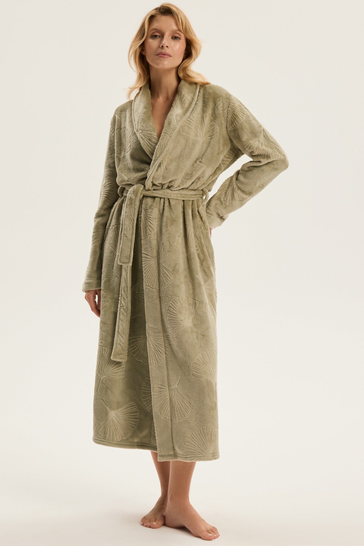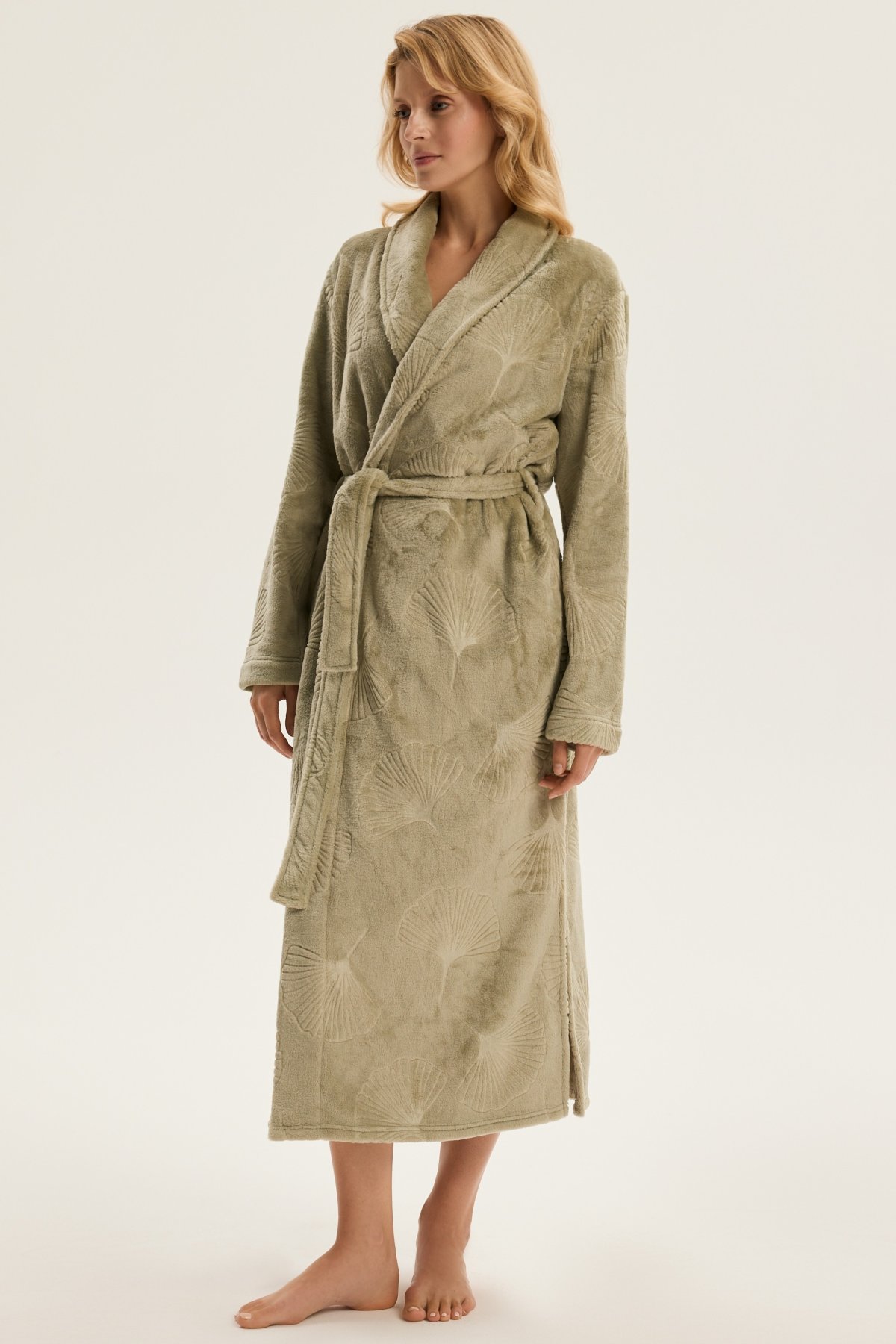 Dámský župan Como je dokonalým spojením elegance a jemného luxusu. Dlouhý střih opticky prodlužuje postavu, zatímco pásek v pase decentně zvýrazní ženské křivky. Tkanina s vytlačovaným rostlinným vzorem působí mimořádně sofistikovaně a dodává modelu dekorativní hloubku. Hebký, na dotek sametový materiál zaručuje maximální komfort při každodenním nošení. Boční rozparky zajišťují volnost pohybu a klasický šálový límec podtrhuje celkový elegantní charakter. Ideální volba pro chvíle odpočinku po koupeli i pro dlouhá, pohodová rána. Como je župan, který promění každý okamžik doma v dotek skutečného komfortu.