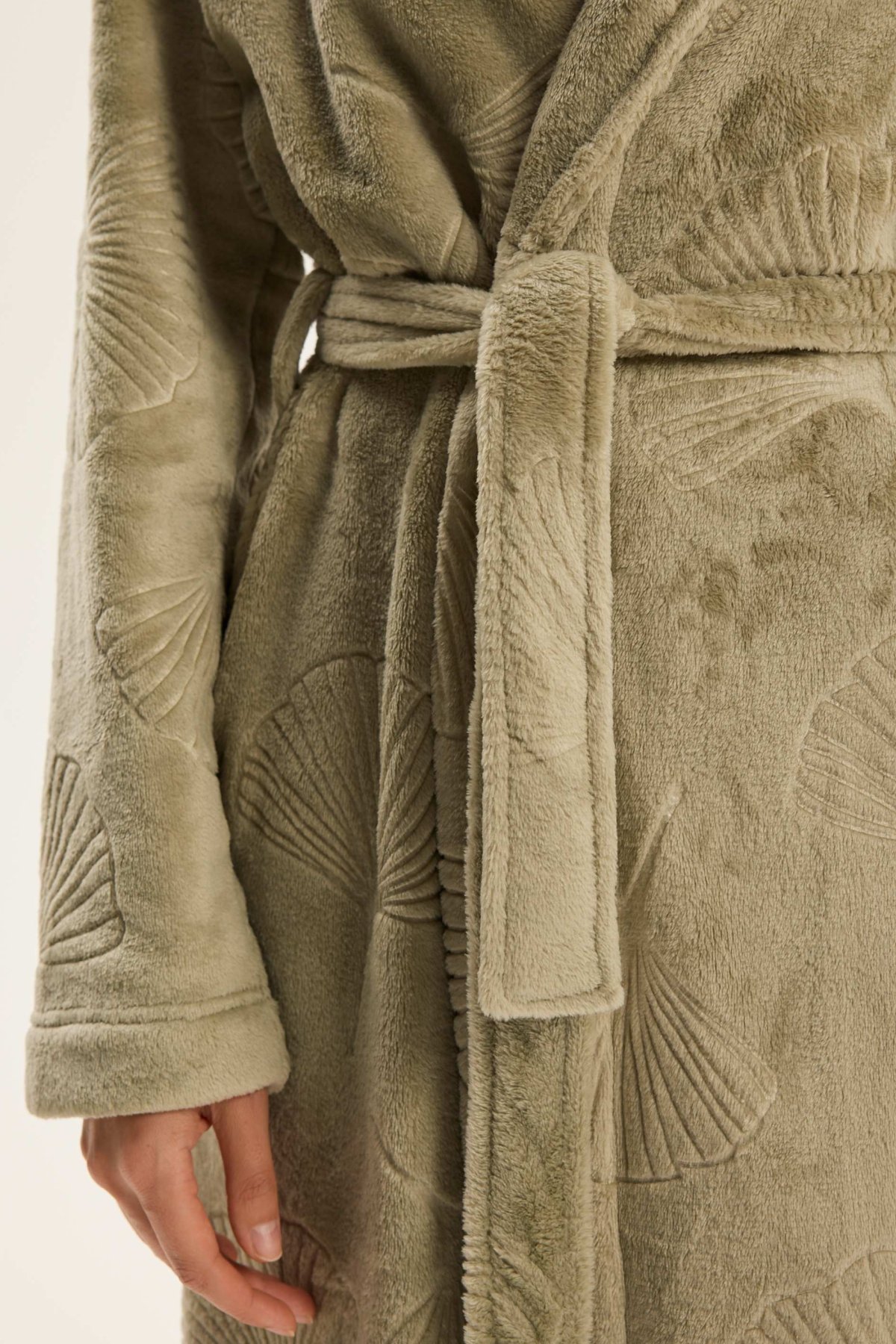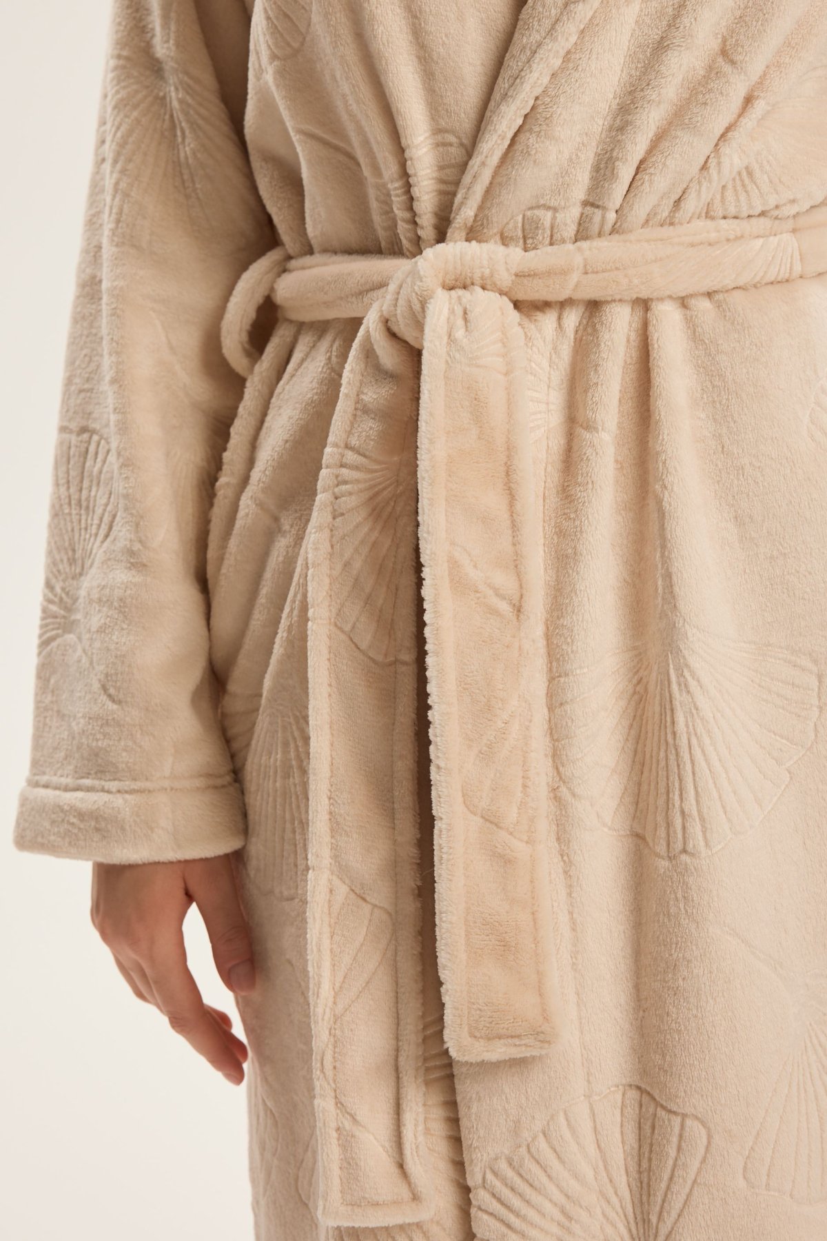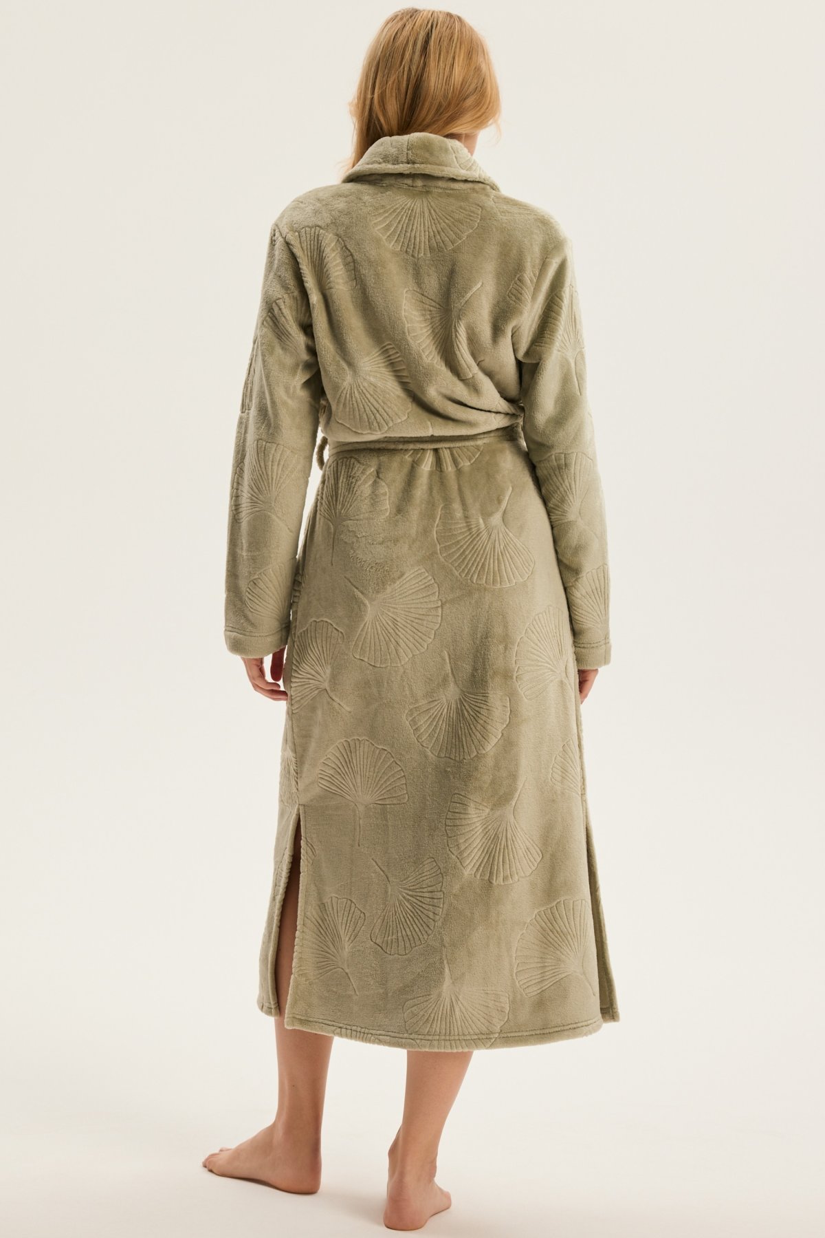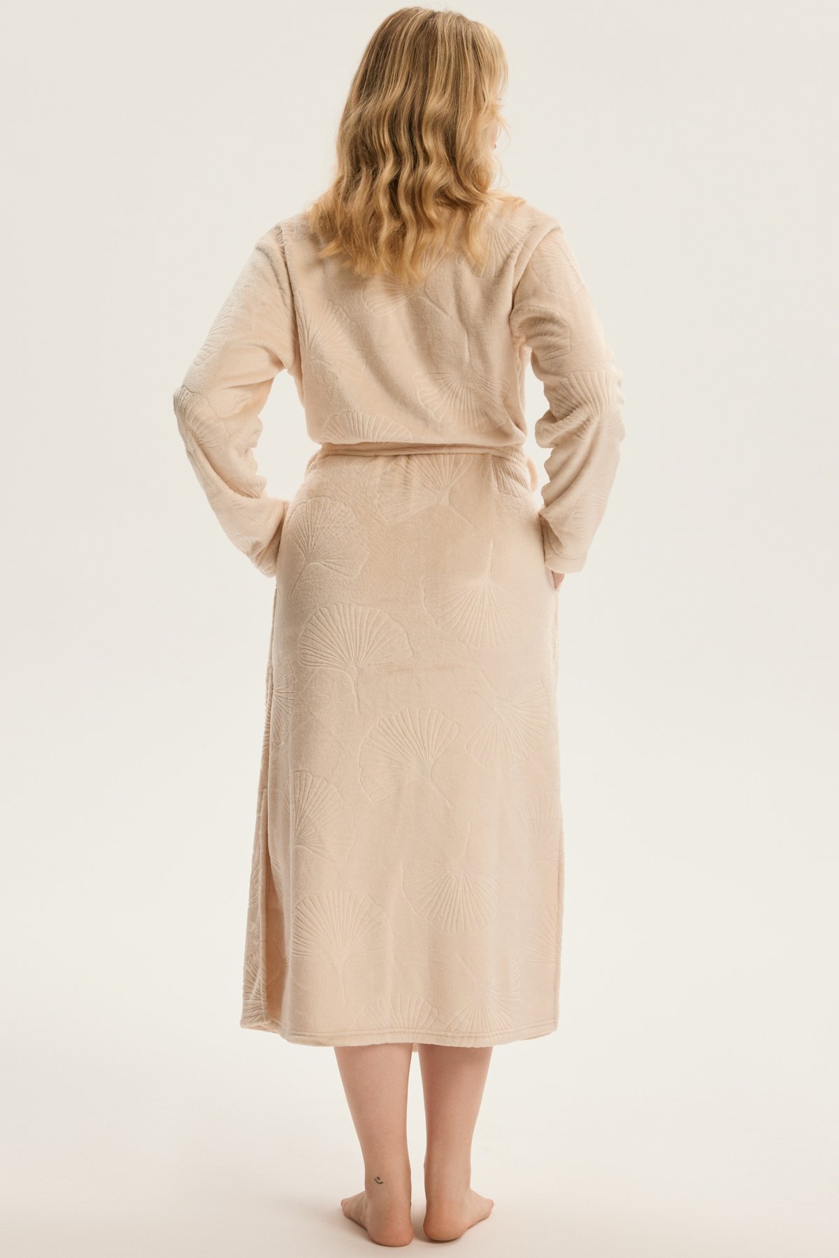 Dámský župan Como je dokonalým spojením elegance a jemného luxusu. Dlouhý střih opticky prodlužuje postavu, zatímco pásek v pase decentně zvýrazní ženské křivky. Tkanina s vytlačovaným rostlinným vzorem působí mimořádně sofistikovaně a dodává modelu dekorativní hloubku. Hebký, na dotek sametový materiál zaručuje maximální komfort při každodenním nošení. Boční rozparky zajišťují volnost pohybu a klasický šálový límec podtrhuje celkový elegantní charakter. Ideální volba pro chvíle odpočinku po koupeli i pro dlouhá, pohodová rána. Como je župan, který promění každý okamžik doma v dotek skutečného komfortu.