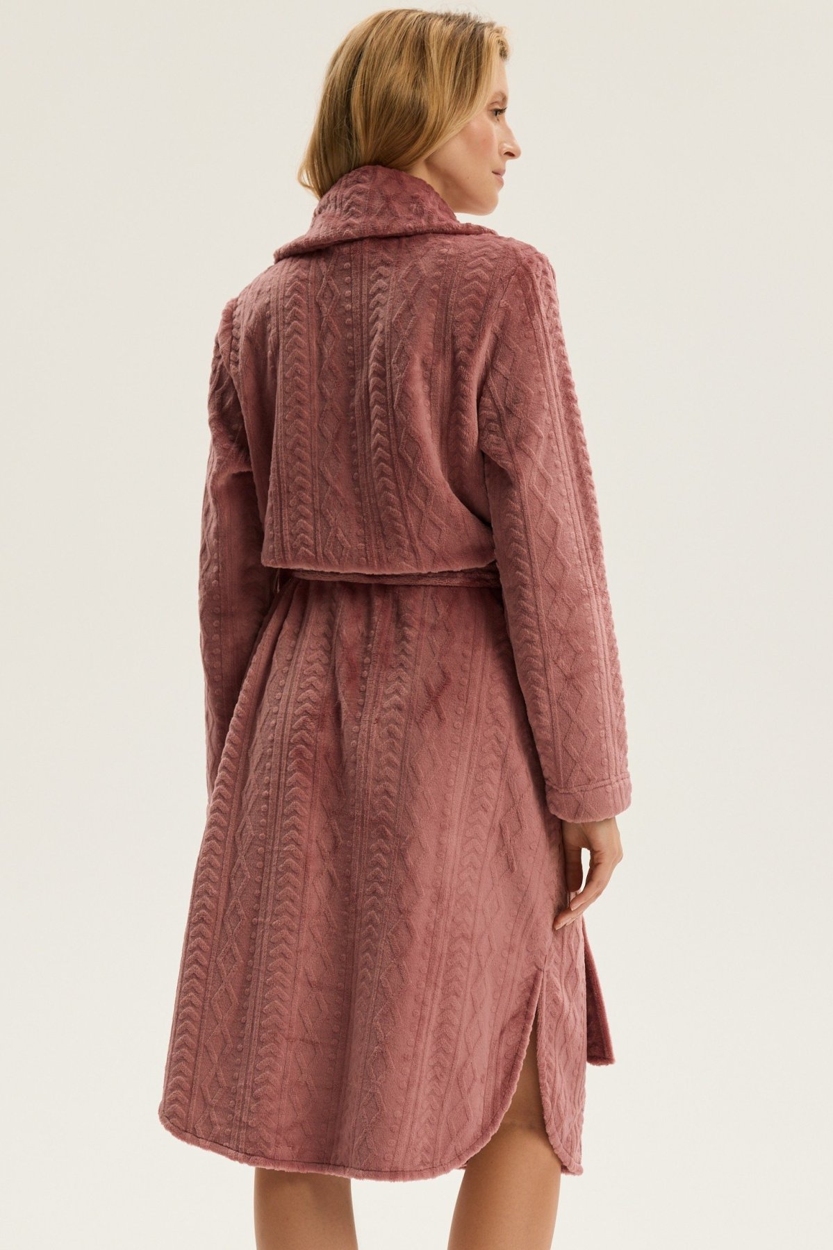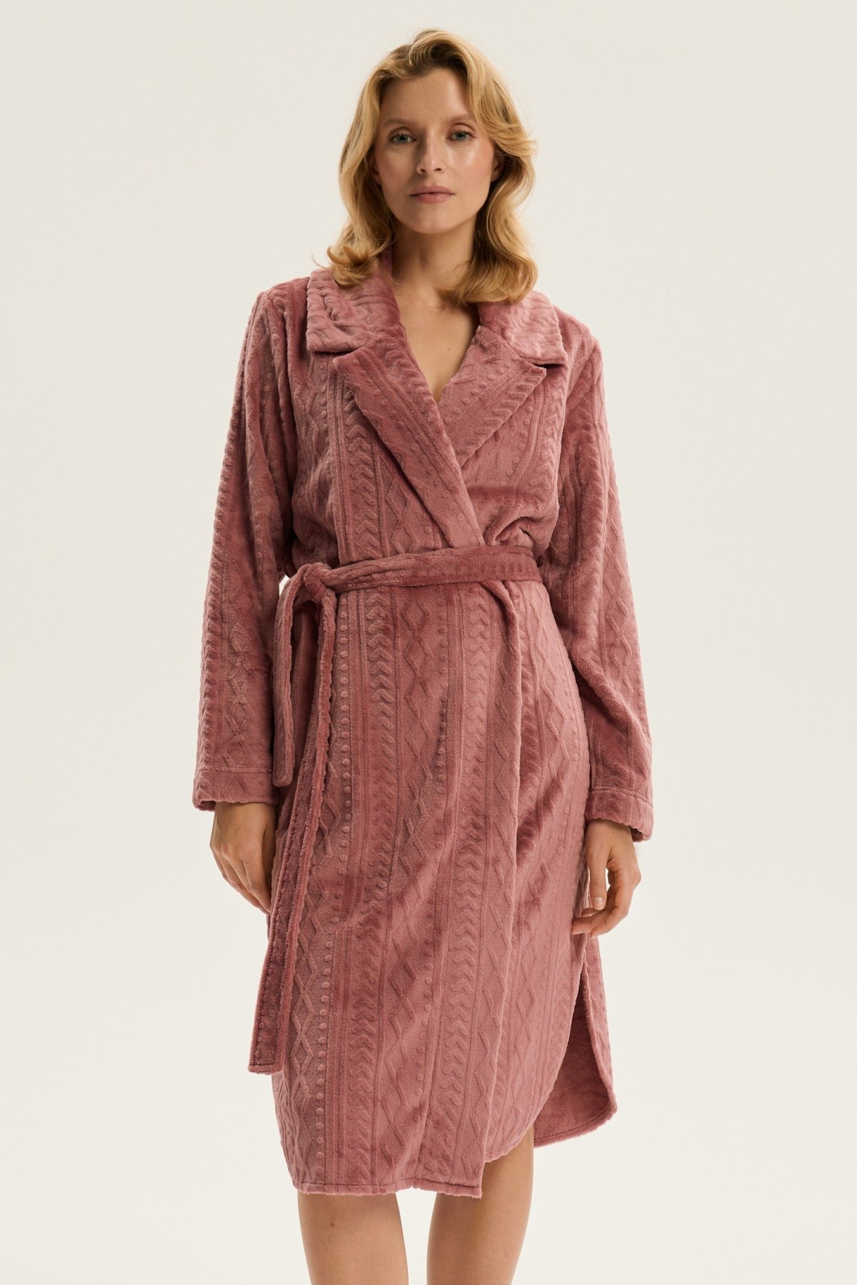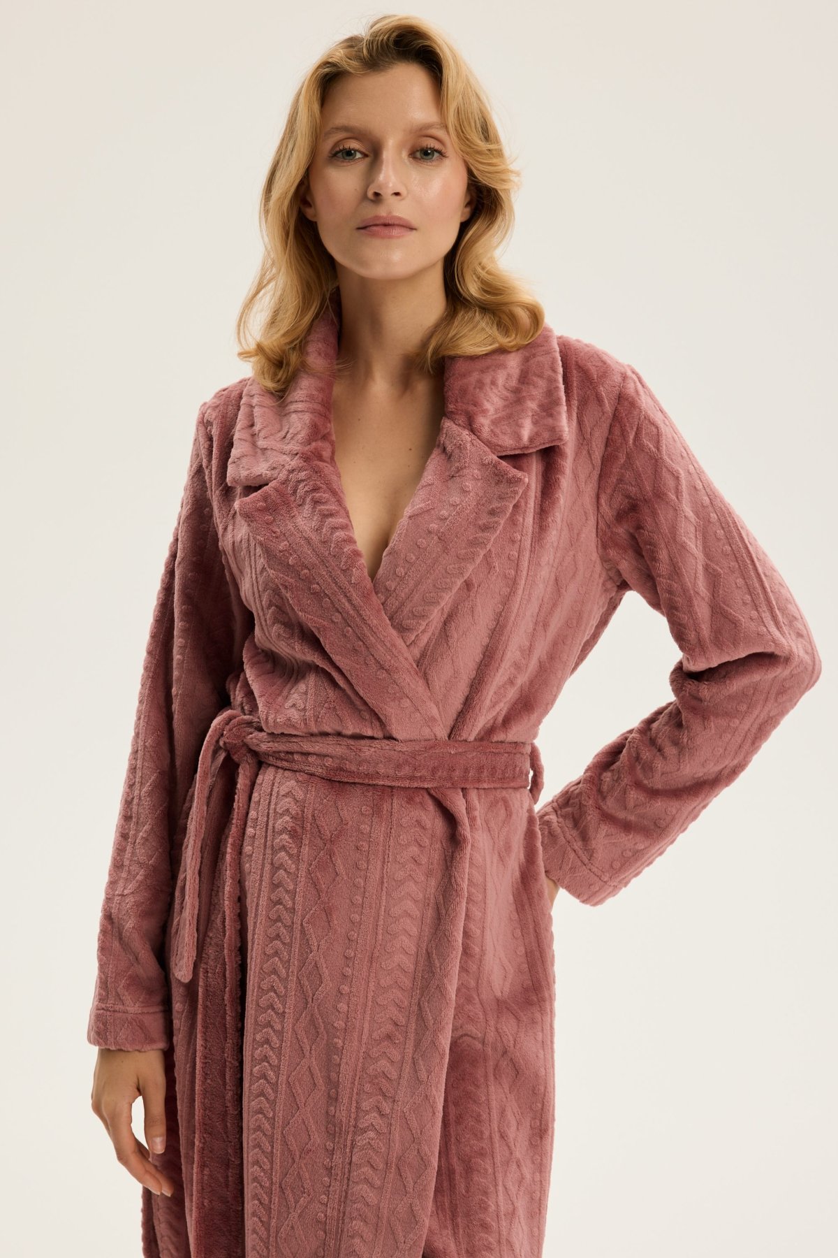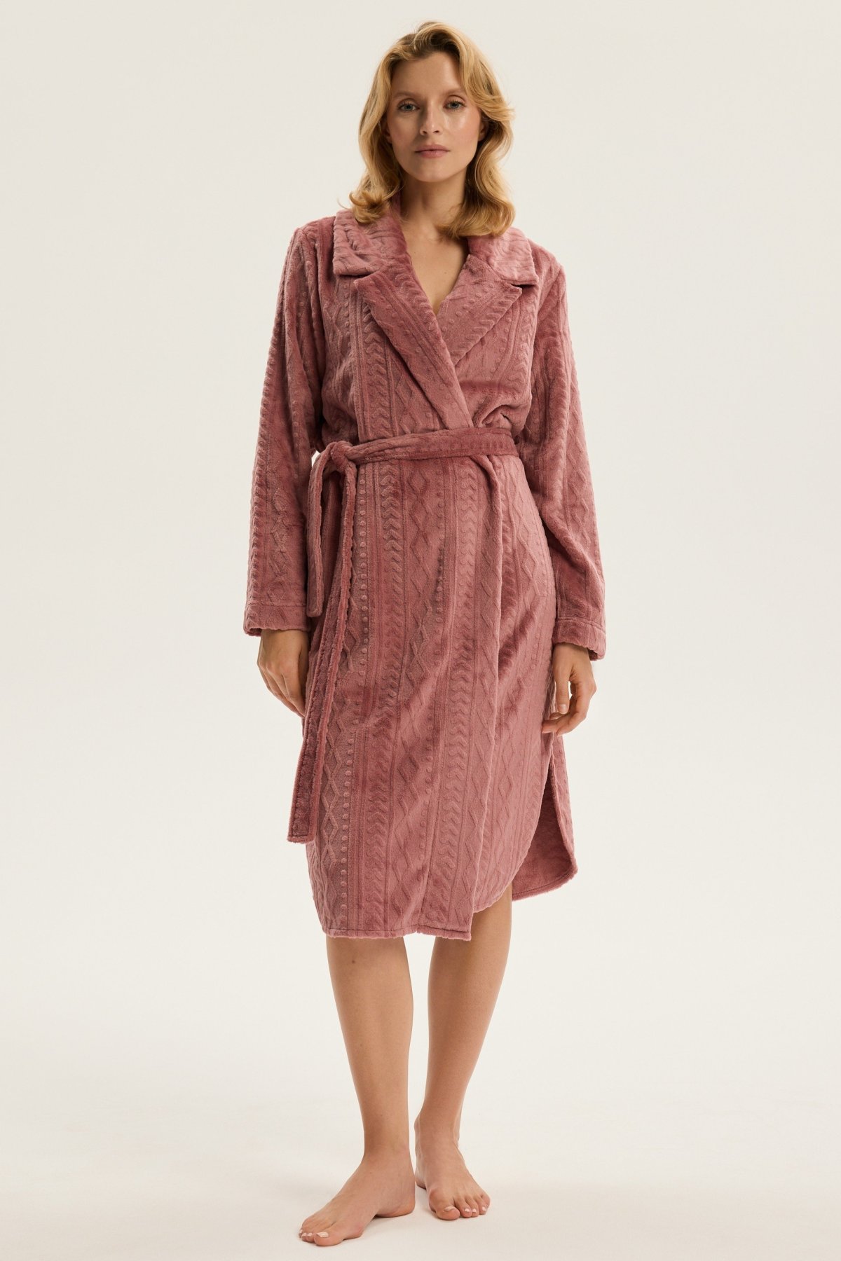 Dámský župan Esotiq Cordi. Ztělesnění ženskosti, pohodlí a jemného luxusu. Středně dlouhý střih s výrazným klopovým límcem působí elegantně a zároveň dokonale obepíná postavu, čímž vytváří lichotivý vzhled. Dekorativní textura materiálu dodává modelu rafinovaný nádech a odlišuje jej od klasických županů. Lehký a na dotek příjemný materiál zajišťuje maximální komfort při ranním probuzení i večerním odpočinku.