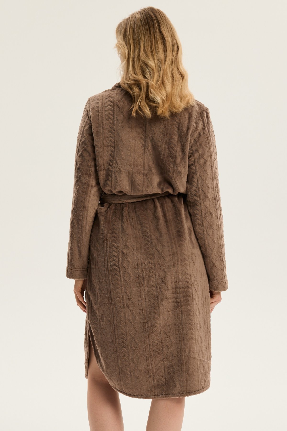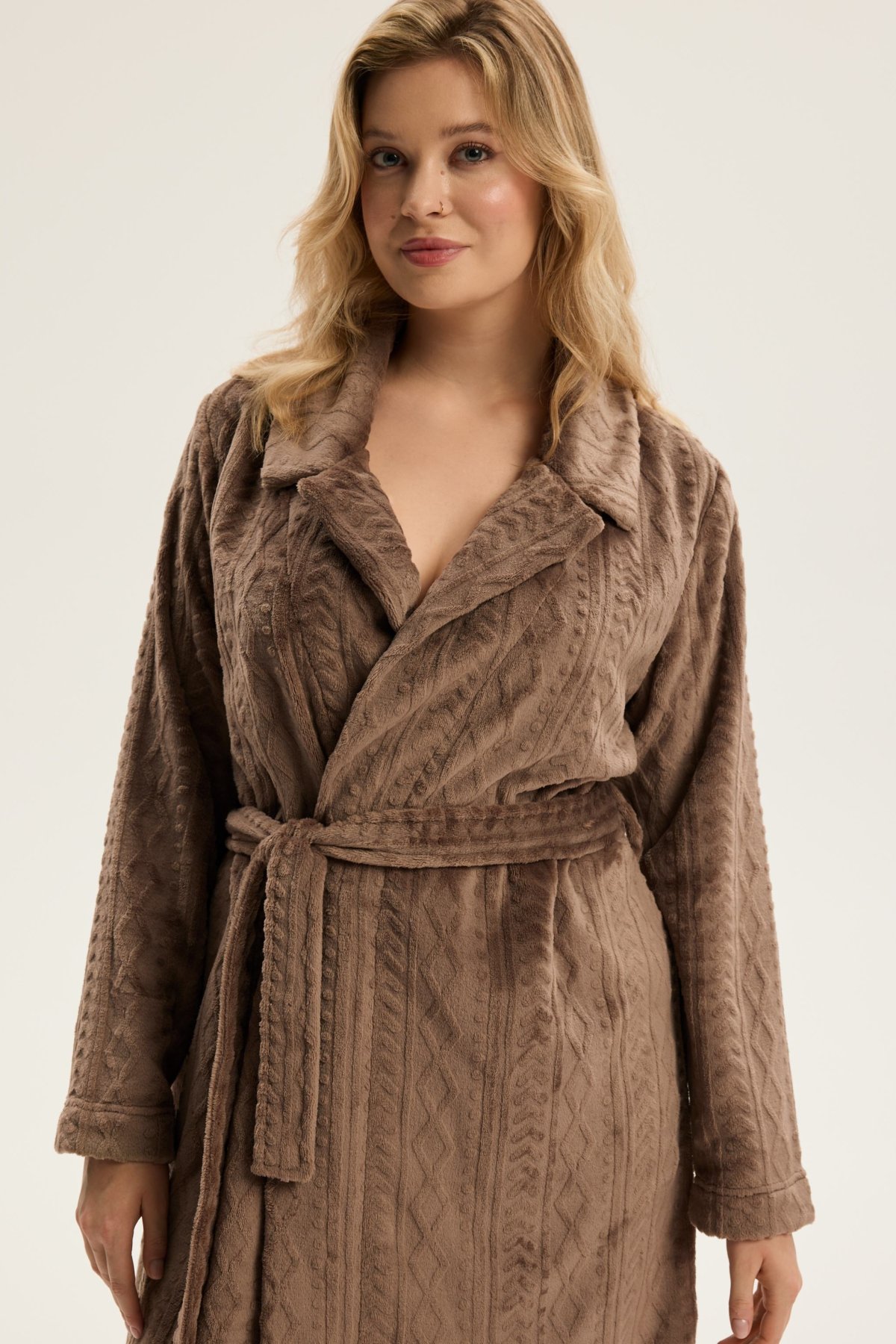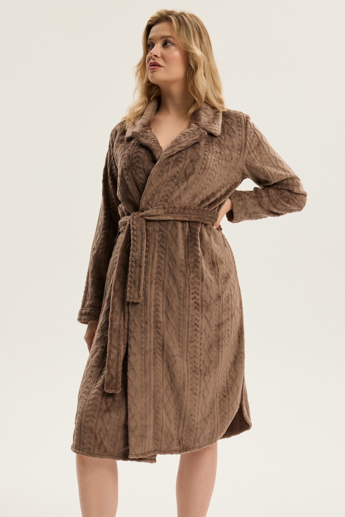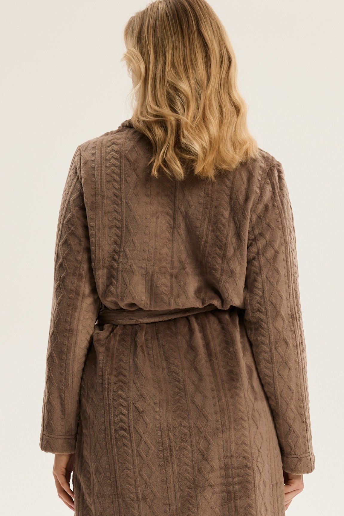 Dámský župan Esotiq Cordi. Ztělesnění ženskosti, pohodlí a jemného luxusu. Středně dlouhý střih s výrazným klopovým límcem působí elegantně a zároveň dokonale obepíná postavu, čímž vytváří lichotivý vzhled. Dekorativní textura materiálu dodává modelu rafinovaný nádech a odlišuje jej od klasických županů. Lehký a na dotek příjemný materiál zajišťuje maximální komfort při ranním probuzení i večerním odpočinku.