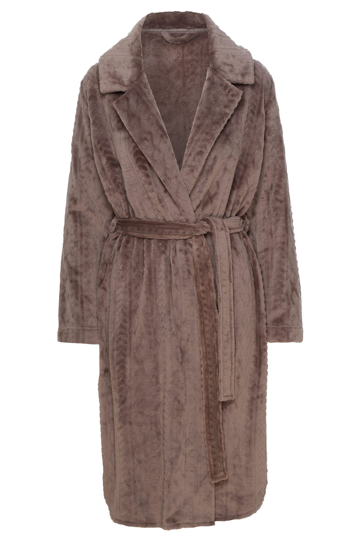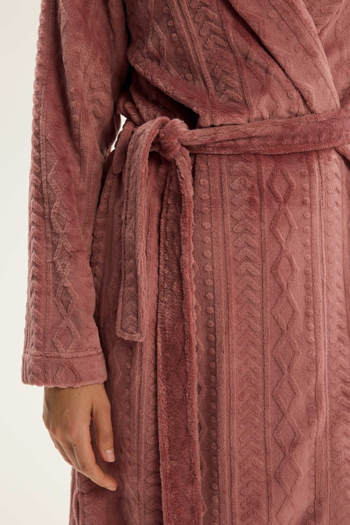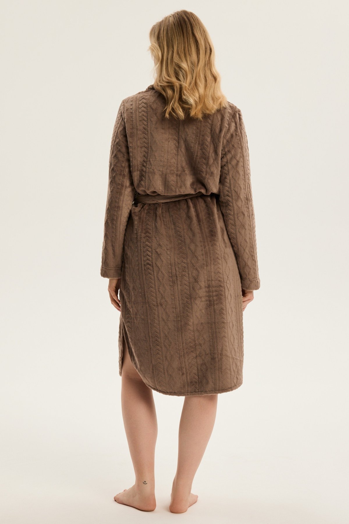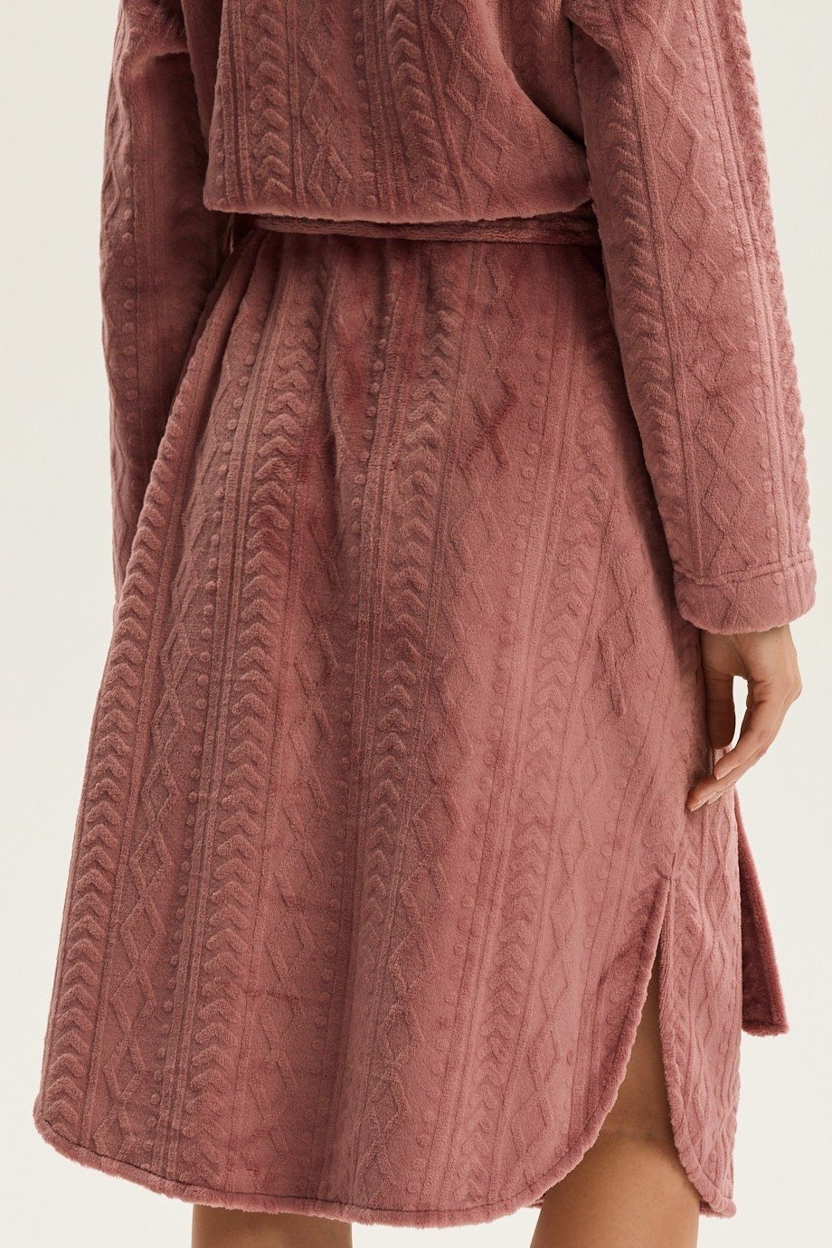 Dámský župan Esotiq Cordi. Ztělesnění ženskosti, pohodlí a jemného luxusu. Středně dlouhý střih s výrazným klopovým límcem působí elegantně a zároveň dokonale obepíná postavu, čímž vytváří lichotivý vzhled. Dekorativní textura materiálu dodává modelu rafinovaný nádech a odlišuje jej od klasických županů. Lehký a na dotek příjemný materiál zajišťuje maximální komfort při ranním probuzení i večerním odpočinku.