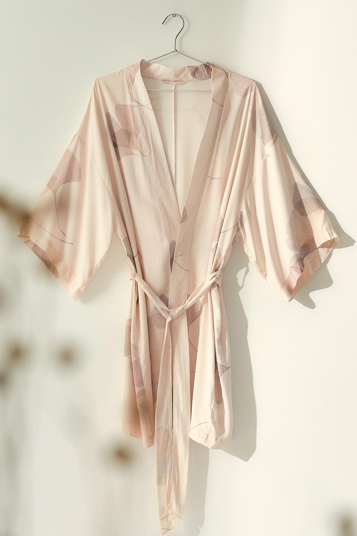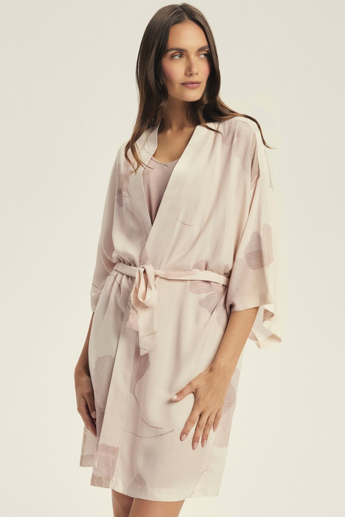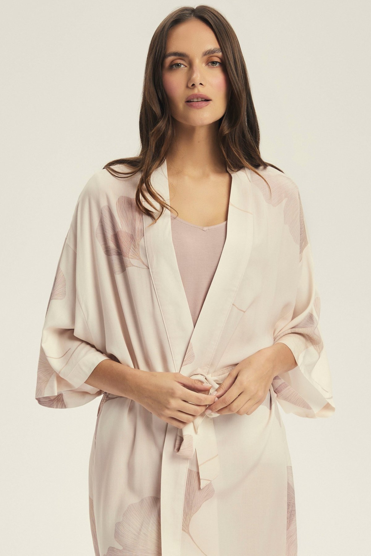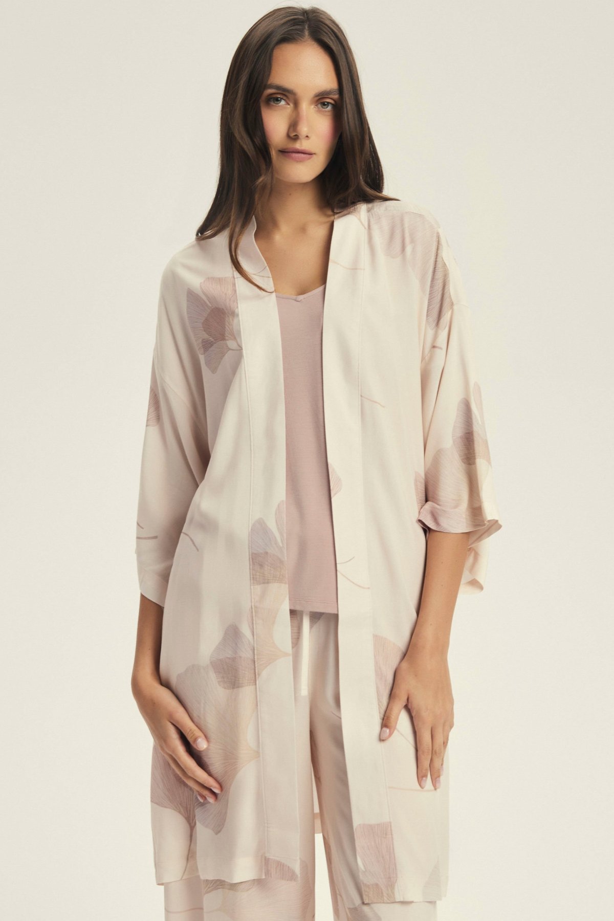 Jemný potisk v tónech růžové a pudrově béžové působí jako akvarelová malba – lehce, romanticky a stylově. Tento župan se stane vaším oblíbeným kouskem pro chvíle klidu a relaxace – lehounký, ženský a dokonale elegantní.