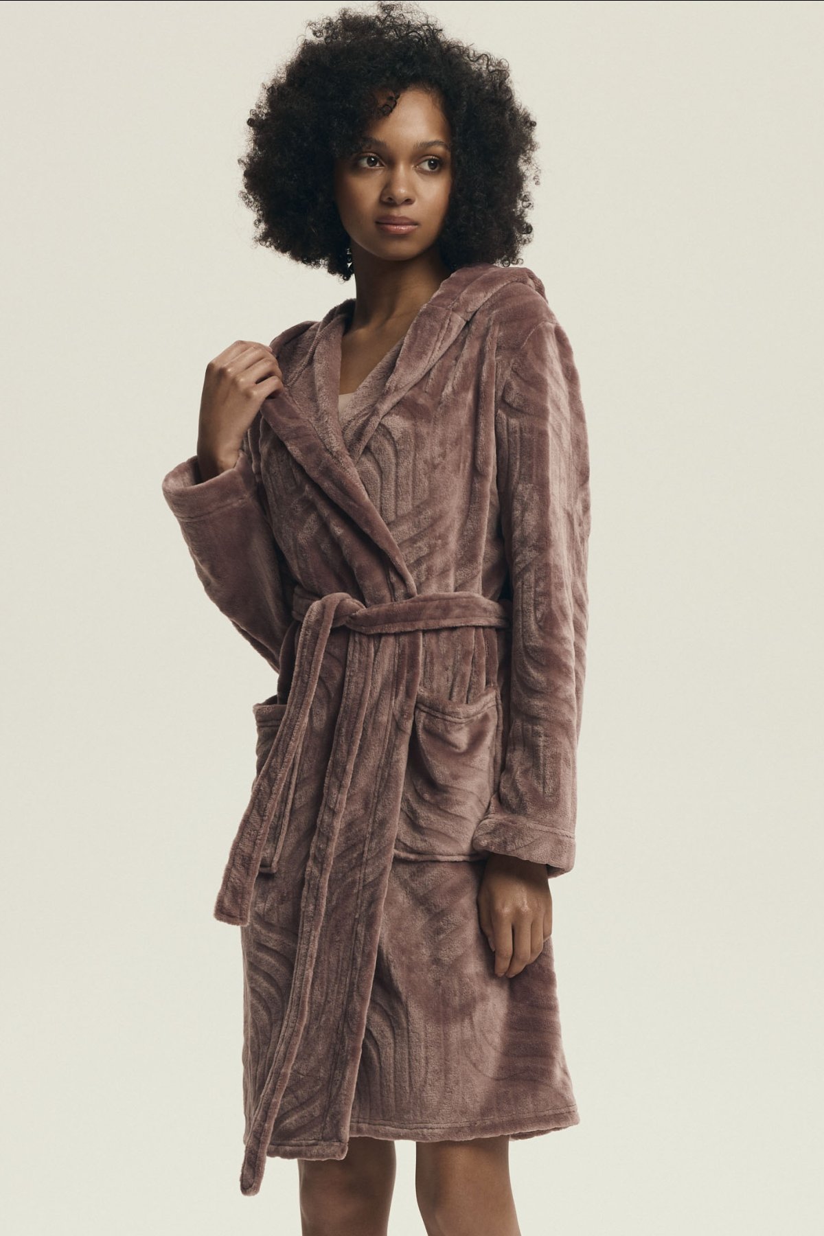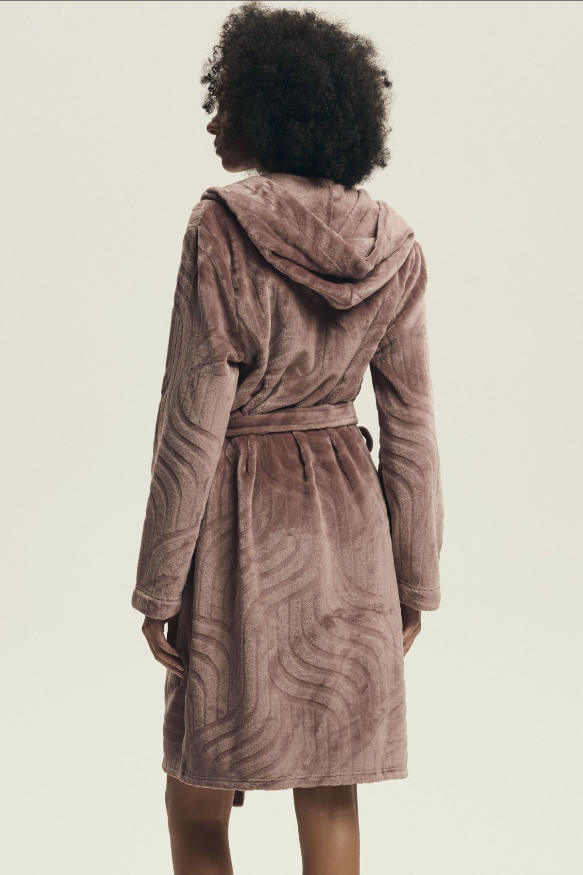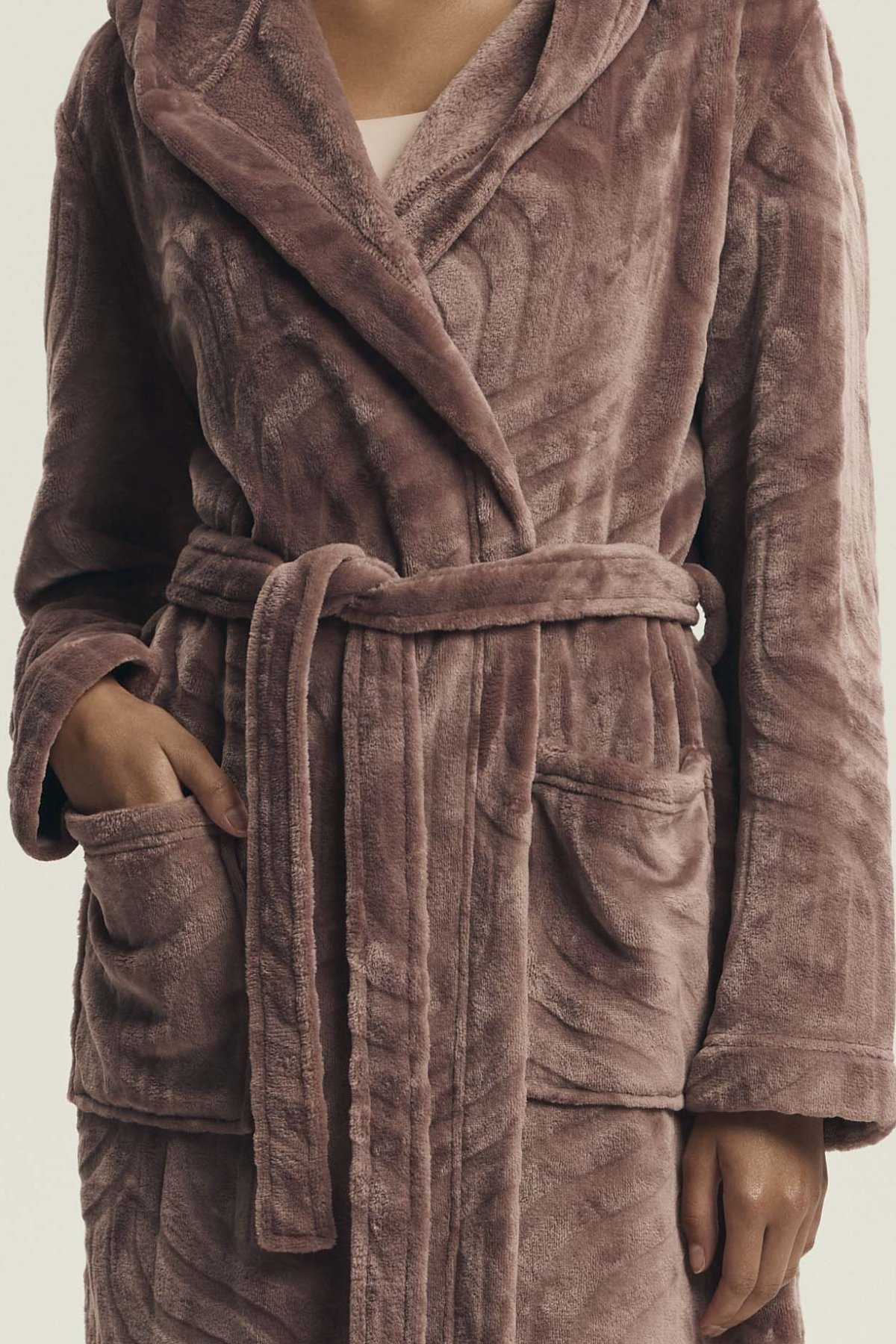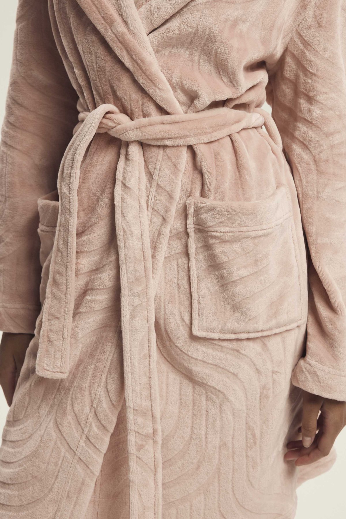 Župan Devyn zaujme jemným vzhledem a útulným provedením, které působí pohodlně a zároveň upraveně. Prostorná kapuce, zavazování v pase a délka ke kolenům z něj dělají praktický domácí kousek pro pomalejší rána, večerní relax i chvíle po koupeli. Růžový či světle hnědý odstín navíc podtrhuje jeho měkký a ženský charakter. Na fotografiích je vidět také plastický vlnitý vzor, který oživuje jinak čistý střih a dodává županu zajímavější strukturu. Po stranách nechybí našité kapsy, do kterých snadno schováte drobnosti nebo jen ruce pro větší pohodlí.