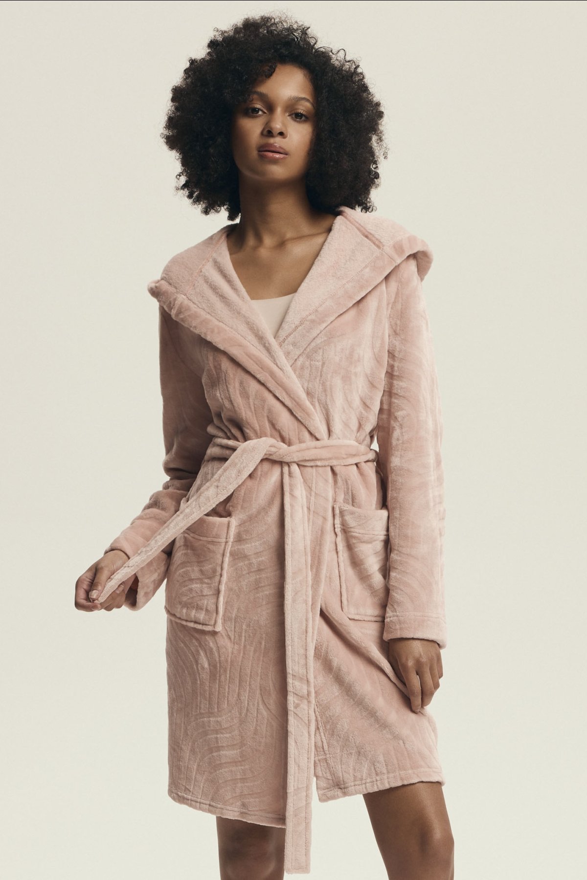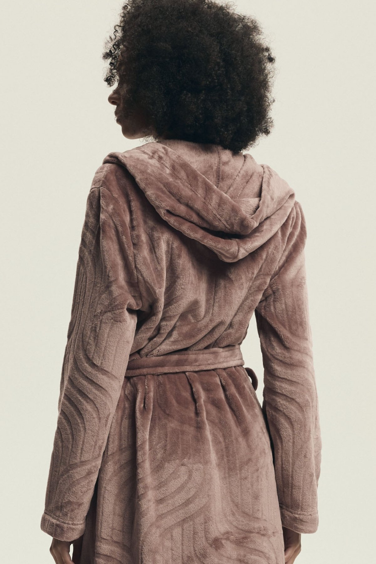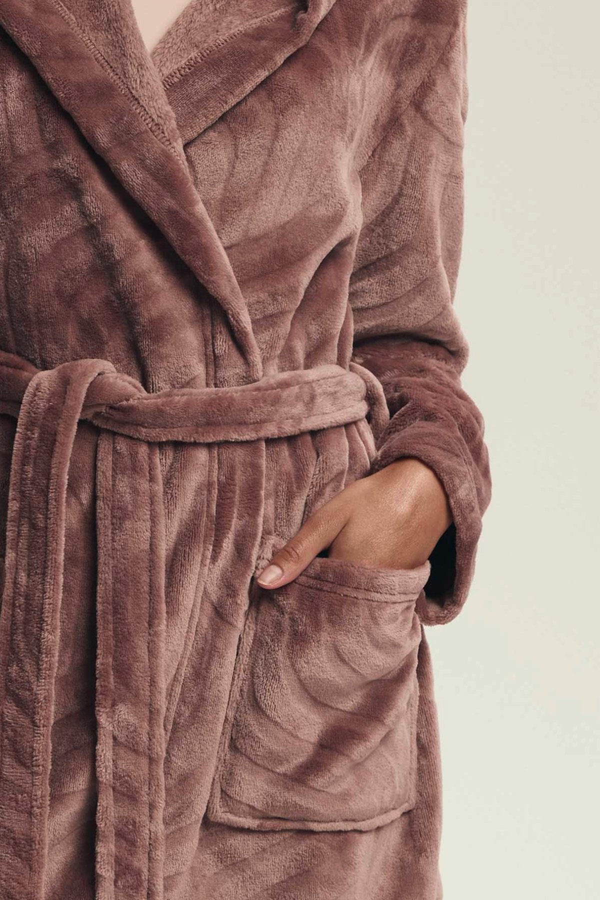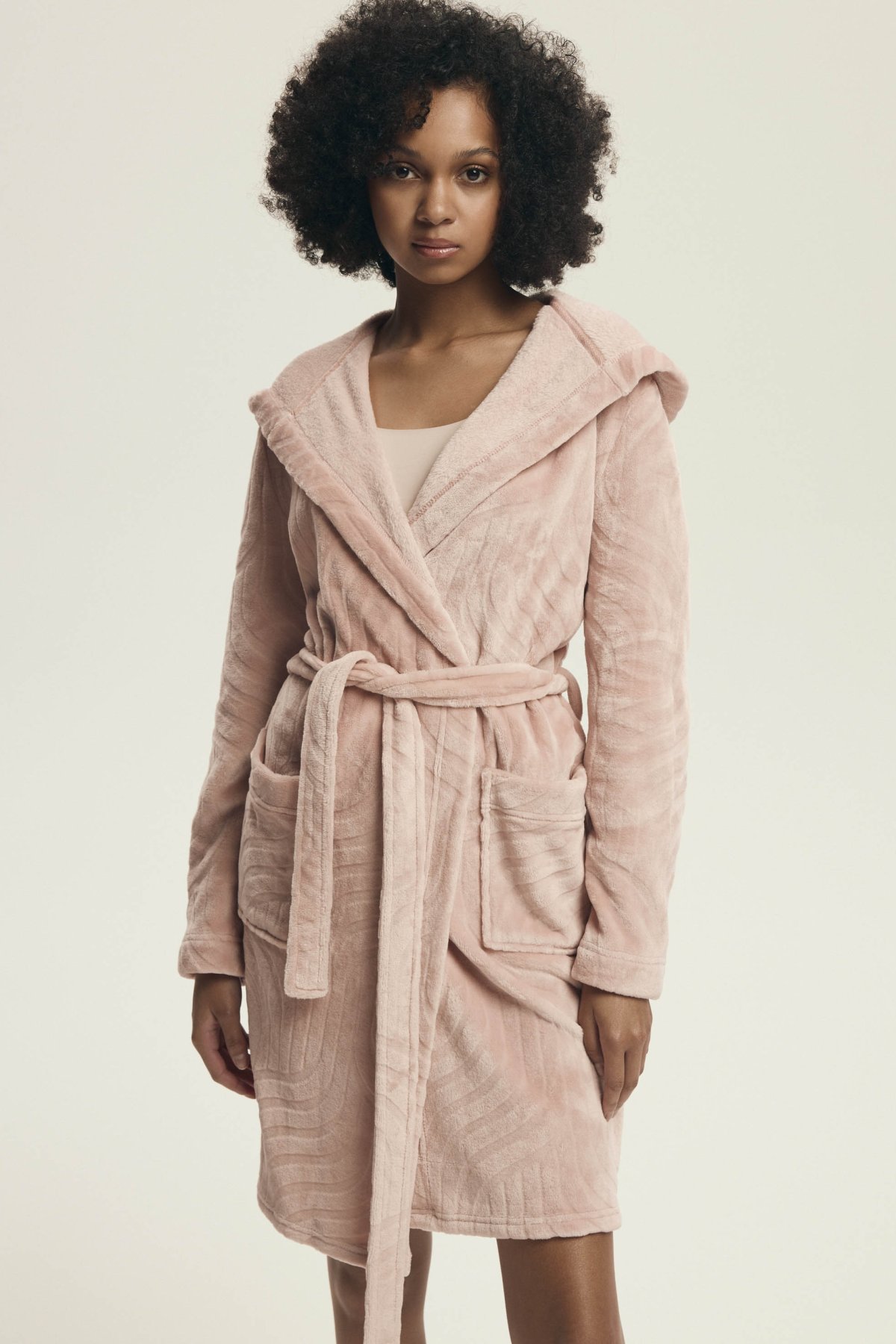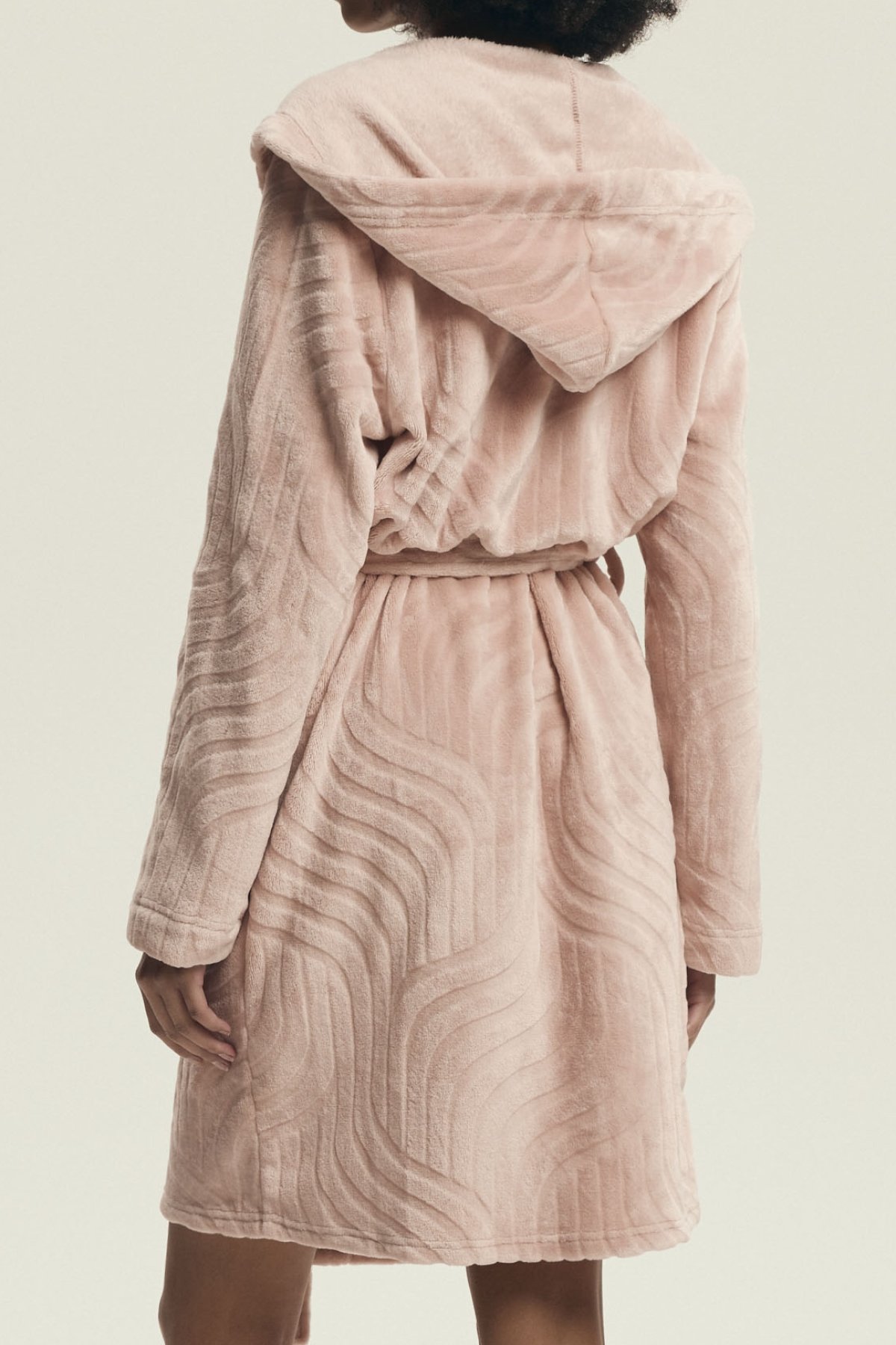 Župan Devyn zaujme jemným vzhledem a útulným provedením, které působí pohodlně a zároveň upraveně. Prostorná kapuce, zavazování v pase a délka ke kolenům z něj dělají praktický domácí kousek pro pomalejší rána, večerní relax i chvíle po koupeli. Růžový či světle hnědý odstín navíc podtrhuje jeho měkký a ženský charakter. Na fotografiích je vidět také plastický vlnitý vzor, který oživuje jinak čistý střih a dodává županu zajímavější strukturu. Po stranách nechybí našité kapsy, do kterých snadno schováte drobnosti nebo jen ruce pro větší pohodlí.