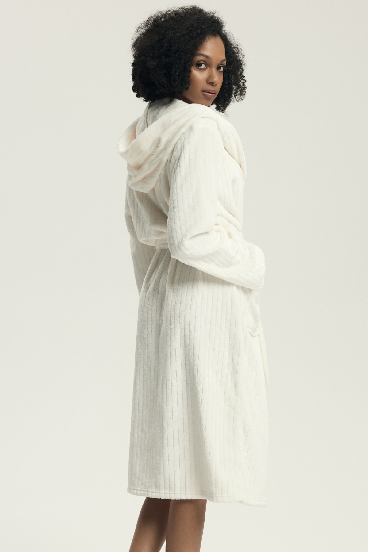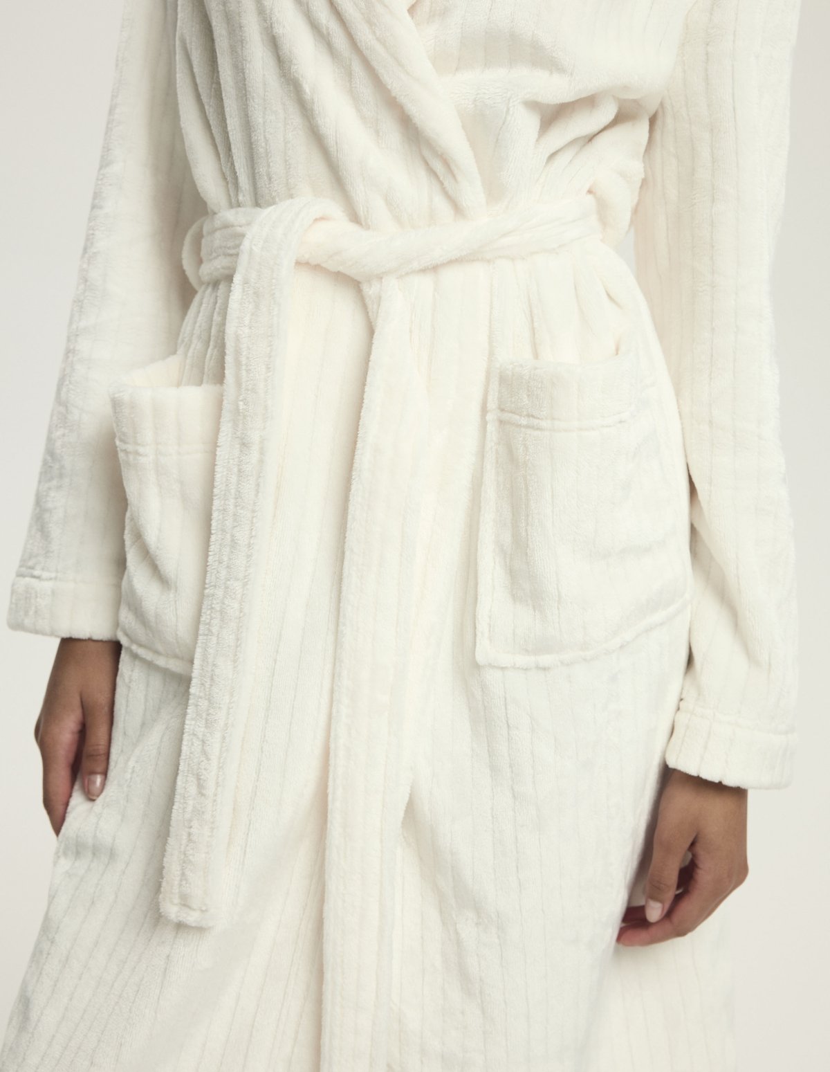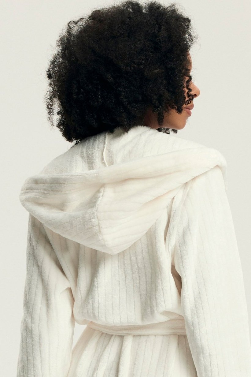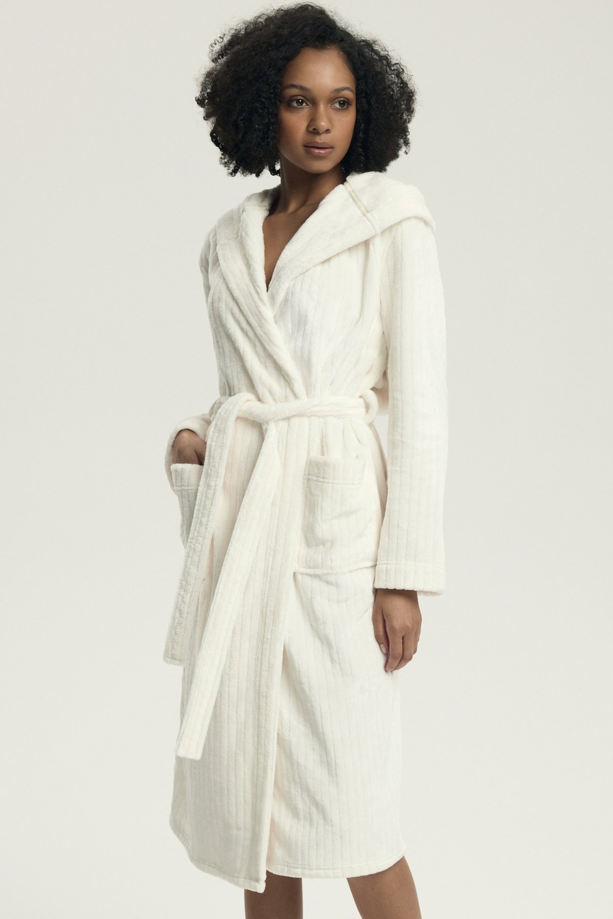 Dámský župan Dionne představuje dokonalou kombinaci elegance a komfortu. Vyrobený z mimořádně měkkého materiálu s decentní pruhovanou texturou, krásně zahřeje a zároveň působí stylově. Dlouhý střih s kapucí a kapsami poskytuje maximální pohodlí a funkčnost, zatímco pásek v pase umožňuje přizpůsobit župan postavě.