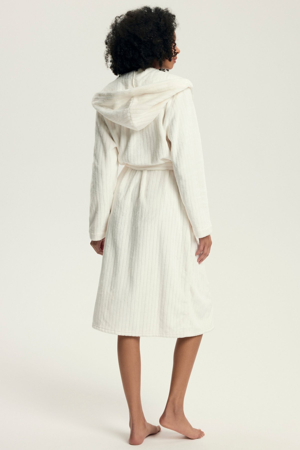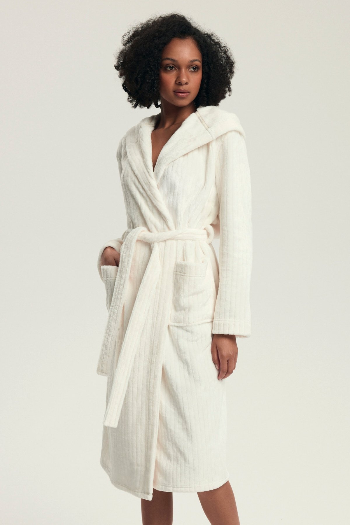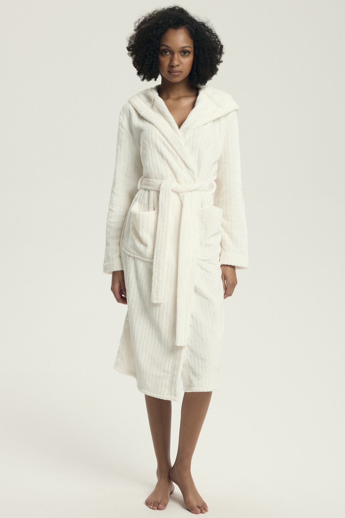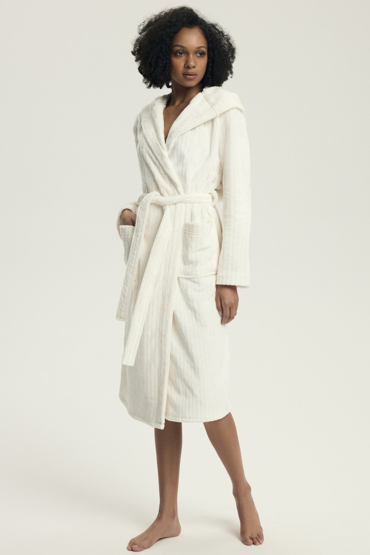 Dámský župan Dionne představuje dokonalou kombinaci elegance a komfortu. Vyrobený z mimořádně měkkého materiálu s decentní pruhovanou texturou, krásně zahřeje a zároveň působí stylově. Dlouhý střih s kapucí a kapsami poskytuje maximální pohodlí a funkčnost, zatímco pásek v pase umožňuje přizpůsobit župan postavě.