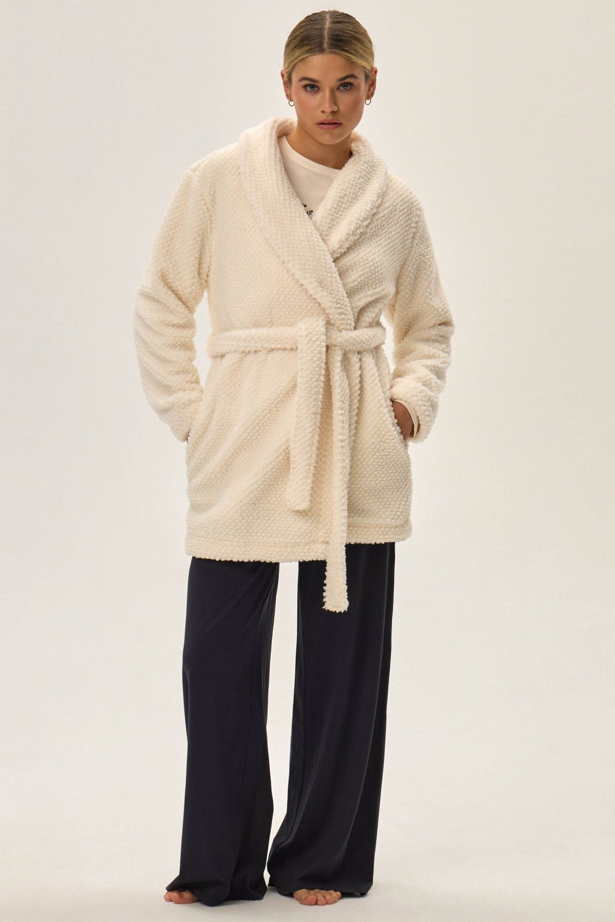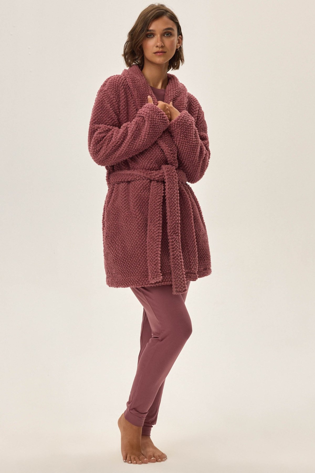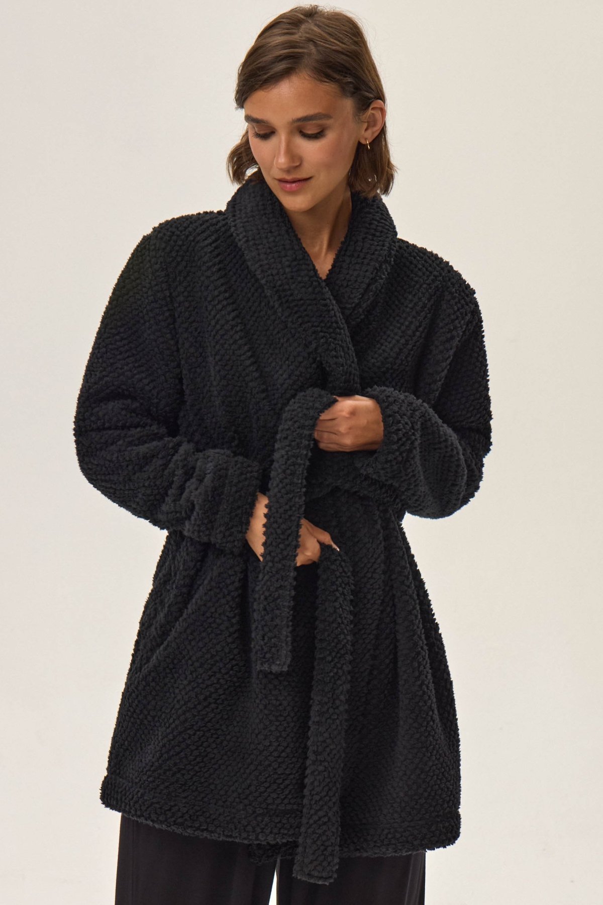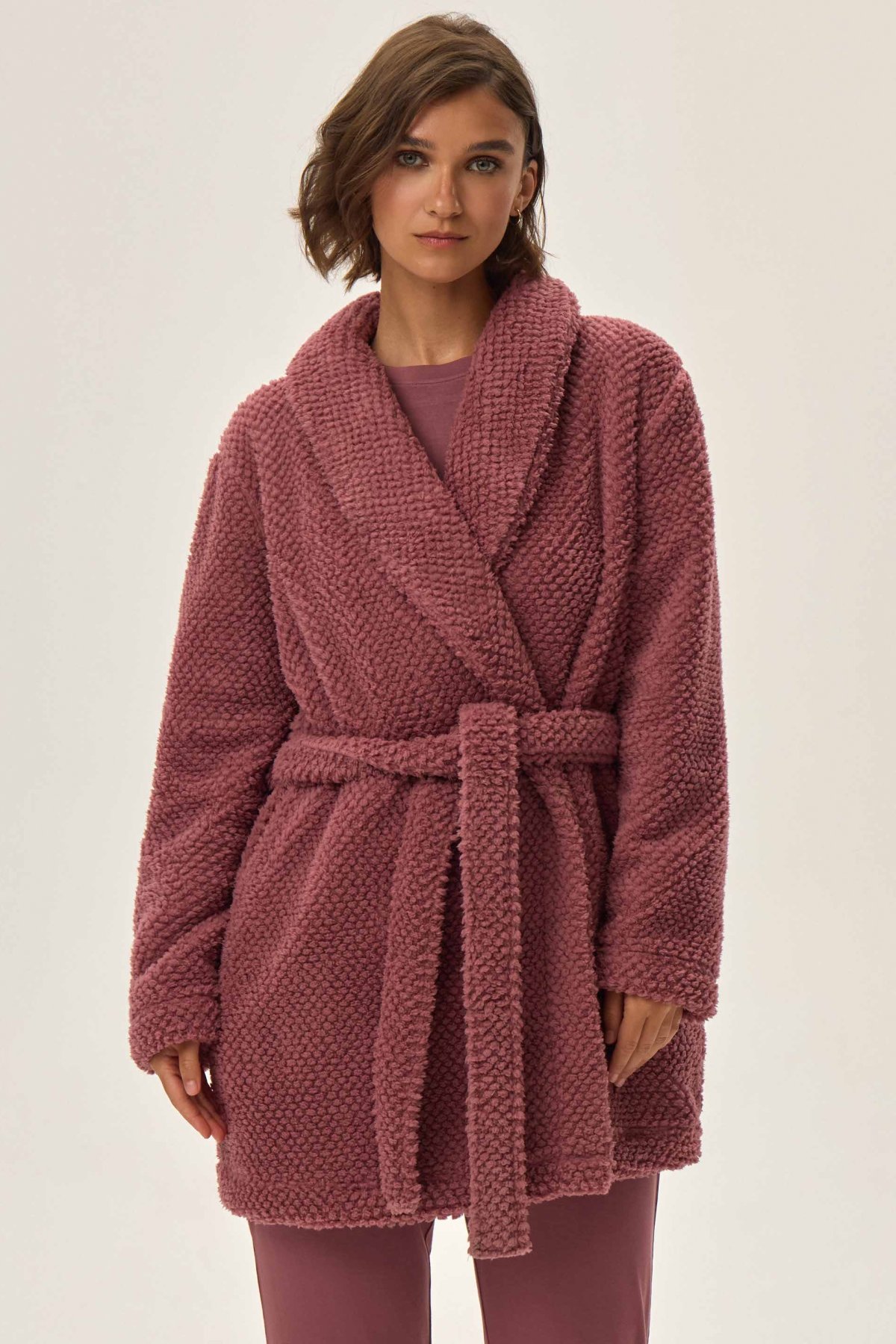 Dámský župan Jamie je synonymem pohodlí a elegance. Měkký materiál s plyšovou strukturou vás příjemně zahřeje a obklopí hebkostí, zatímco kratší střih zajistí volnost pohybu. Šálový límec a decentní geometrická textura dodávají županu stylový, moderní vzhled. Ideální pro večerní relax i líná rána – krásně ladí s pyžamem nebo noční košilkou.