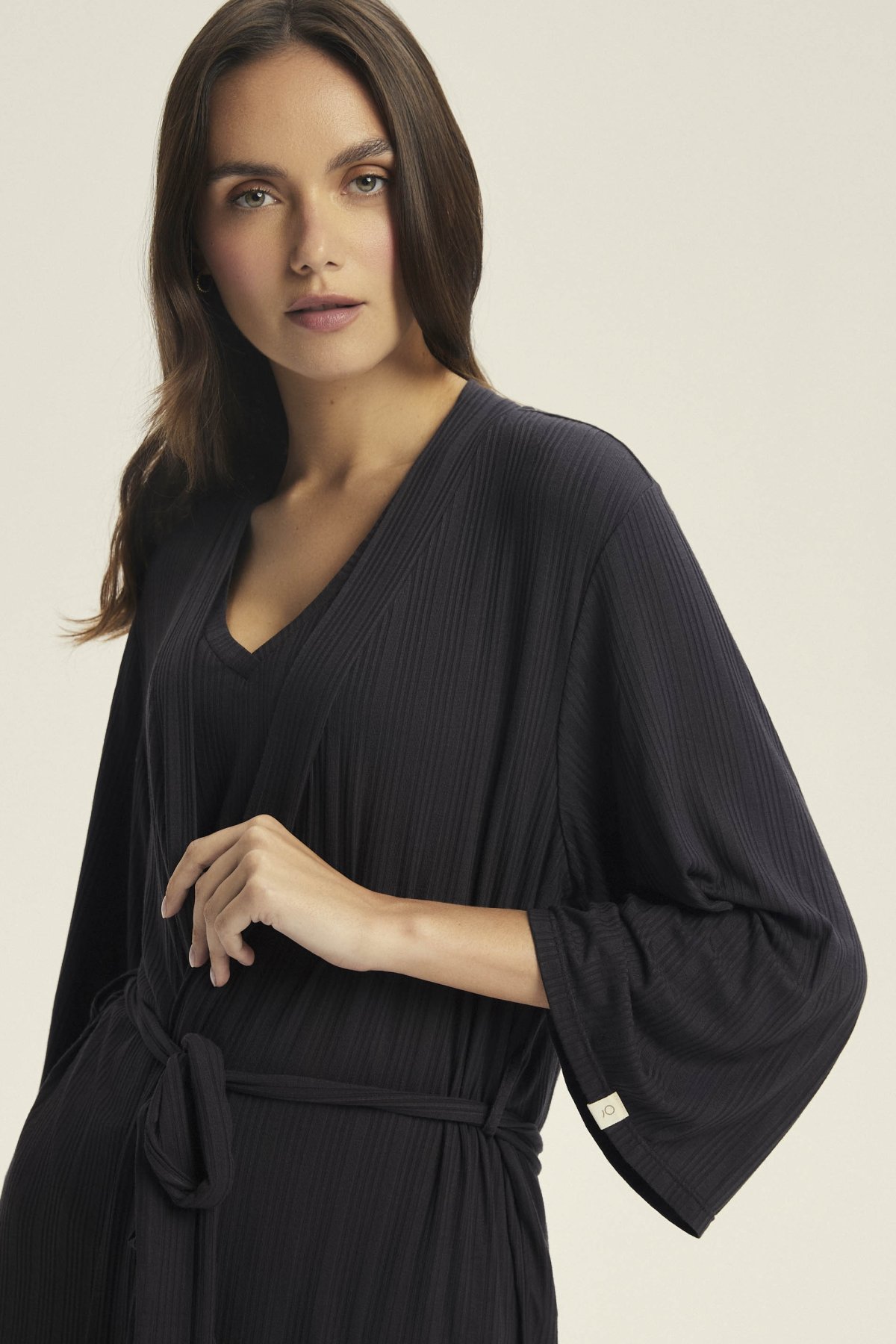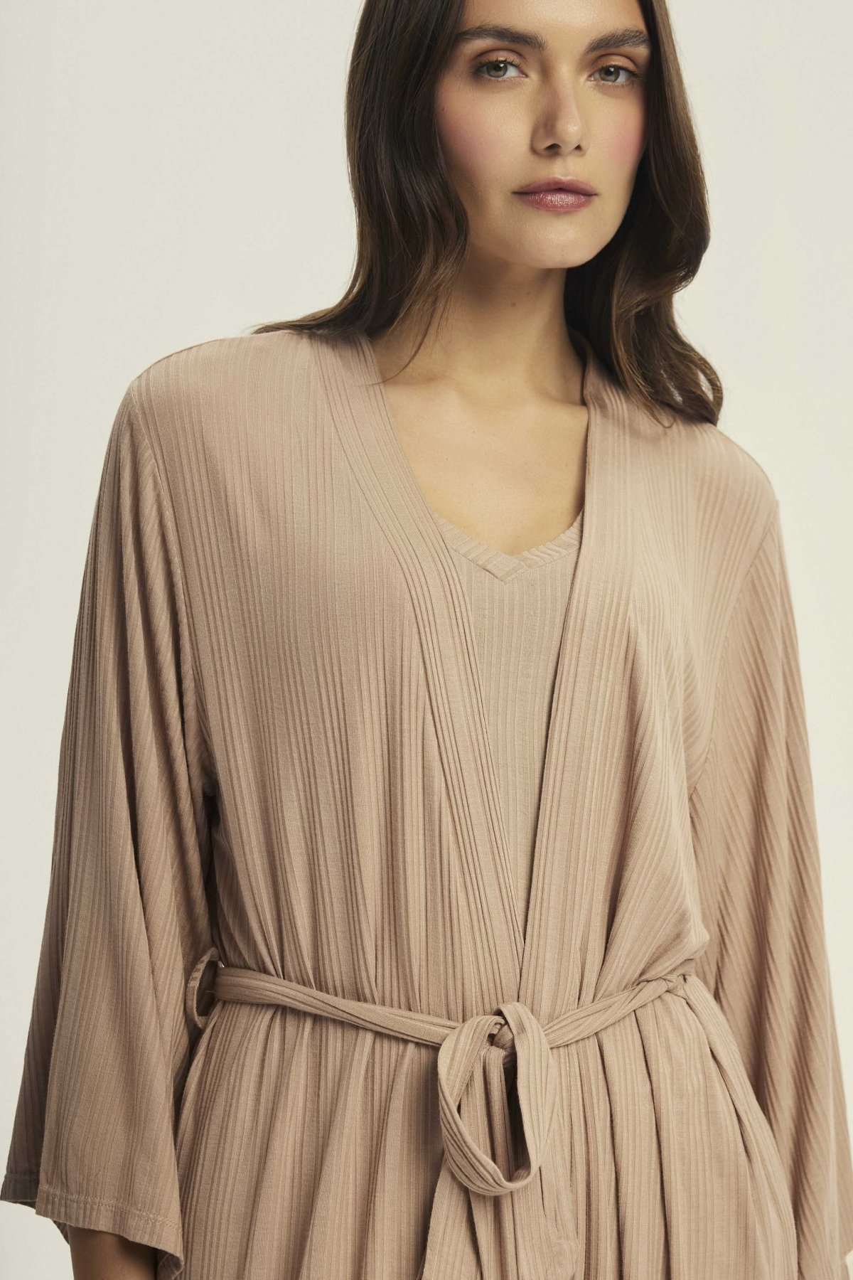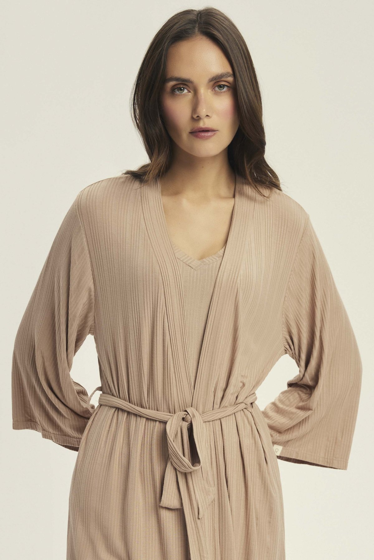 Elegantní župan Jenius obklopí tělo měkkostí a teplem, jako tichý dotek po probuzení. Jemně žebrovaná struktura dodává materiálu na hloubce i hebkosti, zatímco volný kimono střih lichotí postavě a zajišťuje naprosté pohodlí. Díky pásku v pase snadno zvýrazníte siluetu, pokud si přejete působit více žensky, nebo jej necháte volně pro uvolněný domácí styl.