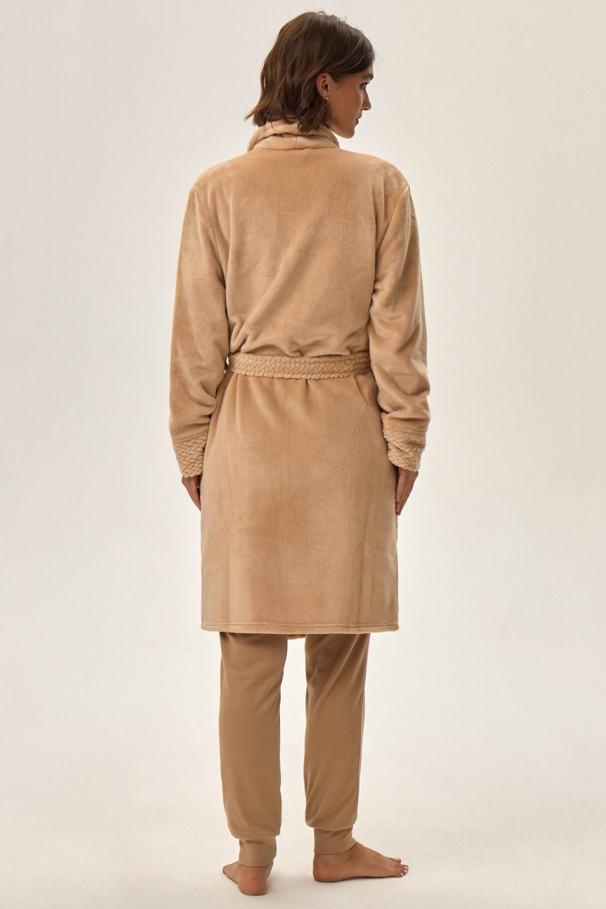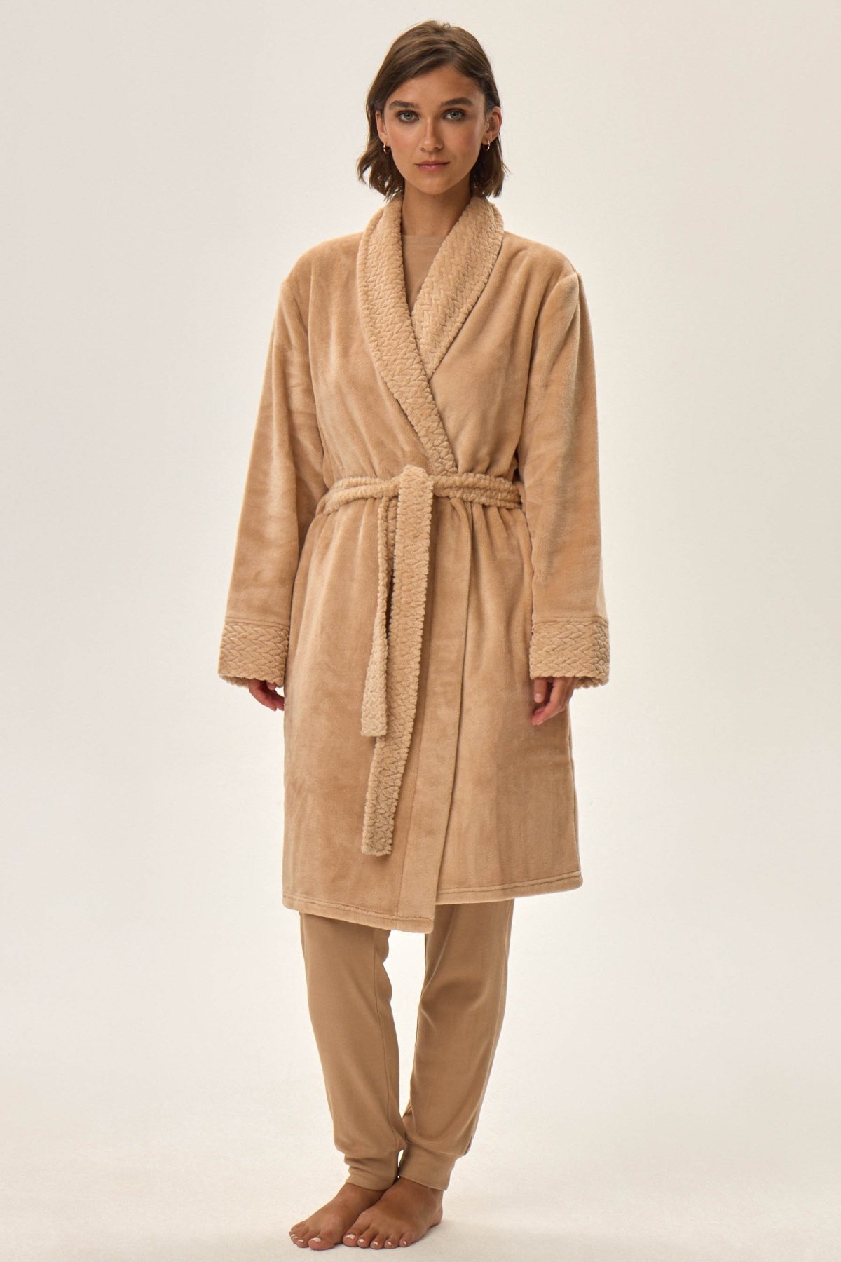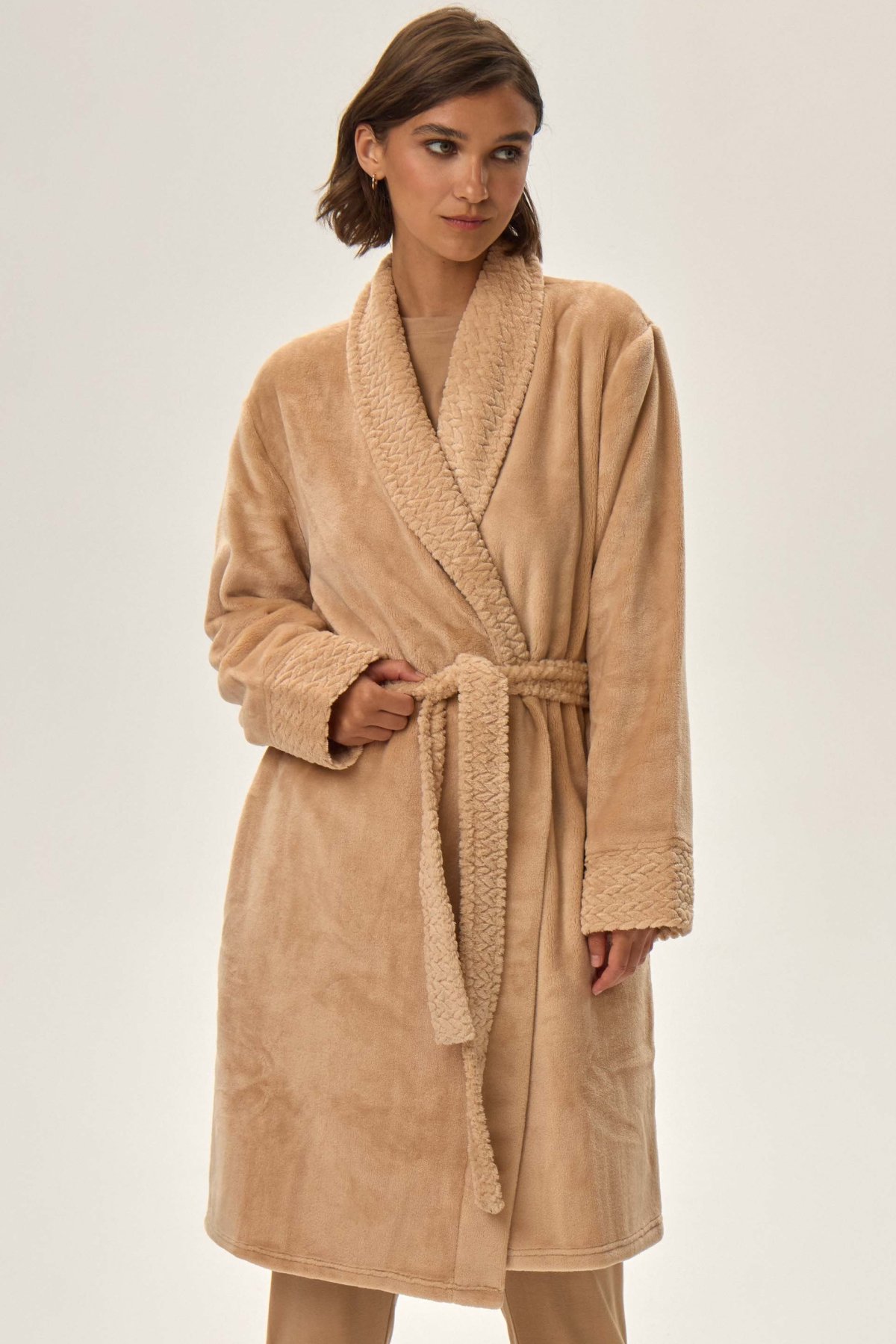 Dámský župan Jolanda je ztělesněním komfortu a elegance. Díky hřejivému materiálu a střihu téměř ke kolenům skvěle zahřeje po koupeli nebo během chladných rán. Klasický design doplňují stylové, vzorované lemy, které dodávají modelu šmrnc. Díky pásku v pase si snadno přizpůsobíte střih podle své postavy. Tento univerzální kousek spojuje praktičnost s jemným, ženským stylem.