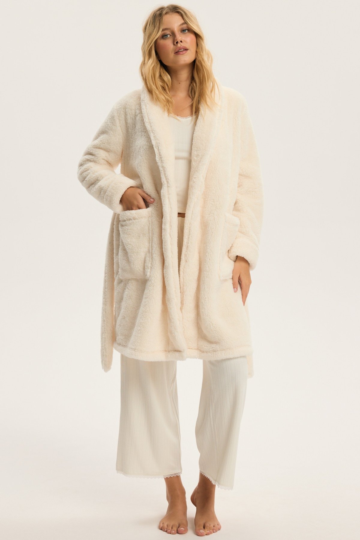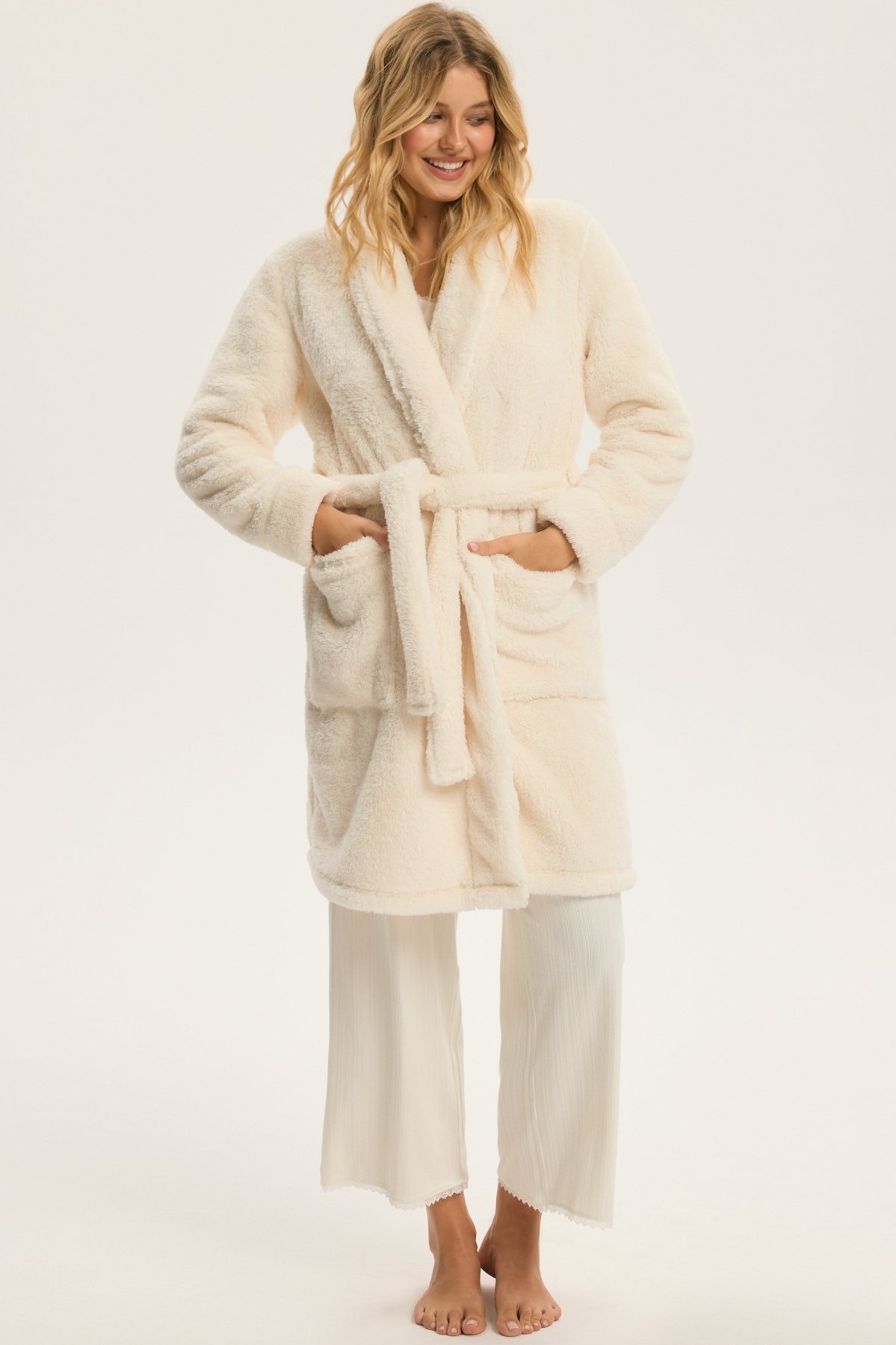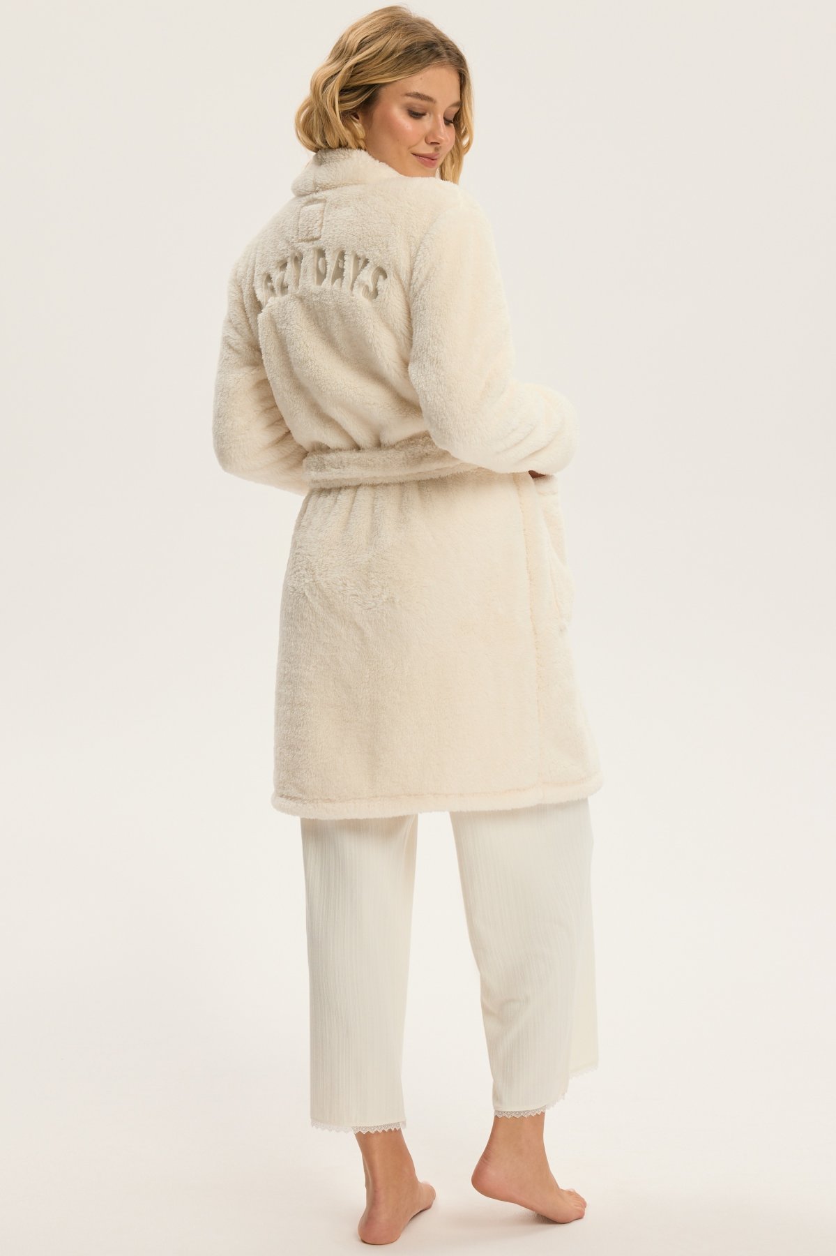 Dámský župan Quiet v jemně krémovém odstínu. Synonymum klidu, elegance a ženského půvabu. Jeho lehký, nadýchaný a hladký materiál krásně splývá. Páskem v pase lze snadno zvýraznit postavu a dodat modelu sofistikovaný tvar. Díky decentnímu střihu se hodí jak pro večerní relax doma, tak i jako doplněk k pyžamu či negližé. Perfektní volba pro ženy, které chtějí vypadat stylově i ve chvílích odpočinku.