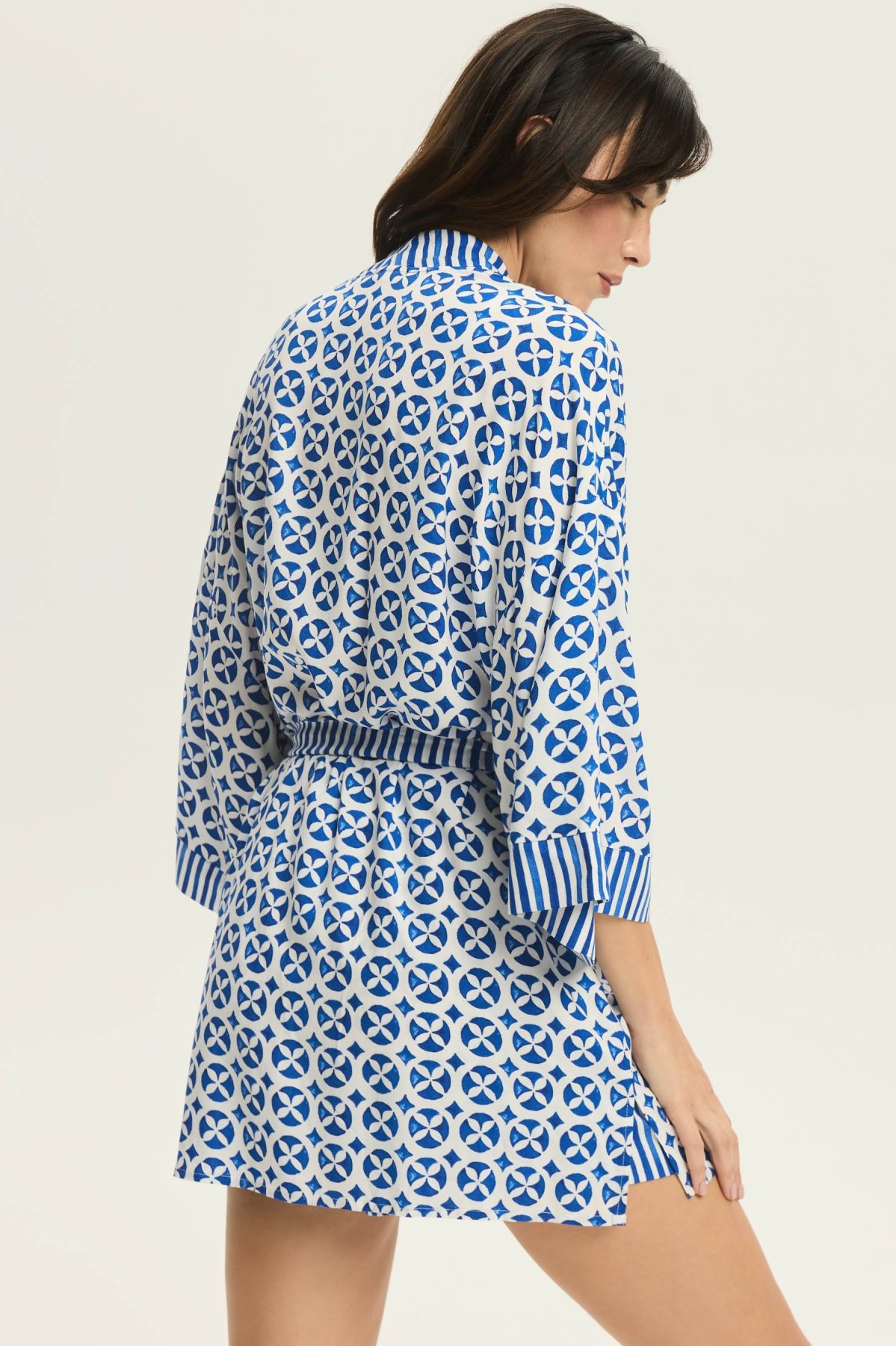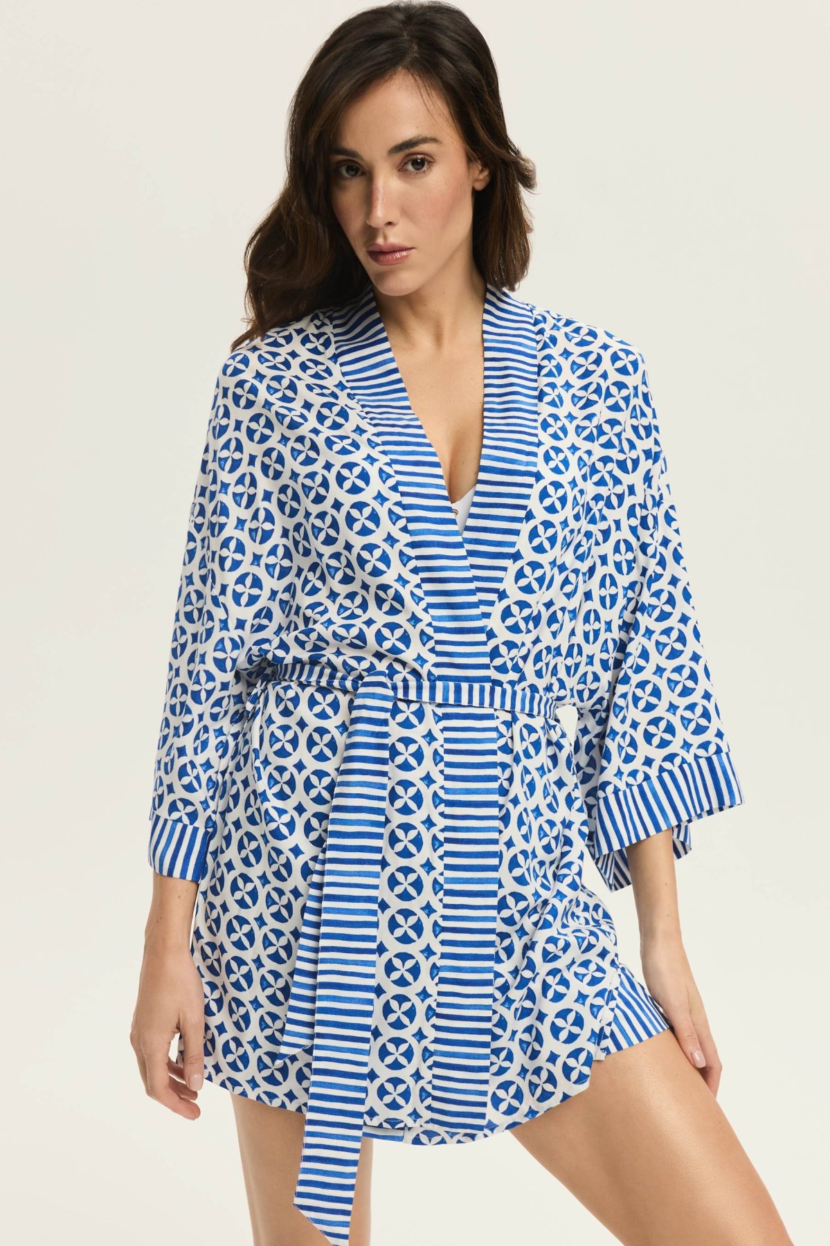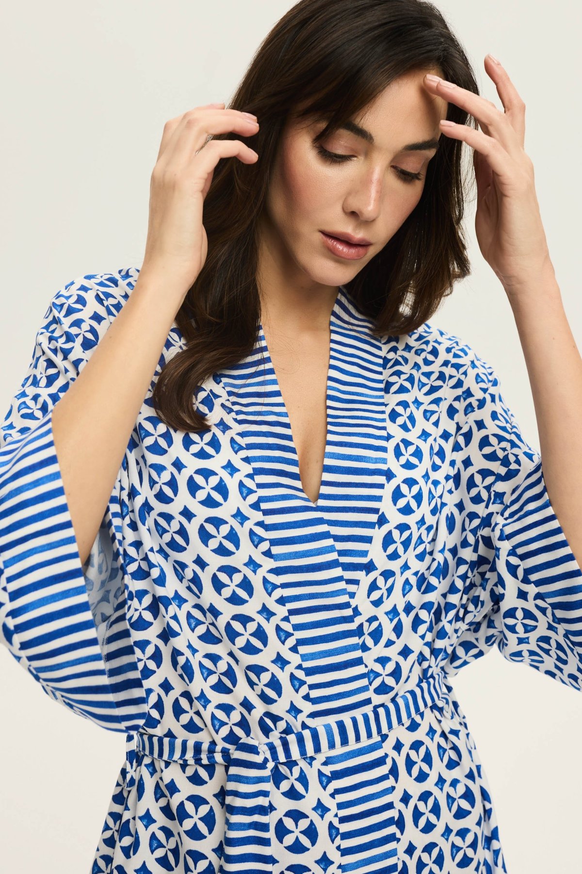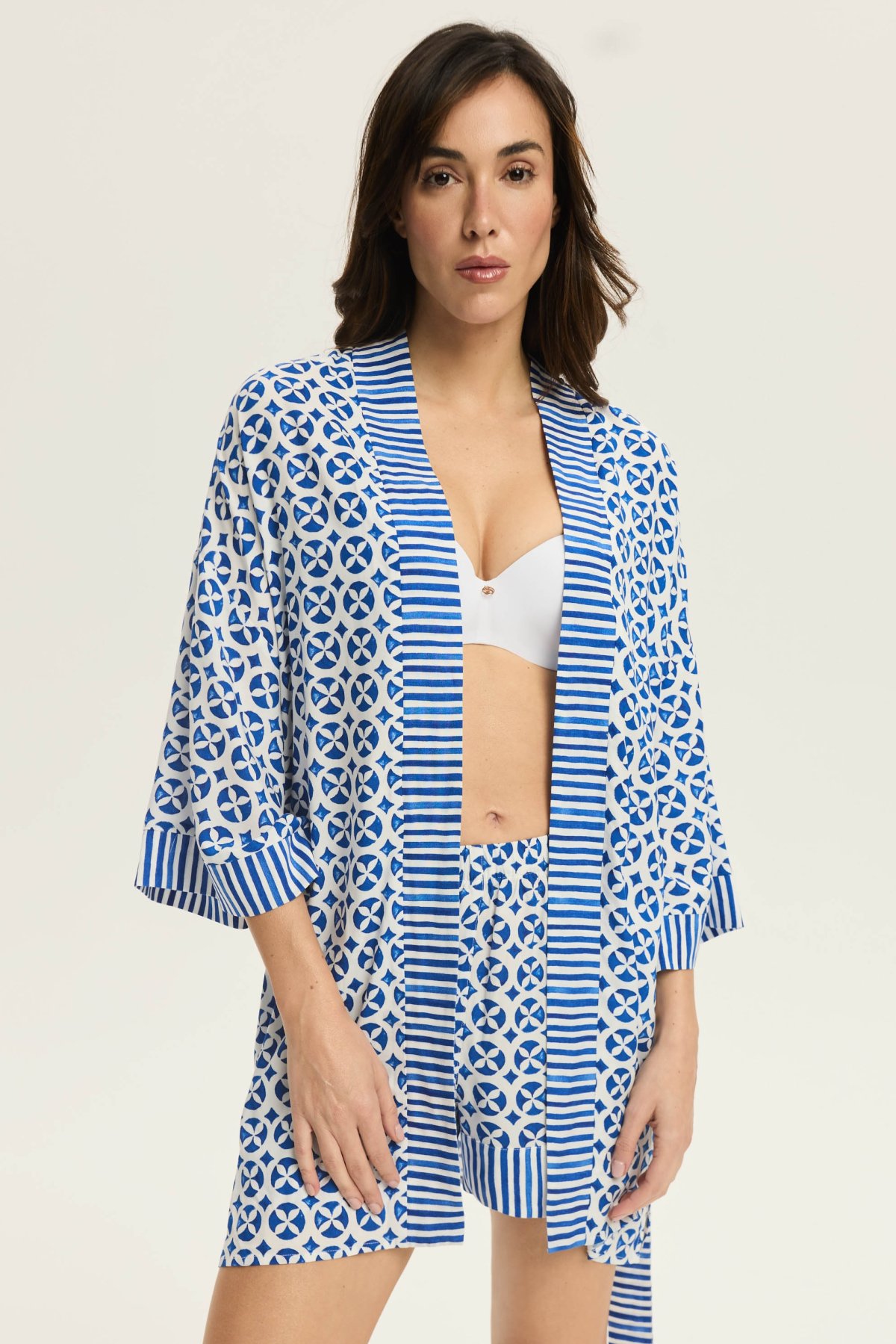 Dámský župan Rekha vyniká svým elegantním a zároveň uvolněným stylem. Kombinuje svěží, geometrický potisk s klasickým kimono střihem, který lichotí každé postavě. Díky lehké viskóze je župan prodyšný, příjemný na dotek a ideální pro každodenní nošení doma i na dovolené. Kontrastní lemování a ozdobné detaily na rukávech dodávají modelu módní charakter. Pásek v pase umožňuje zvýraznit siluetu, zatímco volné rukávy zajišťují maximální komfort pohybu. Župan Rekha se skvěle hodí jako stylový přehoz nebo doplněk k pyžamu či letnímu topu. Elegantní, praktický a s nádechem exotiky – ideální pro ženy, které si potrpí na pohodlí i styl.