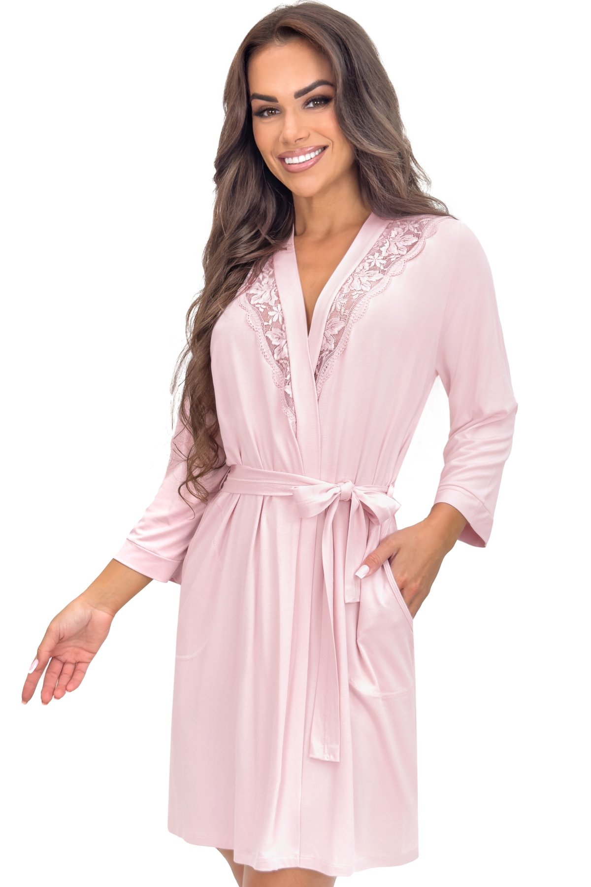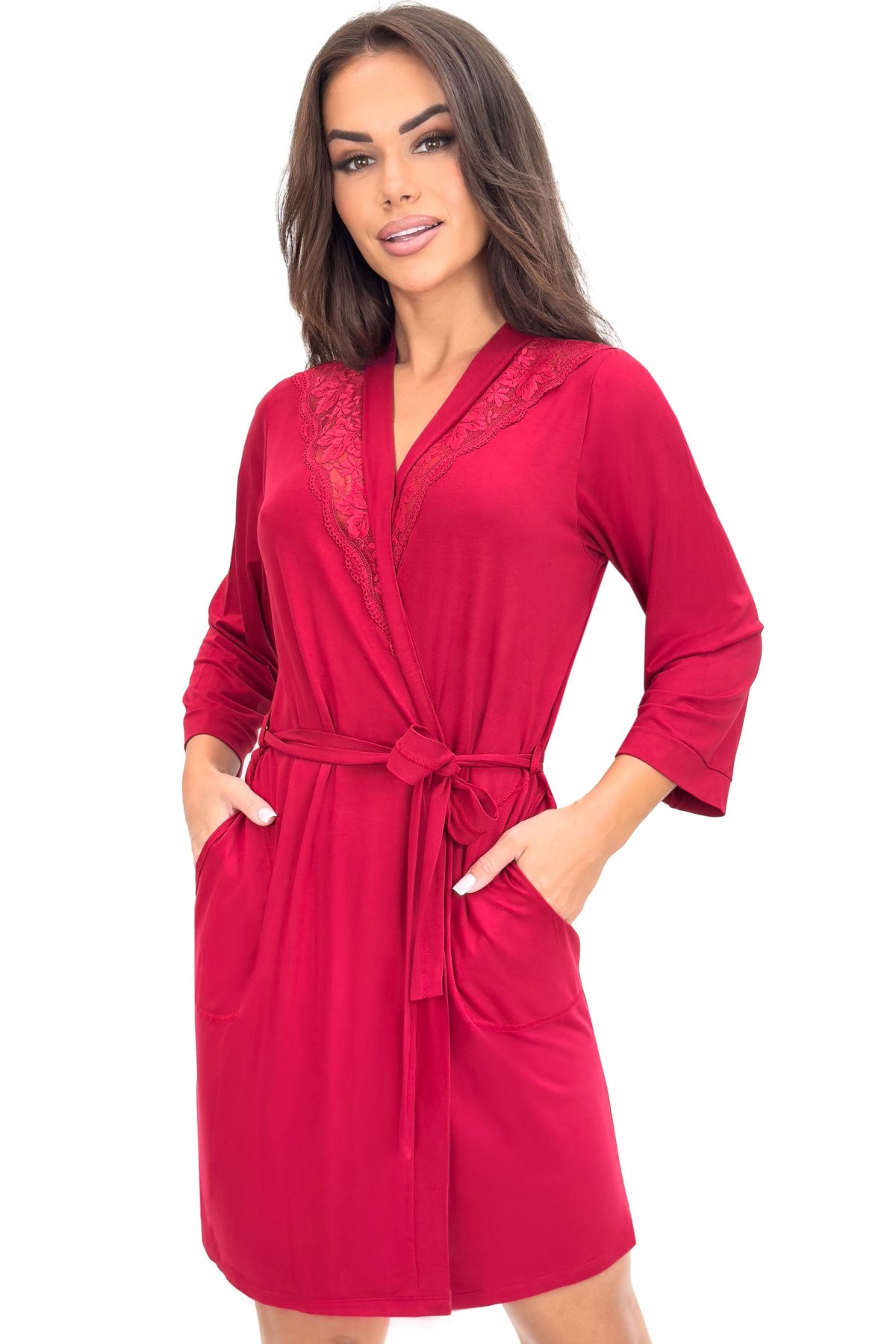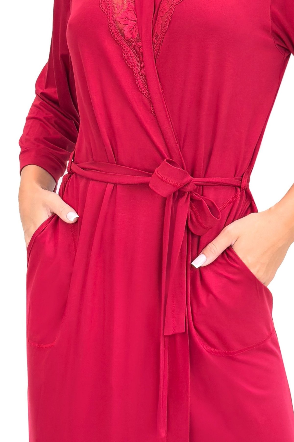 Dámský župan Sonia spojuje eleganci, jemnost a maximální komfort. Vyrobený z měkké, splývavé viskózy, krásně se přizpůsobí postavě a příjemně se nosí po celý den. Krajkové zdobení v oblasti výstřihu dodává modelu romantický a luxusní charakter, zavazování v pase umožňuje zvýraznit ženské tvary. Rukávy v praktické délce zajišťují volnost pohybu, díky čemuž je župan ideální jak pro domácí relaxaci, tak jako elegantní doplněk k noční košilce. Precizní zpracování a kvalitní výroba zaručují dlouhou životnost i dokonalý vzhled každého detailu.