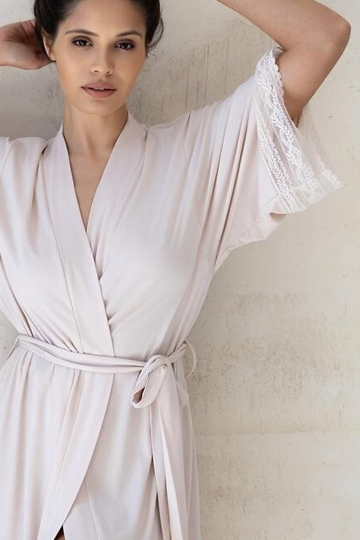 Rukávy zdobené jemnou krajkou dodávají modelu ženský detail, aniž by působil těžce. Pásek na zavázání v pase umožňuje snadné přizpůsobení postavě a jemně zvýrazní siluetu. Materiál tvoří 92 % modal a 8 % elastan. Modelka měří 168 cm a má na sobě velikost S.