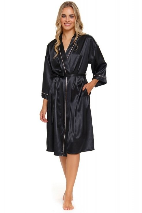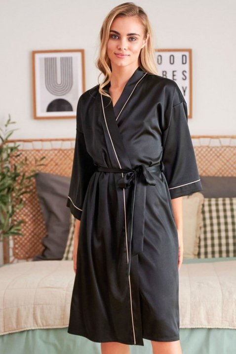 Má kimonový střih, délku pod kolena, zdobený je kontrastním lemováním. Rukávy jsou široké, s 3/4 délkou. Nechybí ani prostorné kapsy a opasek k zavazování v pase.
