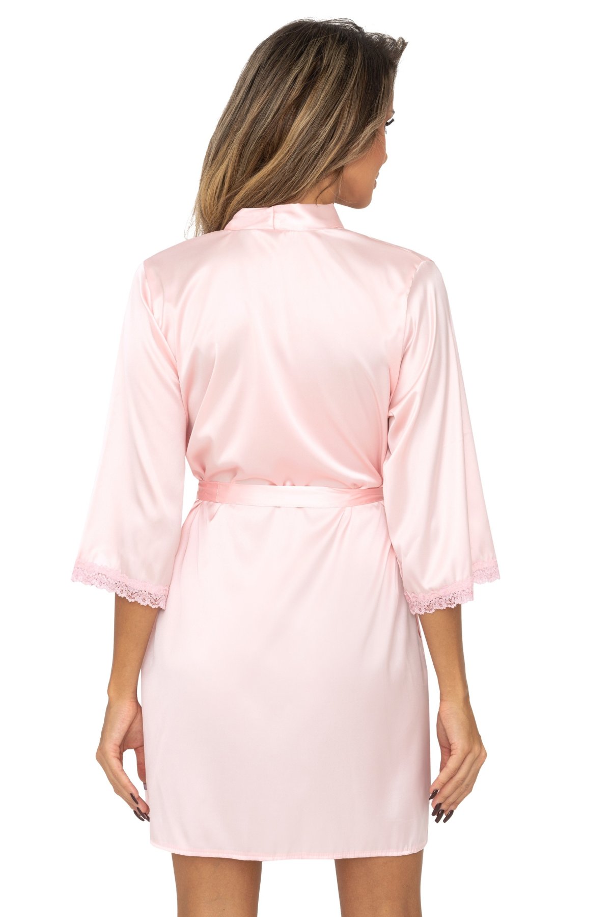 Saténový župan Tiffani působí elegantně a čistě, zároveň zůstává pohodlný pro domácí nošení. Zavinovací střih s páskem umožňuje snadné přizpůsobení v pase a podtrhuje ženskou siluetu. Rukávy 3/4 délky zdobí jemná krajka, která celku dodává lehčí a výraznější detail. Praktické kapsy zpříjemňují každodenní nošení a délka do poloviny stehen udržuje model vzdušný a pohodlný. Atraktivní kousek určený ženám, které se chtějí cítit výjimečně.