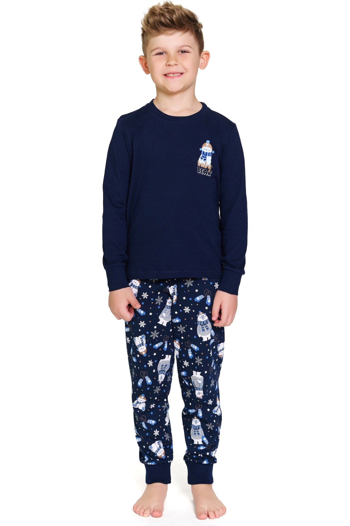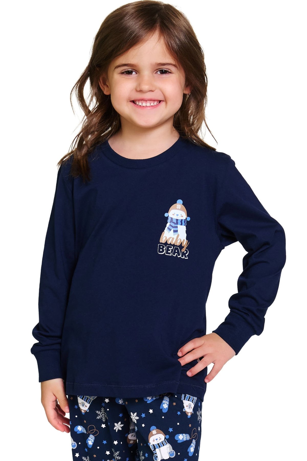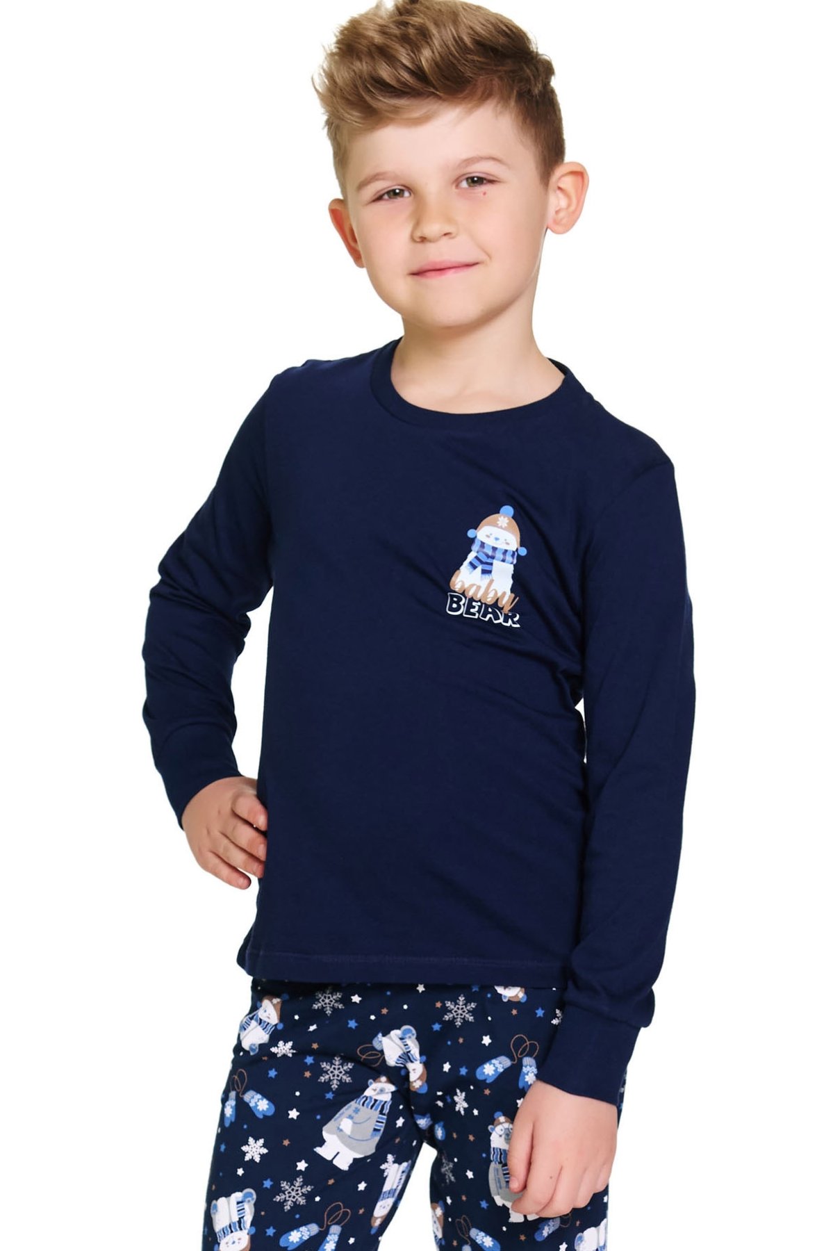 Hřejivé dětské pyžamo v tmavě modré barvě si děti zamilují na první obléknutí. Horní díl zdobí roztomilý potisk medvídka s nápisem „Baby Bear“, který navozuje útulnou atmosféru. Kalhoty s vesele zimním potiskem doplňují celý komplet a dodávají mu hravý charakter.
