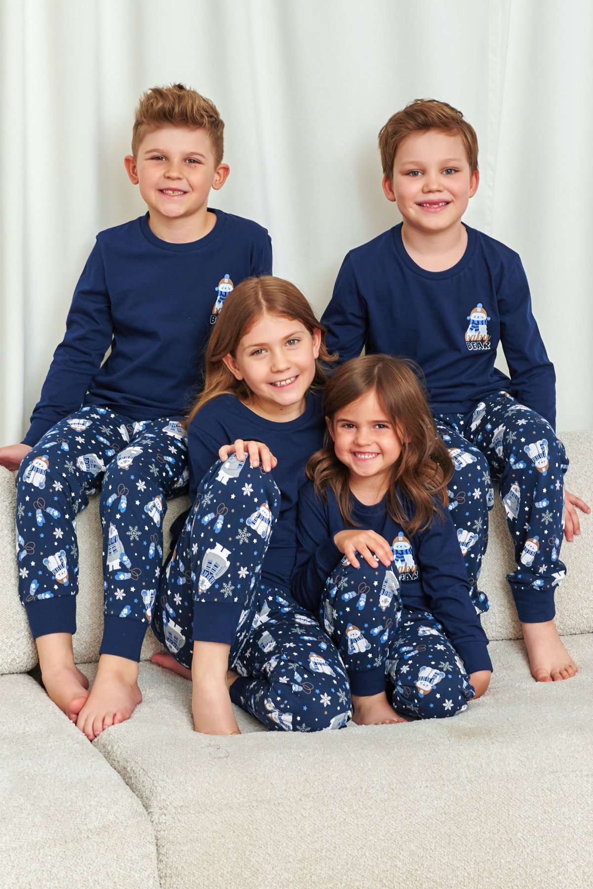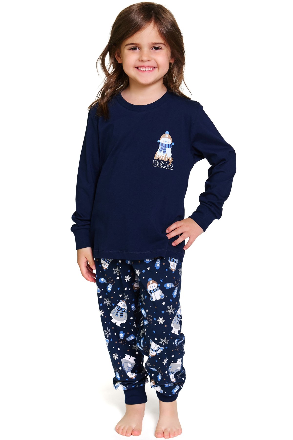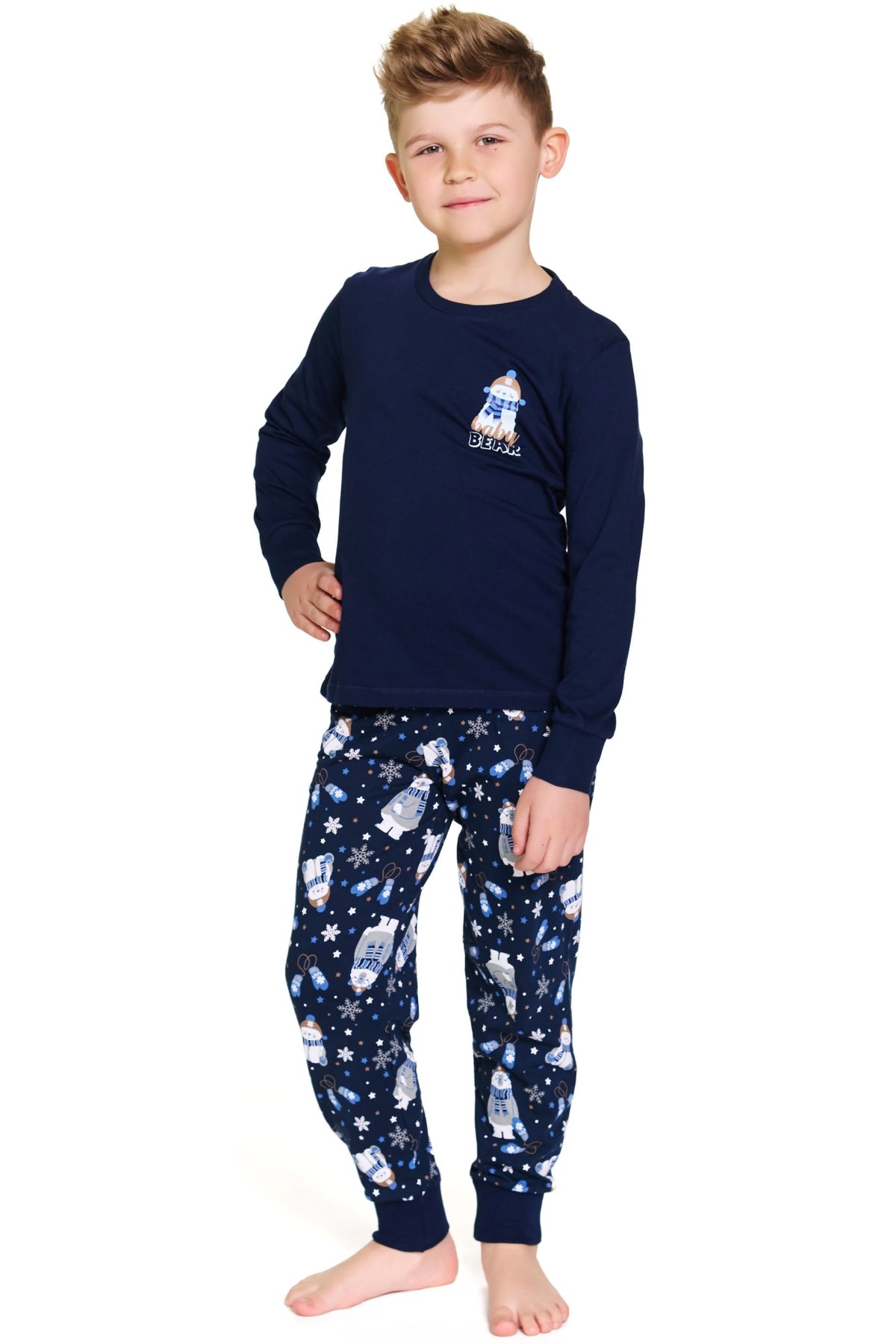 Hřejivé dětské pyžamo v tmavě modré barvě si děti zamilují na první obléknutí. Horní díl zdobí roztomilý potisk medvídka s nápisem „Baby Bear“, který navozuje útulnou atmosféru. Kalhoty s vesele zimním potiskem doplňují celý komplet a dodávají mu hravý charakter.